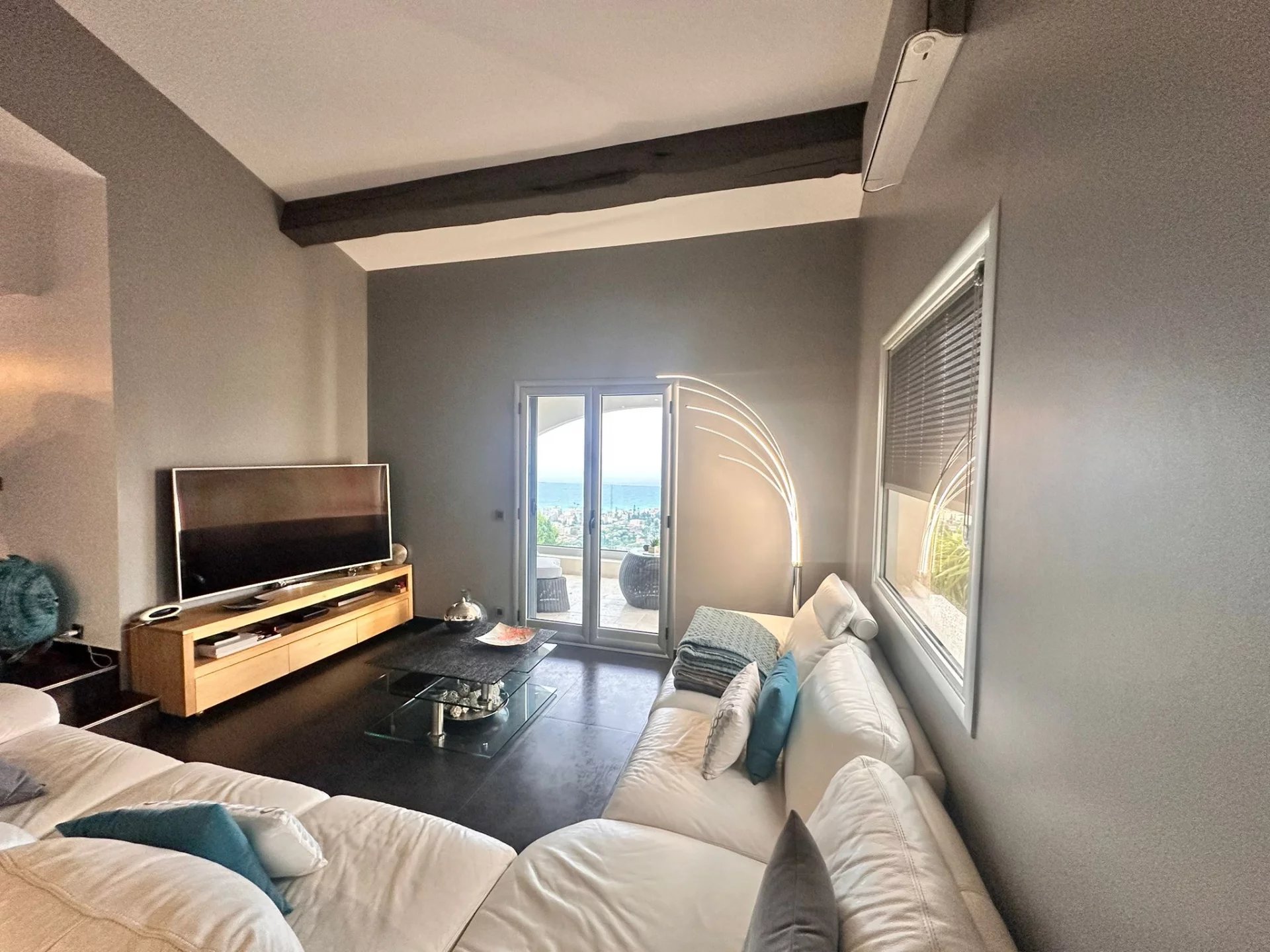 The villa offers sweeping views of Cap Martin and the sparkling sea. Interiors include a grand living room, dining area, fully equipped open-plan kitchen, 4 bedrooms, 3 bathrooms, and a mezzanine.