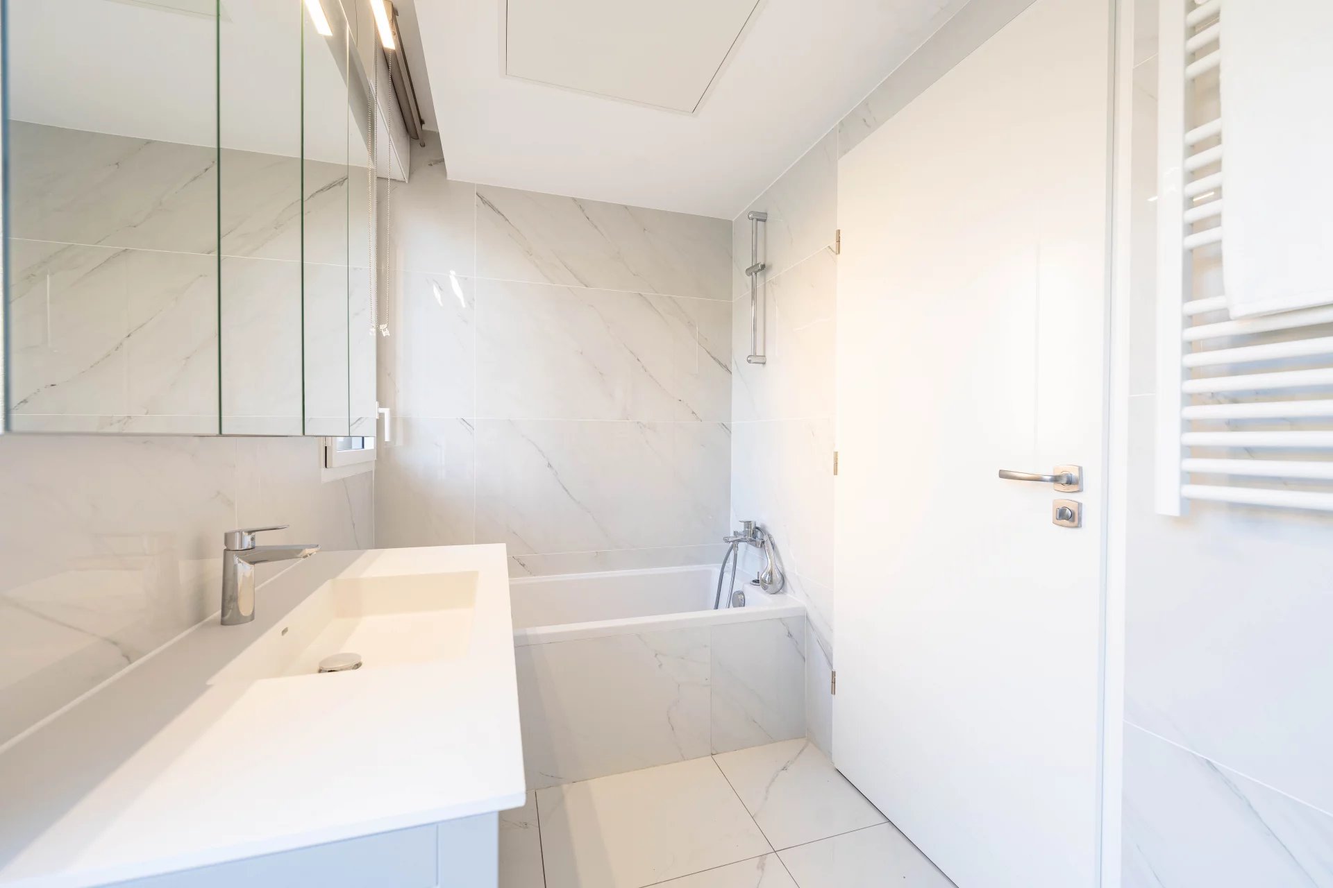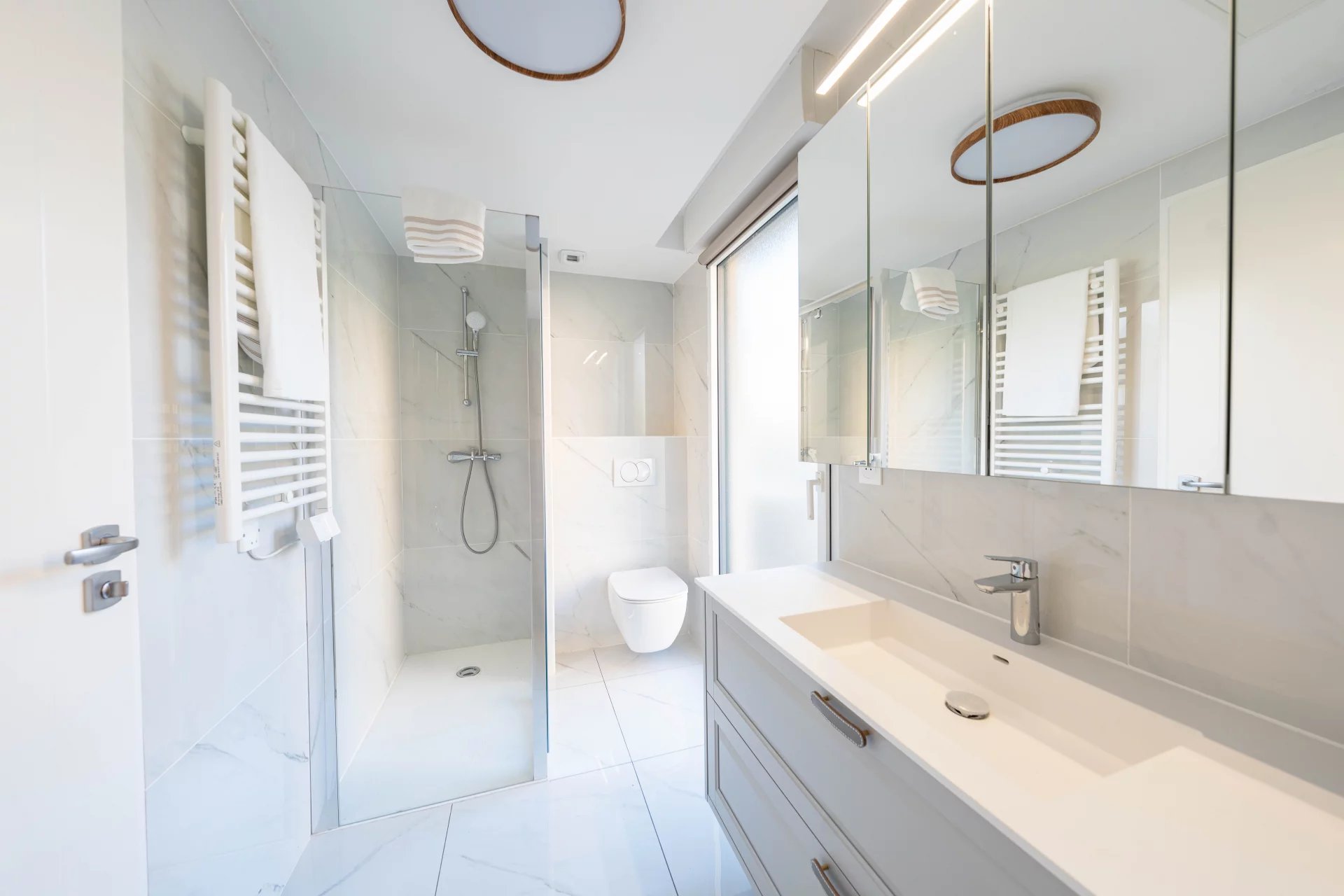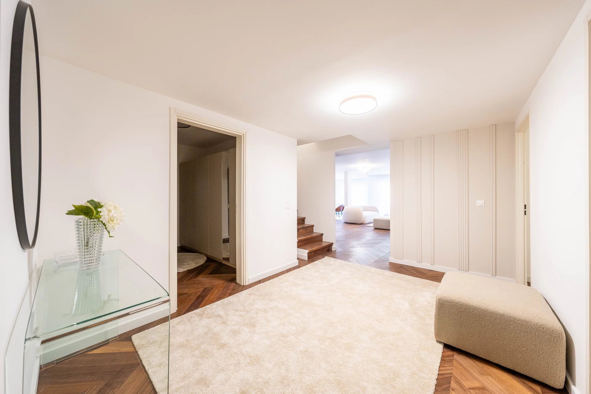On the garden level, an elegant entrance hall leads to a vast, light-flooded living-dining room, extended by a modern, fully-equipped kitchen, designed to integrate perfectly with this refined living space. This level also includes three spacious bedrooms, each with its own en-suite shower room and toilet, as well as three dressing rooms, a utility room and a hallway optimizing circulation. A second independent entrance completes the comfort of this property.