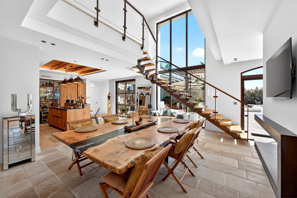 The interior spaces are defined by their scale and fluidity. The main reception areas include a spacious living room and dining area, designed for both everyday living and entertaining, with a natural connection to the outdoor environment.