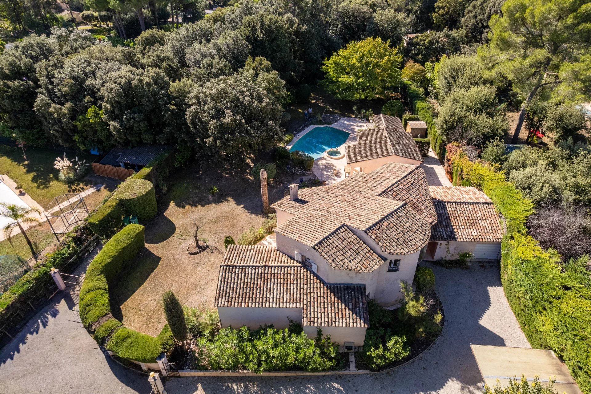 On the ground floor, an entrance hall opens onto a living room with a fireplace and high ceilings, a dining room, and a separate equipped kitchen with a laundry room, all opening onto a spacious terrace with access to the pool area. This level also includes an office, a guest toilet, and a bedroom with a dressing room and bathroom.