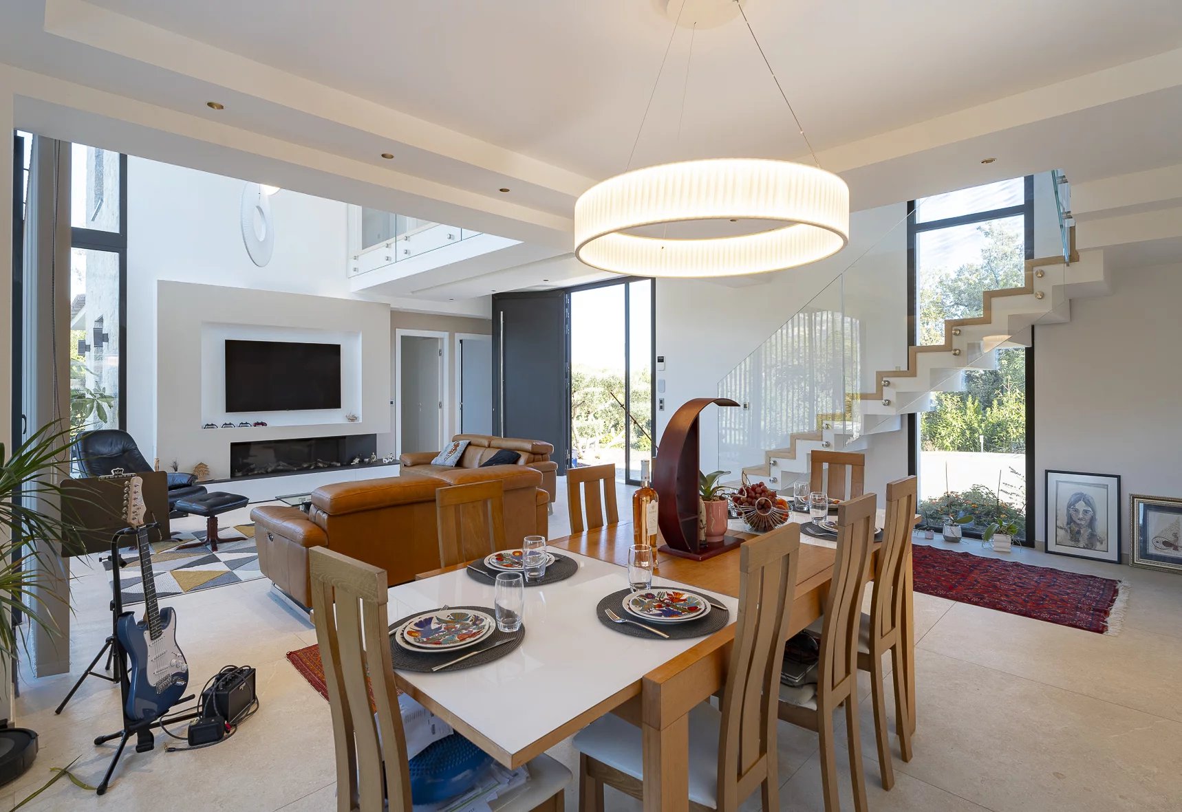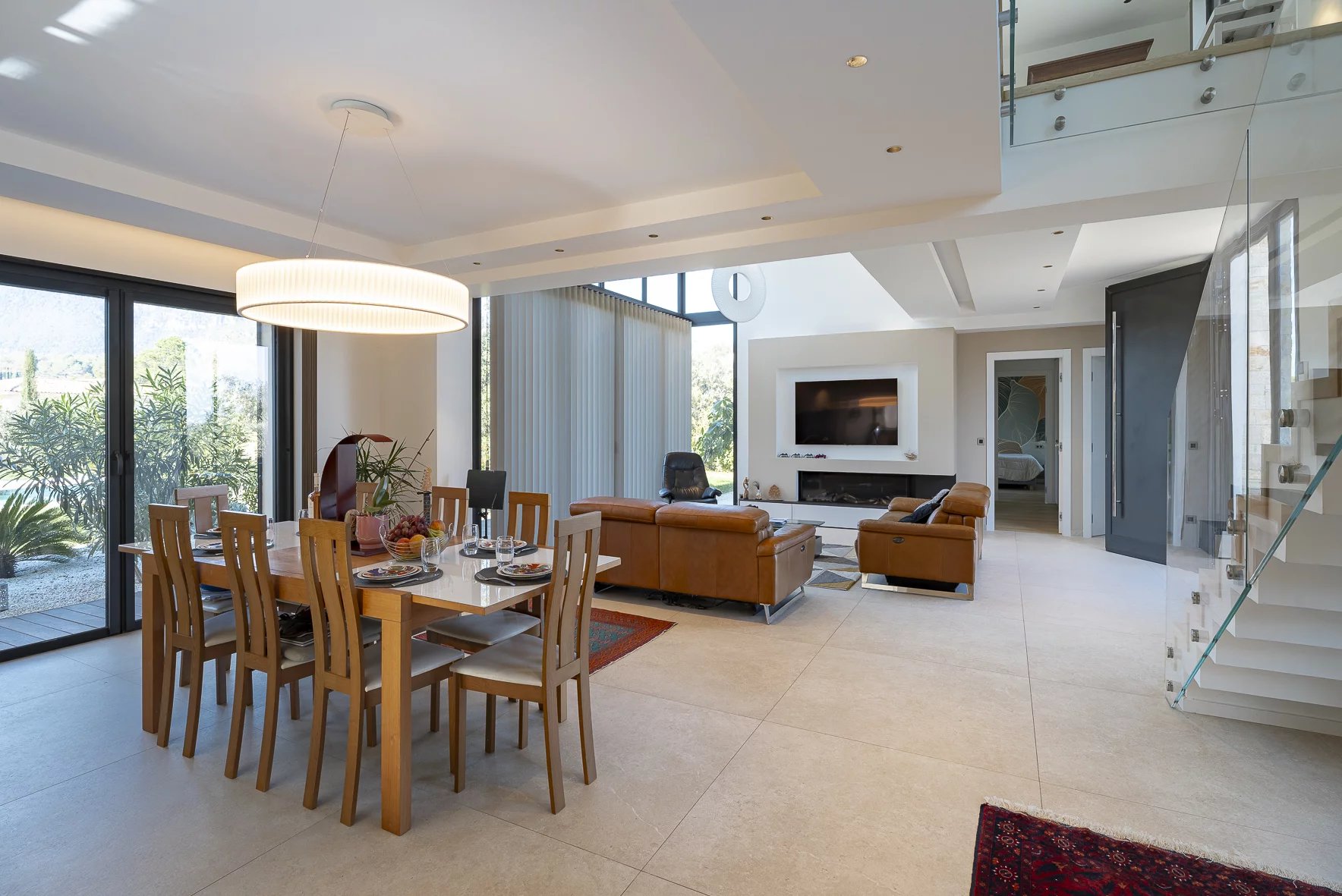 A spacious living and dining room opens onto the outdoors, complemented by an open-plan fitted kitchen. This level also includes one bedroom, one bathroom, a laundry room, and a guest WC.