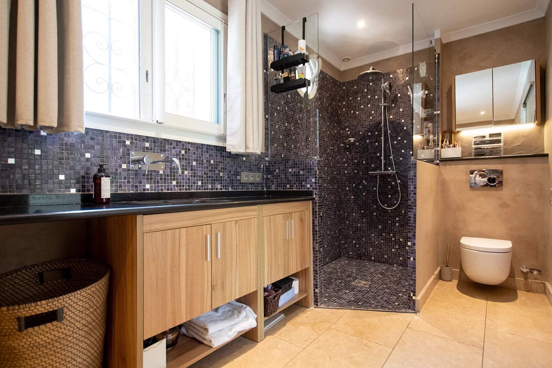 The upper floor features two more bedrooms and a shared shower room, with access to a Tropezian terrace, providing a perfect spot to enjoy the Mediterranean climate. All bedrooms have air conditioning.