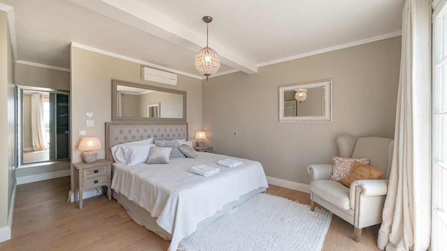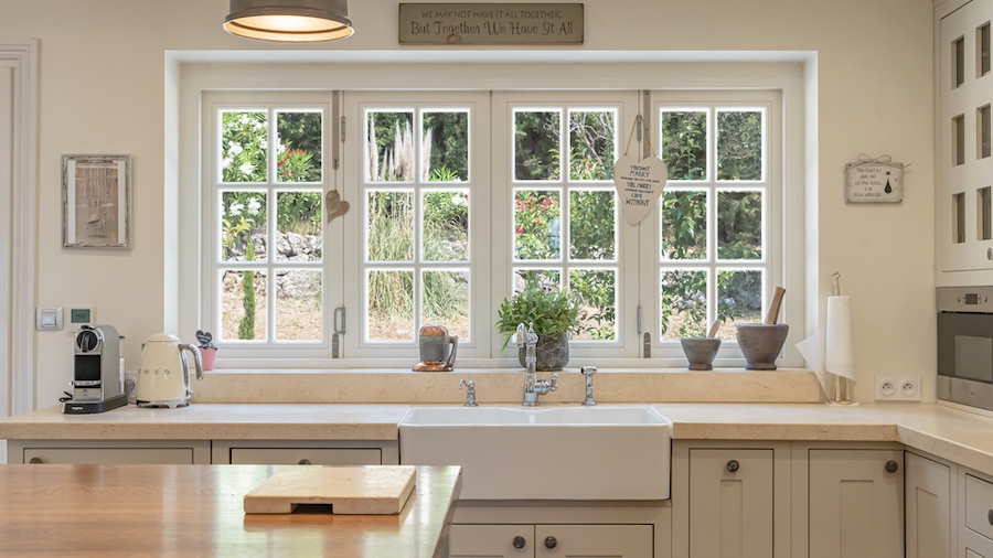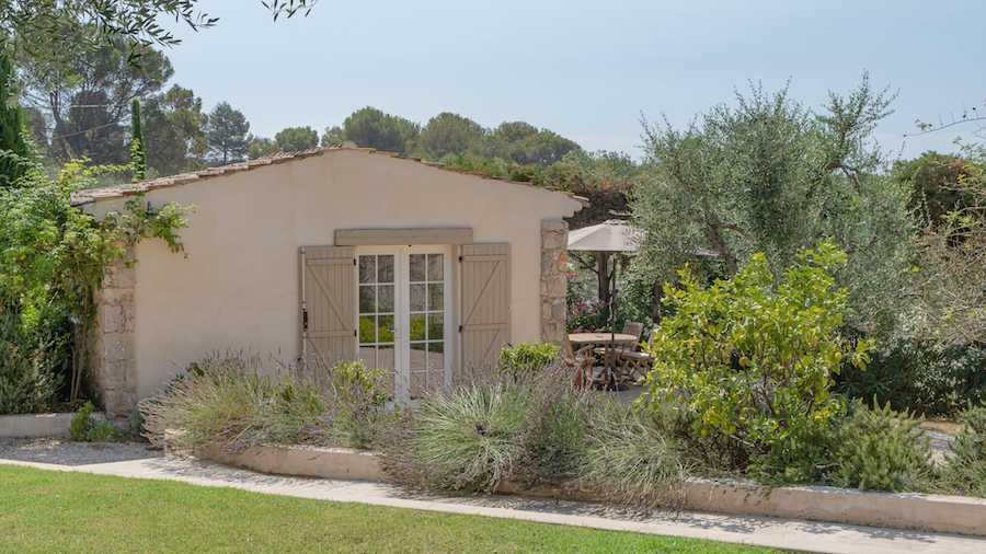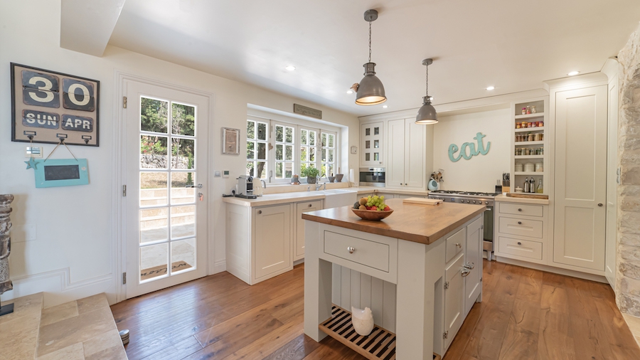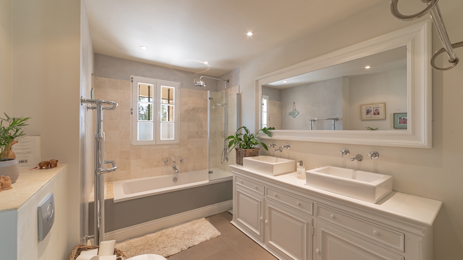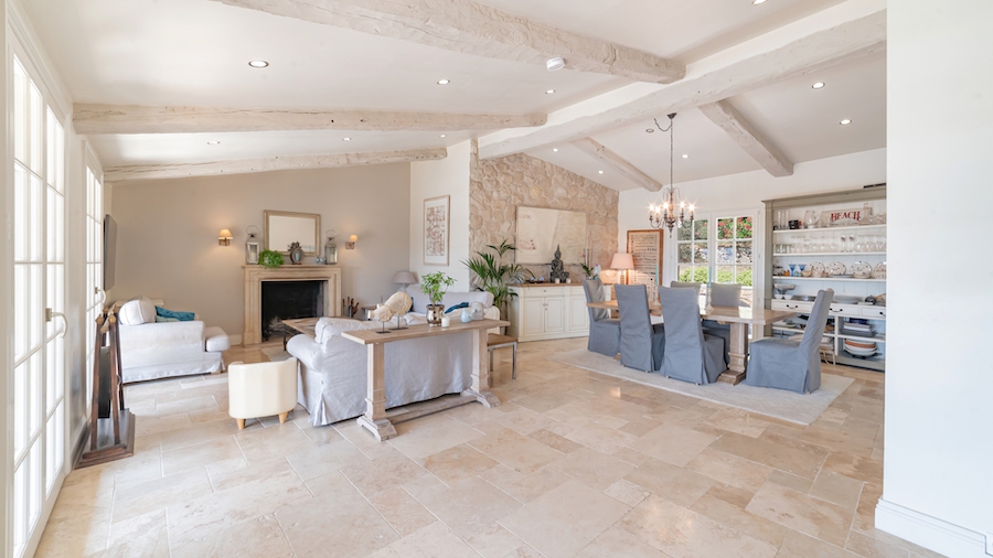 Perfect for large families or as a second home, the main house features four bedrooms, including two with ensuite bathrooms, plus a family bathroom. The open-plan kitchen, living, and dining areas flow seamlessly onto a south-facing dining terrace overlooking the pool. In winter, the living room is warmed by a large, crackling fireplace, while in summer, you can relax in the charming stone pool house, complete with a fitted kitchen and ceiling fan.