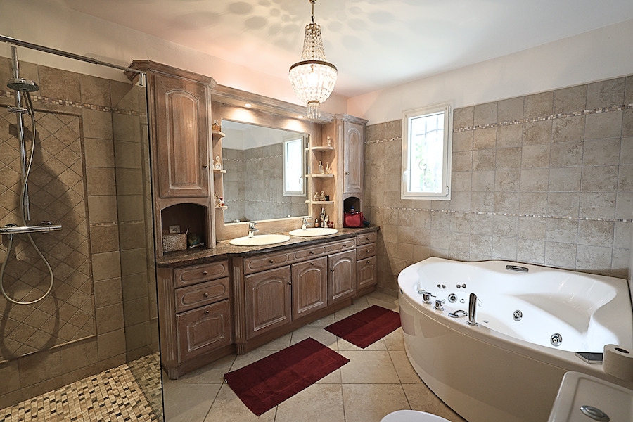 The main part, on one level, seduces with its vast, light-filled living room of over 100 m2 with an open kitchen, opening directly onto the pool area. It offers 5 large bedrooms, including 3 superb suites of approximately 30 m2 each.