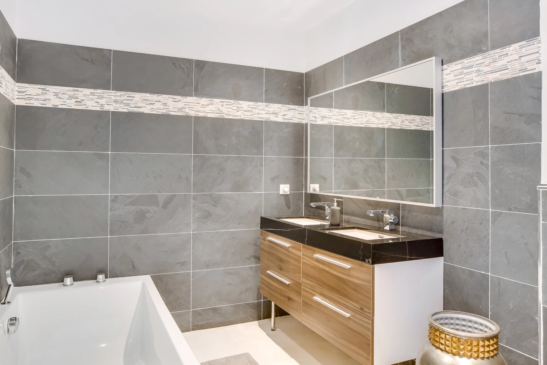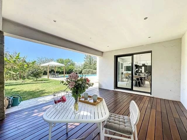 Beautiful flat landscaped land of 2,416 m2 with salt water pool, terraces, pergola. A double garage and several parking spaces.