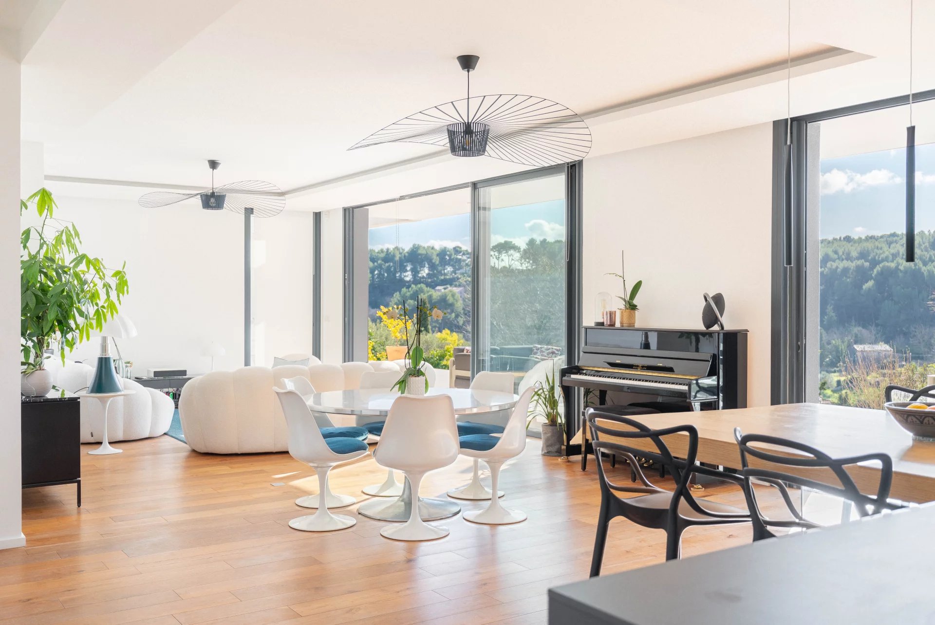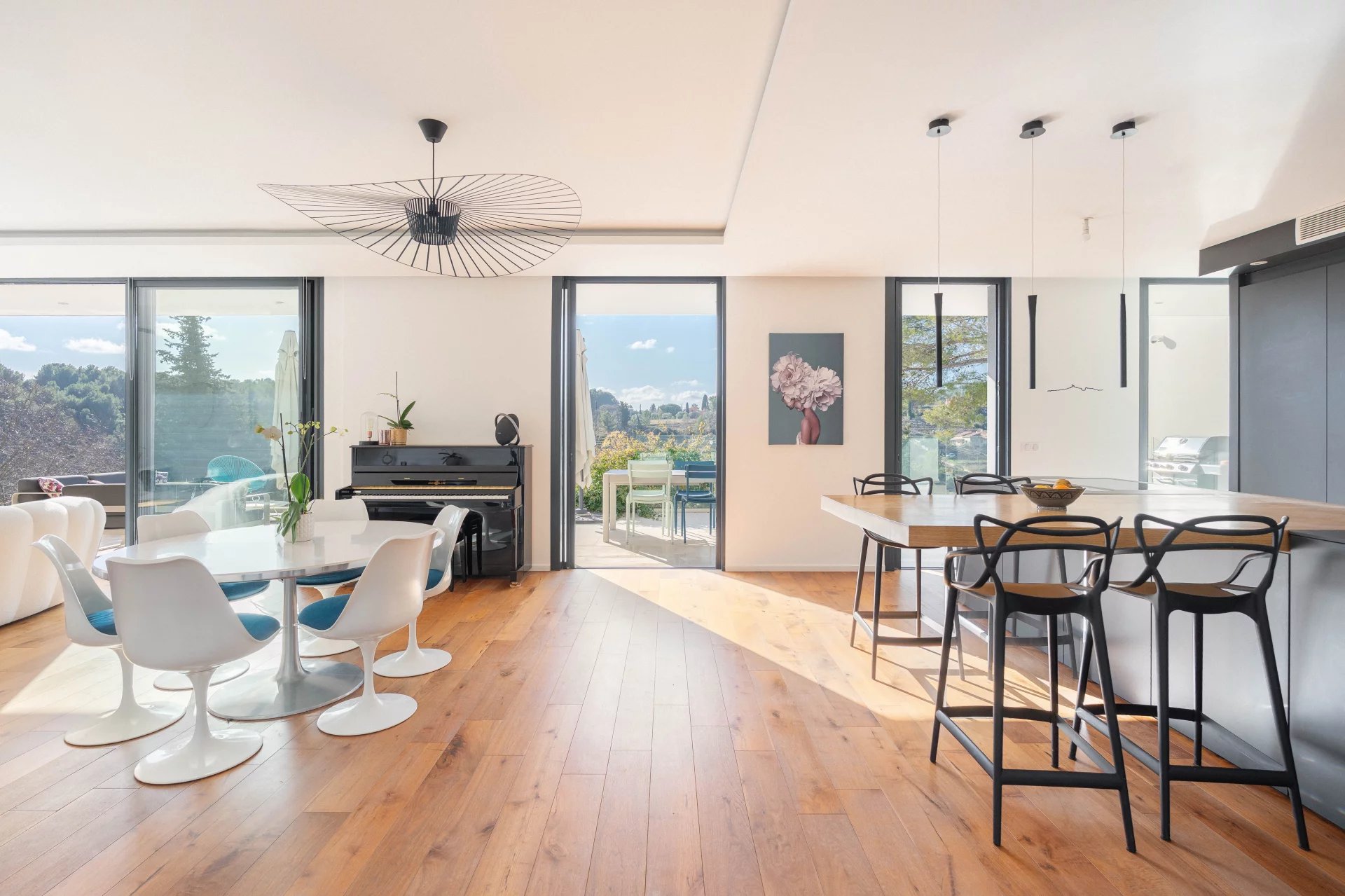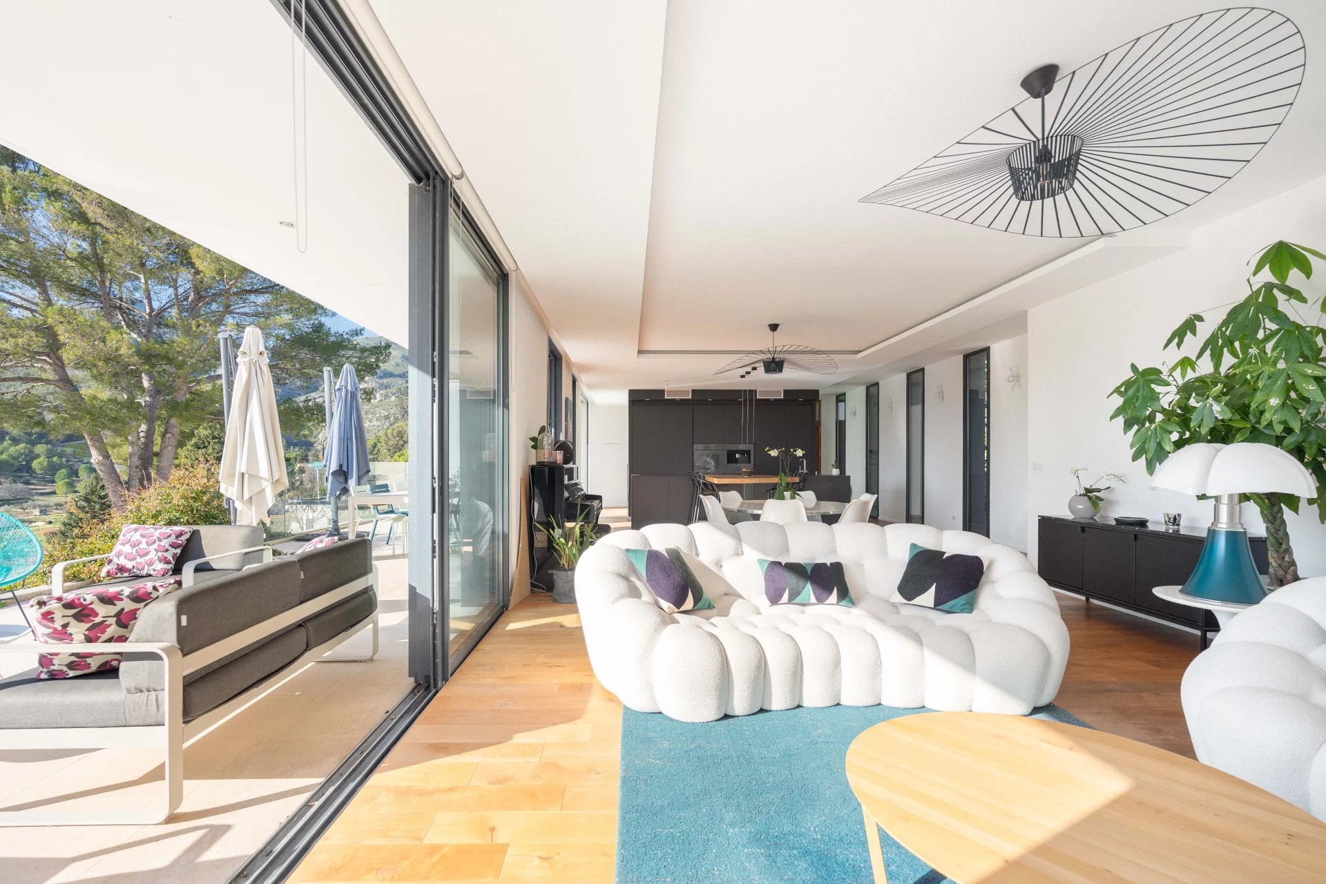 The property boasts exceptional panoramic views of the Garlaban, a living landscape that changes with the seasons. From the moment you enter, the house impresses with generous volumes and abundant natural light. The elegant and welcoming living area opens fully onto a large terrace through beautiful sliding glass doors, seamlessly connecting indoor and outdoor living.
