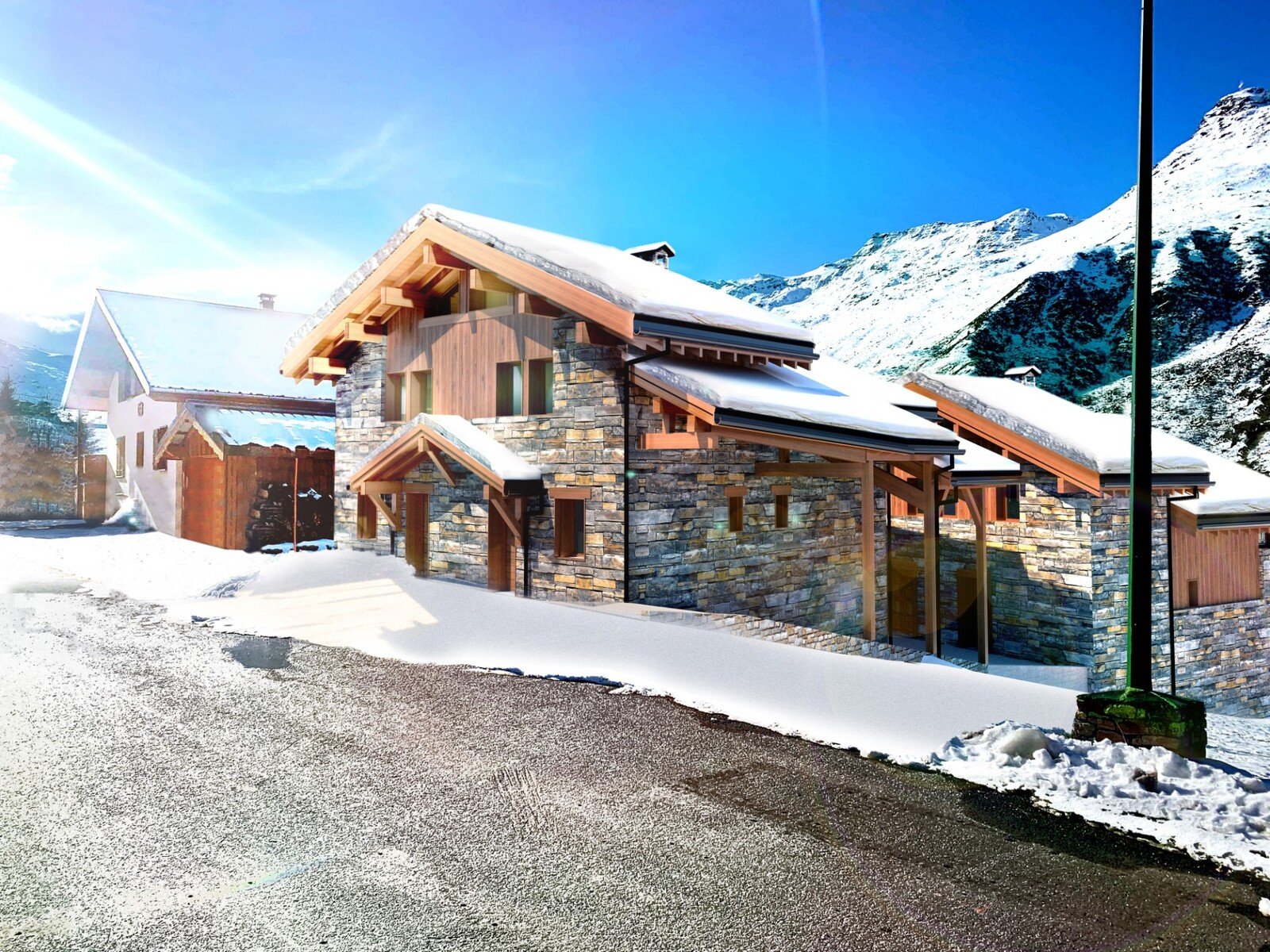 In the charming village of Lavassaix, just 2 km from the resort of Les Menuires, a new development is due to open at the end of 2025. Part of a complex of 4 chalets, this half-chalet with a total surface area of 107.14 sq.m. on 3 levels offers 3 en suite bedrooms, a 37.14 sq.m. living area with open-plan kitchen, living room and a 15 sq.m. west-facing terrace.