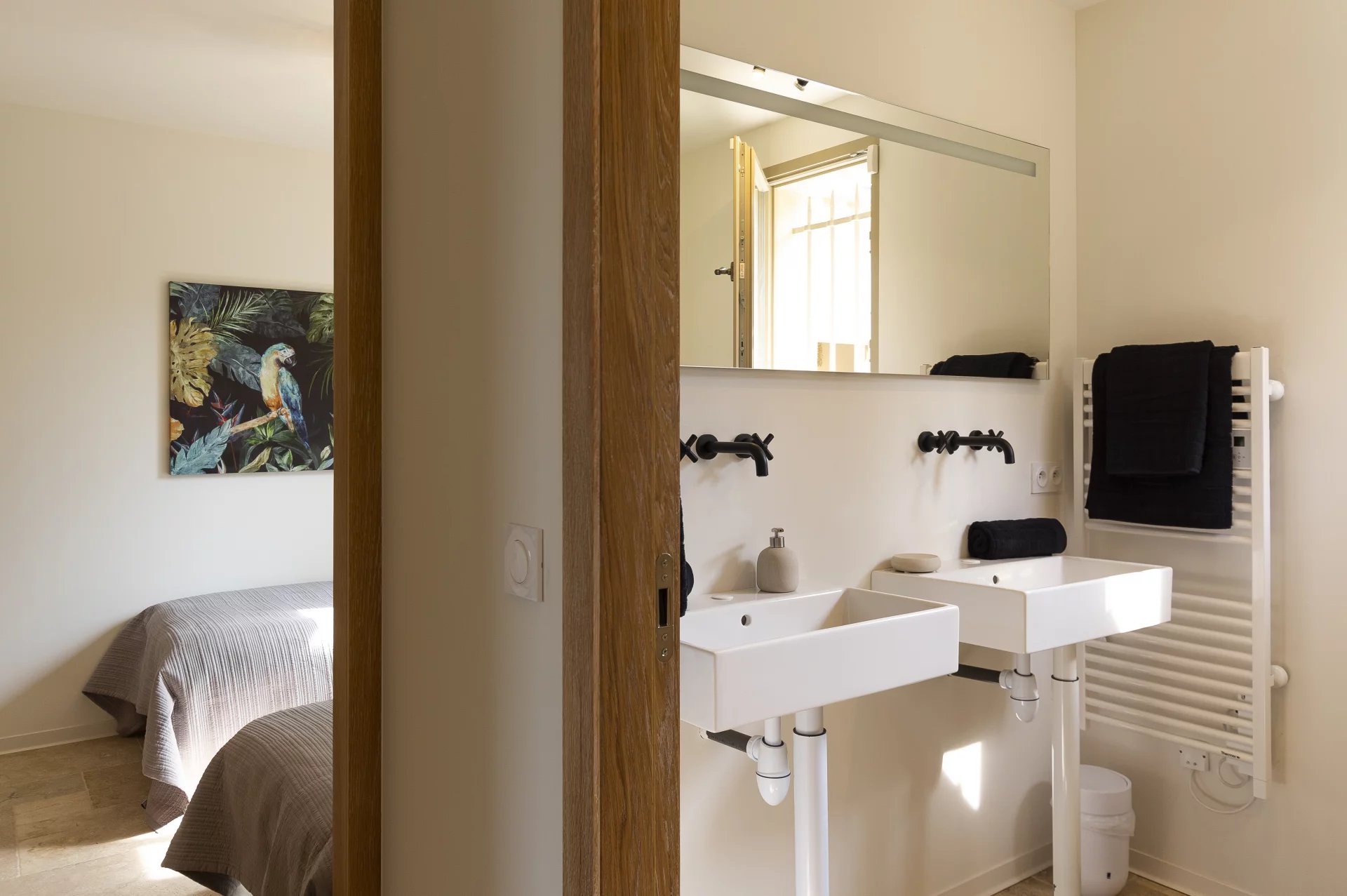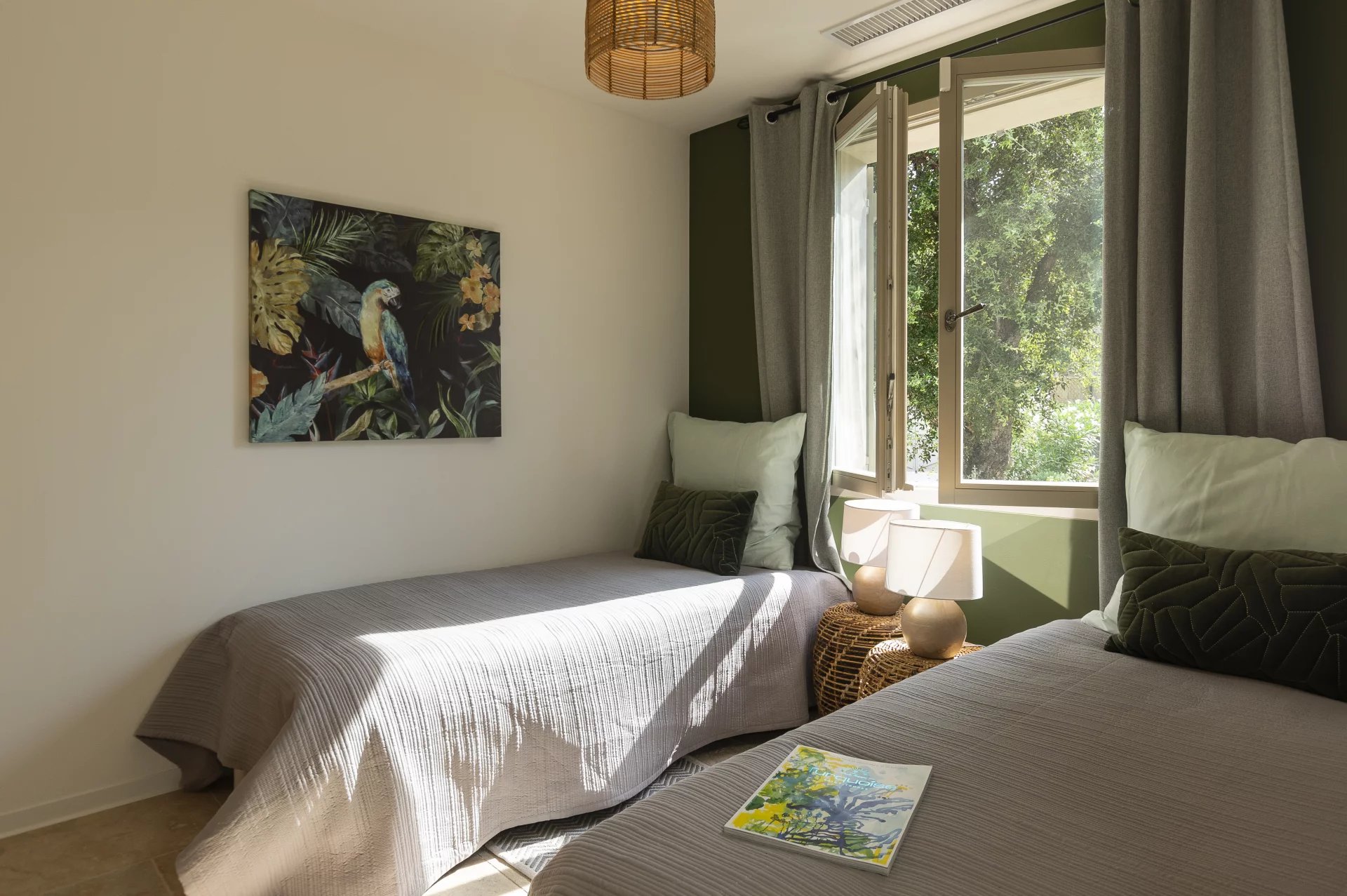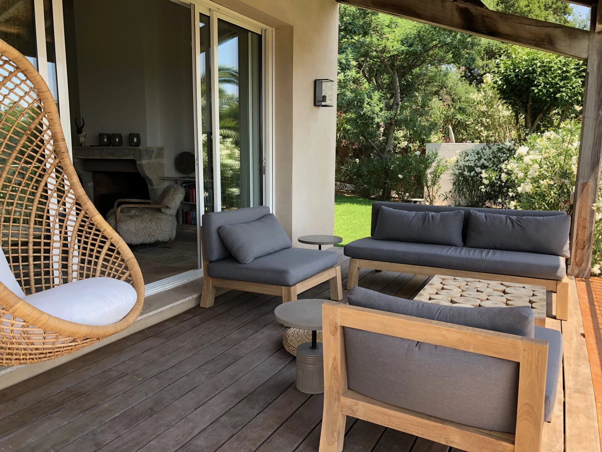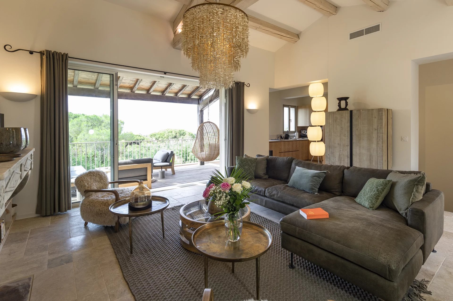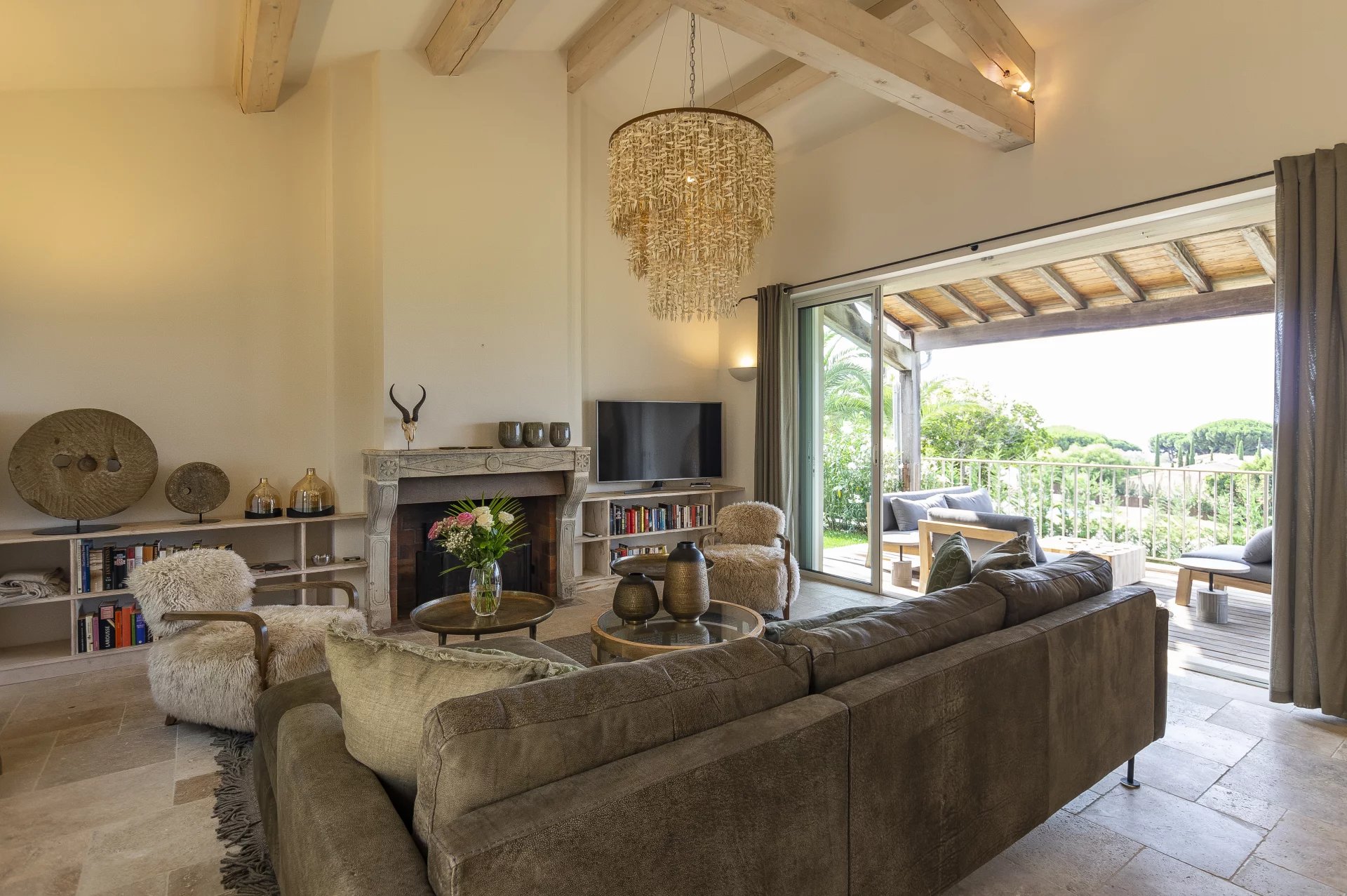 Spread over two levels, the villa can accommodate up to 10 guests, making it an ideal choice for families with children. Inside, the cosy living room features a fireplace, and there is a sunny terrace as well as a dining area in the loggia with breathtaking views of the Château de la Messardiere. The open-plan kitchen is fully equipped, while the 5 bedrooms and 3 bathrooms provide all the comfort you need.