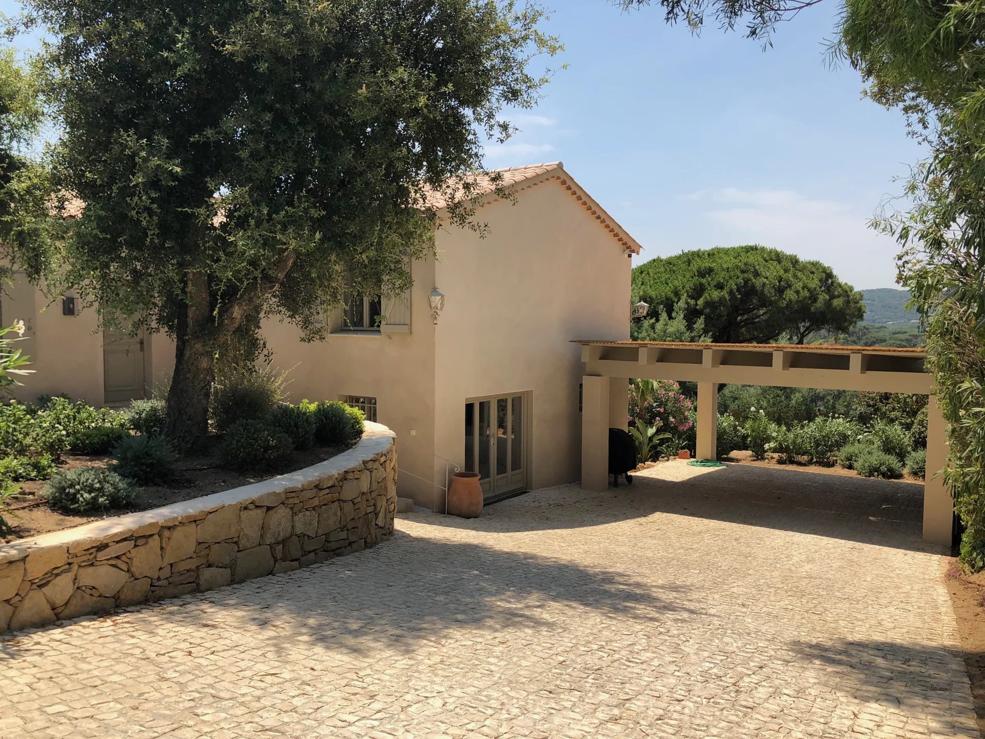 Recently renovated, this stunning 160 m2 villa with 5 bedrooms is the perfect place to relax. Surrounded by lush greenery, the property offers an exclusive and intimate atmosphere, where charm and tranquility blend harmoniously. Its ideal location between the village and the beaches offers a spectacular 270-degree panoramic view of the surrounding hills and the Chateau de la Messardiere. The villa boasts a charming garden and a heated pool, completely secluded from view, ensuring total privacy.
