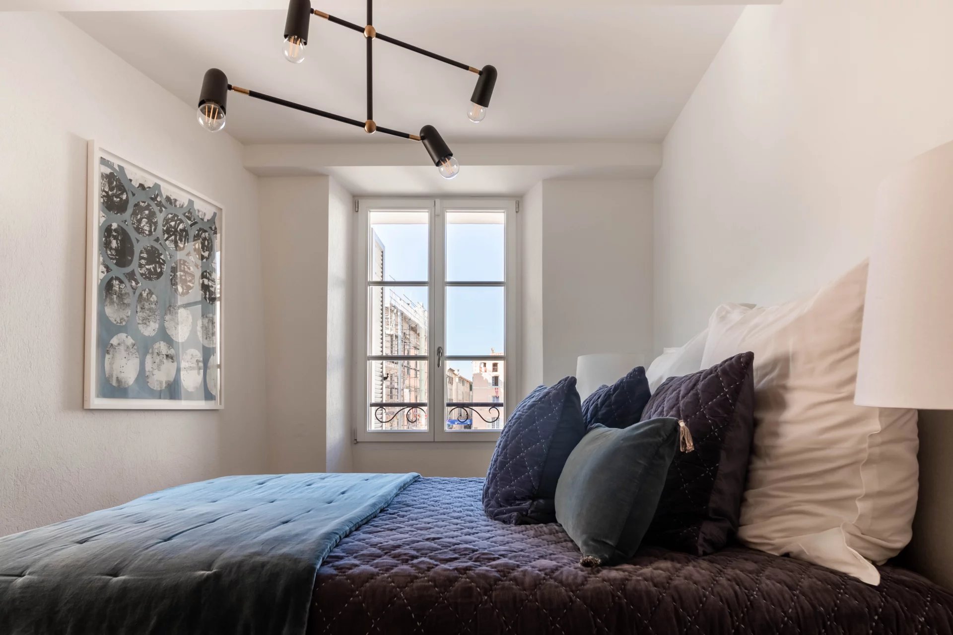 The three upper levels feature three luxurious apartments, each with a living room and fully equipped kitchen overlooking the port, two bedrooms with views of the town square, and a full bathroom. The third-floor apartment also includes an additional bedroom in a mezzanine.