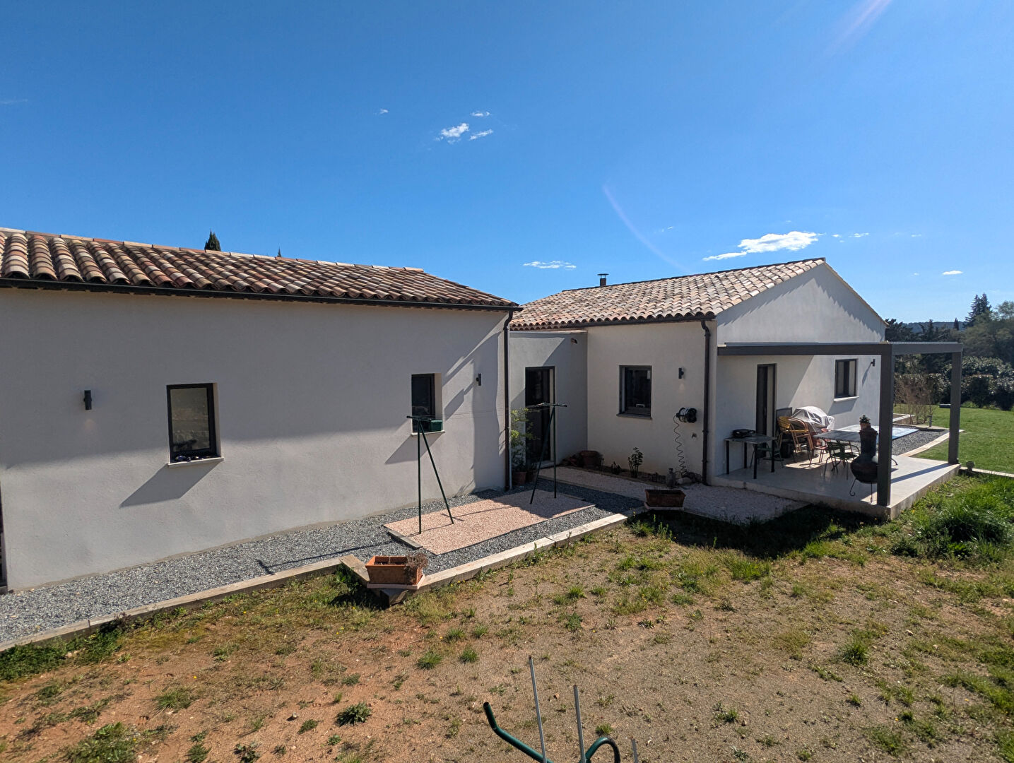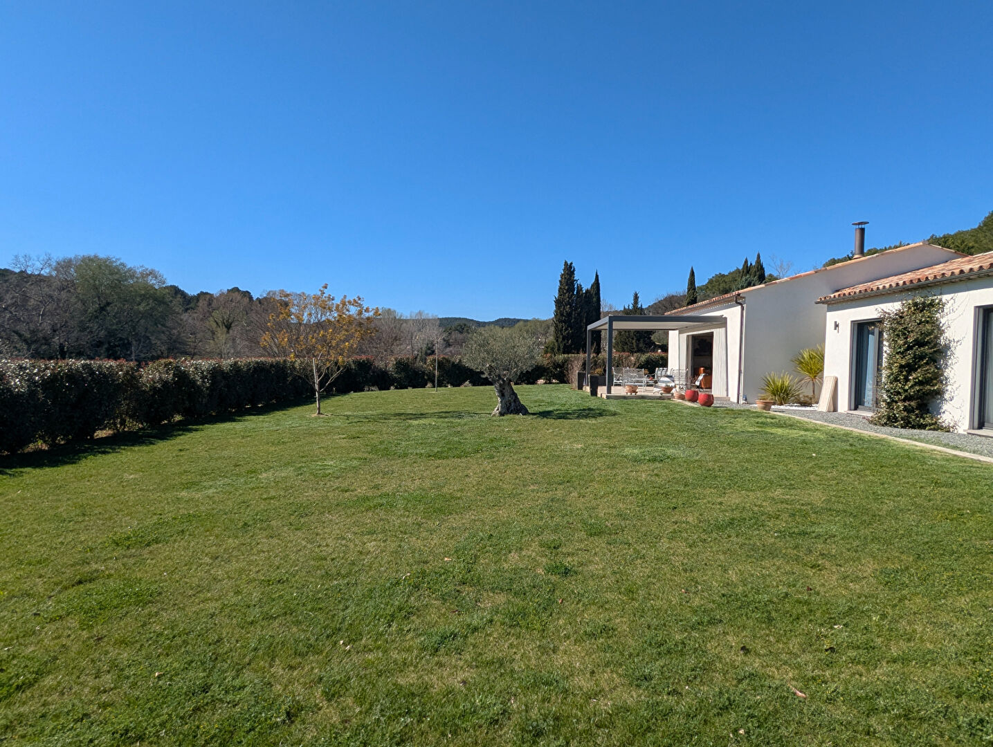 Outside, the property offers two terraces with BIOSSUN bioclimatic pergolas, a 3,697 m2 landscaped plot with the possibility to build a swimming pool, automatic irrigation, water supplied by a private borehole (existing installation for connection to mains water), a robot lawn mower, and connection to the main sewer system.