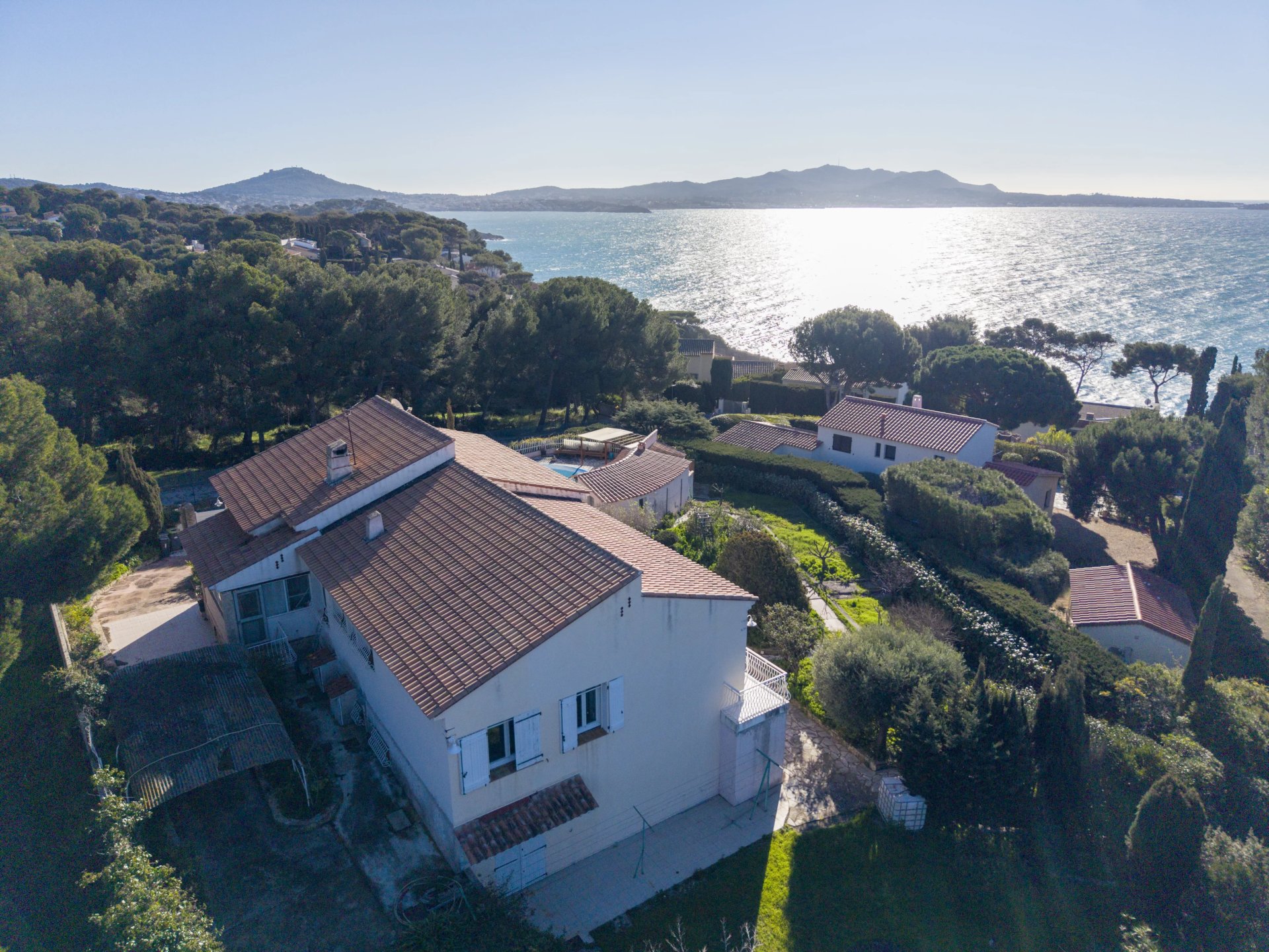 Offering beautiful sea views, the property provides approximately 290 m2 of living space over two levels, set on a flat plot of about 2,000 m2 with a swimming pool.