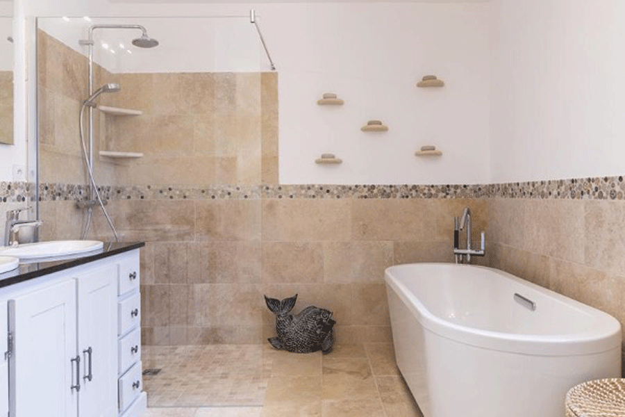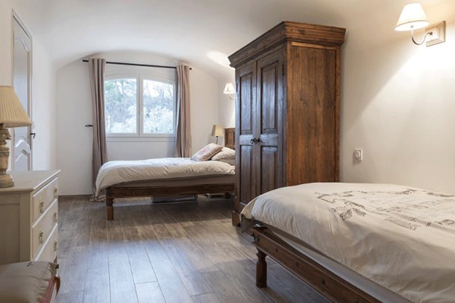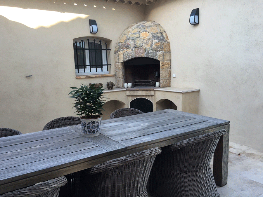 Main house: Ground floor – Porch, entrance hall, bedroom with shower room and separate toilet, fitted American kitchen with breakfast nook, leading to a covered terrace (pergola), living room with fireplace, opening onto a terrace, there is also a second bedroom with bathroom on the ground floor.