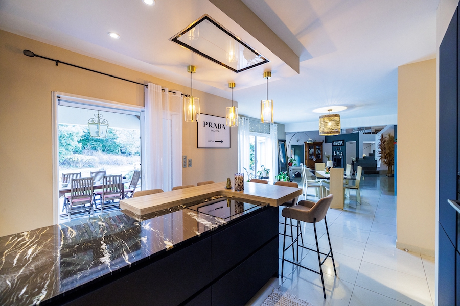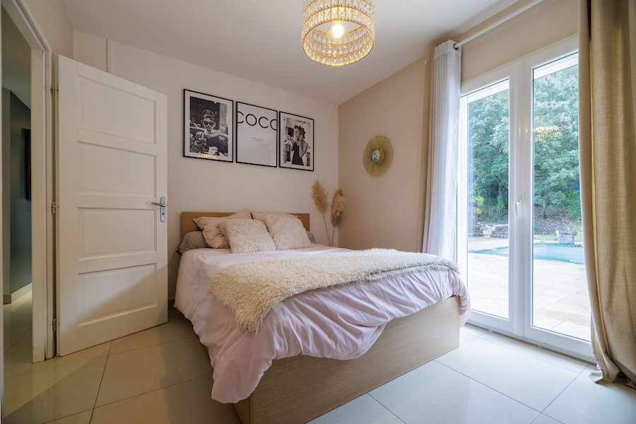 From the moment you enter, the feeling of spaciousness is immediate. The living room impresses with its high ceilings and pervasive natural light. Large windows naturally extend the living space outdoors, offering a soothing view of the garden and swimming pool. The warm and inviting living room is centered around a fireplace, while the fully open-plan American-style kitchen invites you to share moments and entertain in a decidedly contemporary atmosphere. The sleeping area unfolds with balance and comfort. Four bedrooms comprise this level, including two elegant suites, designed as true havens of tranquility. One of them features a fitted dressing room, adding functionality and refinement to everyday life. A separate laundry room completes this space, offering a level of organization particularly appreciated in a family home of this caliber. Overlooking the living area, a mezzanine houses a bright office. It opens onto a secluded sun terrace, perfect for relaxing amidst a pristine natural environment.