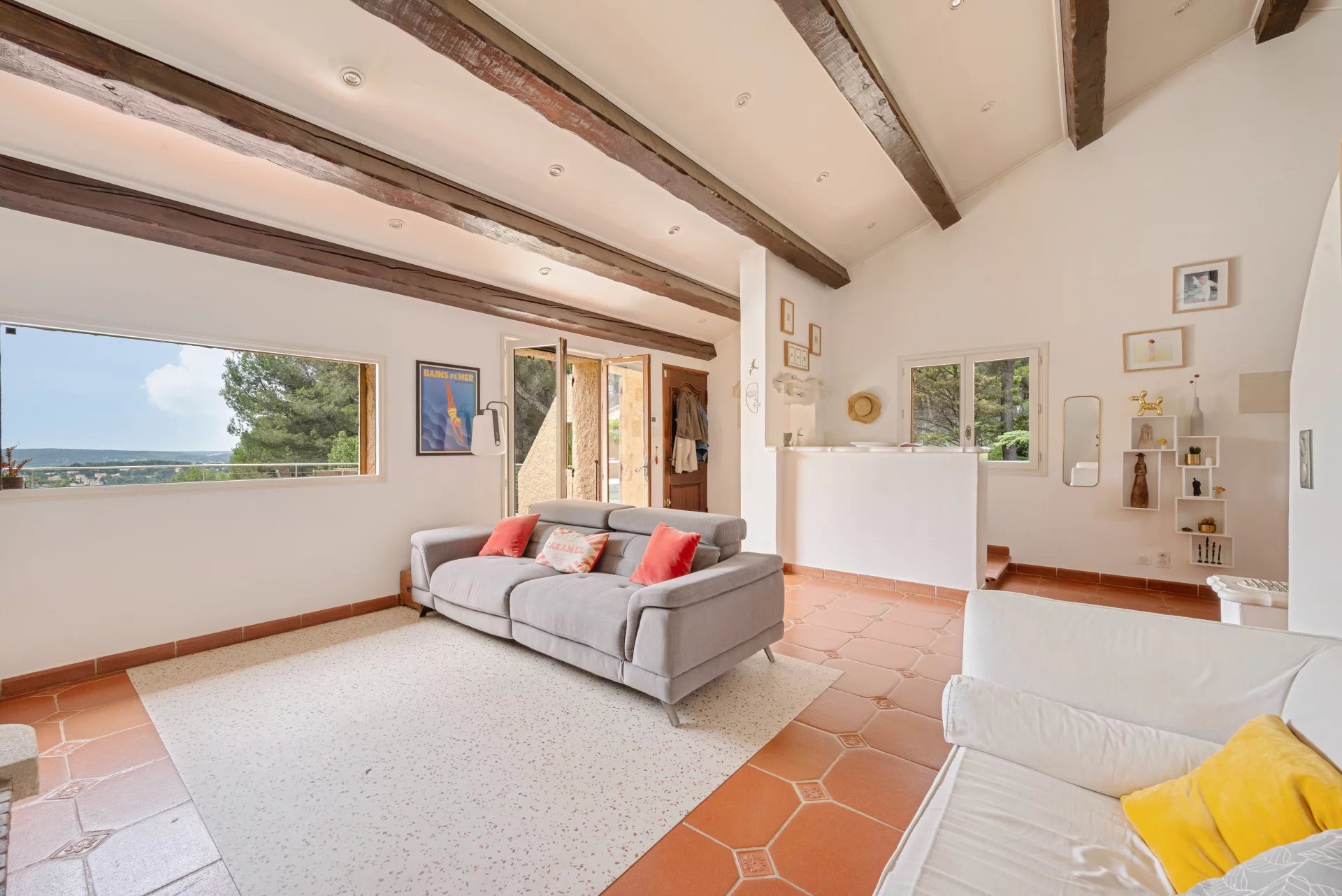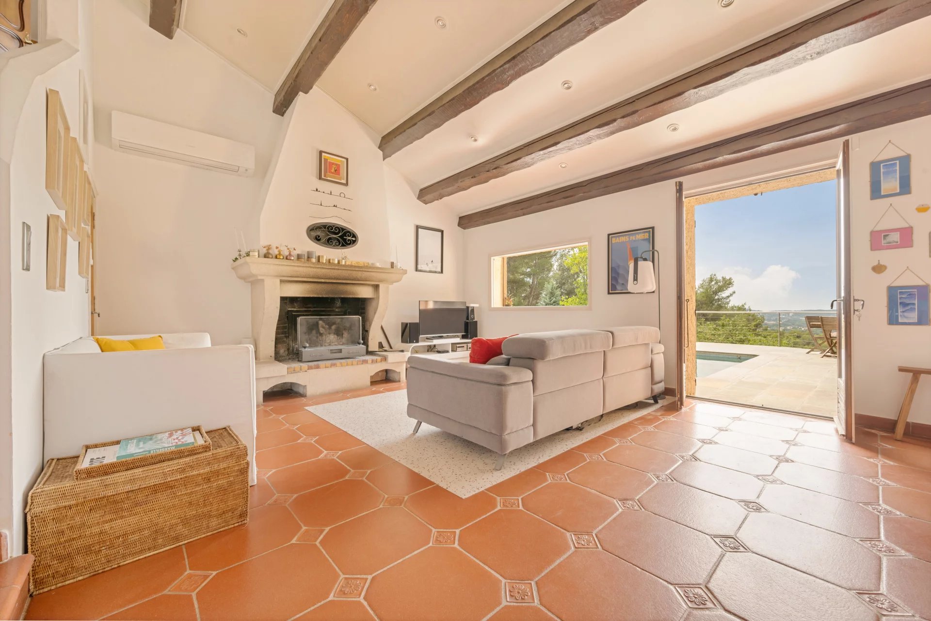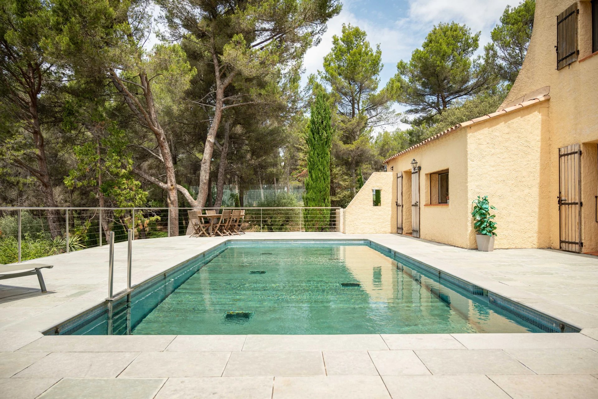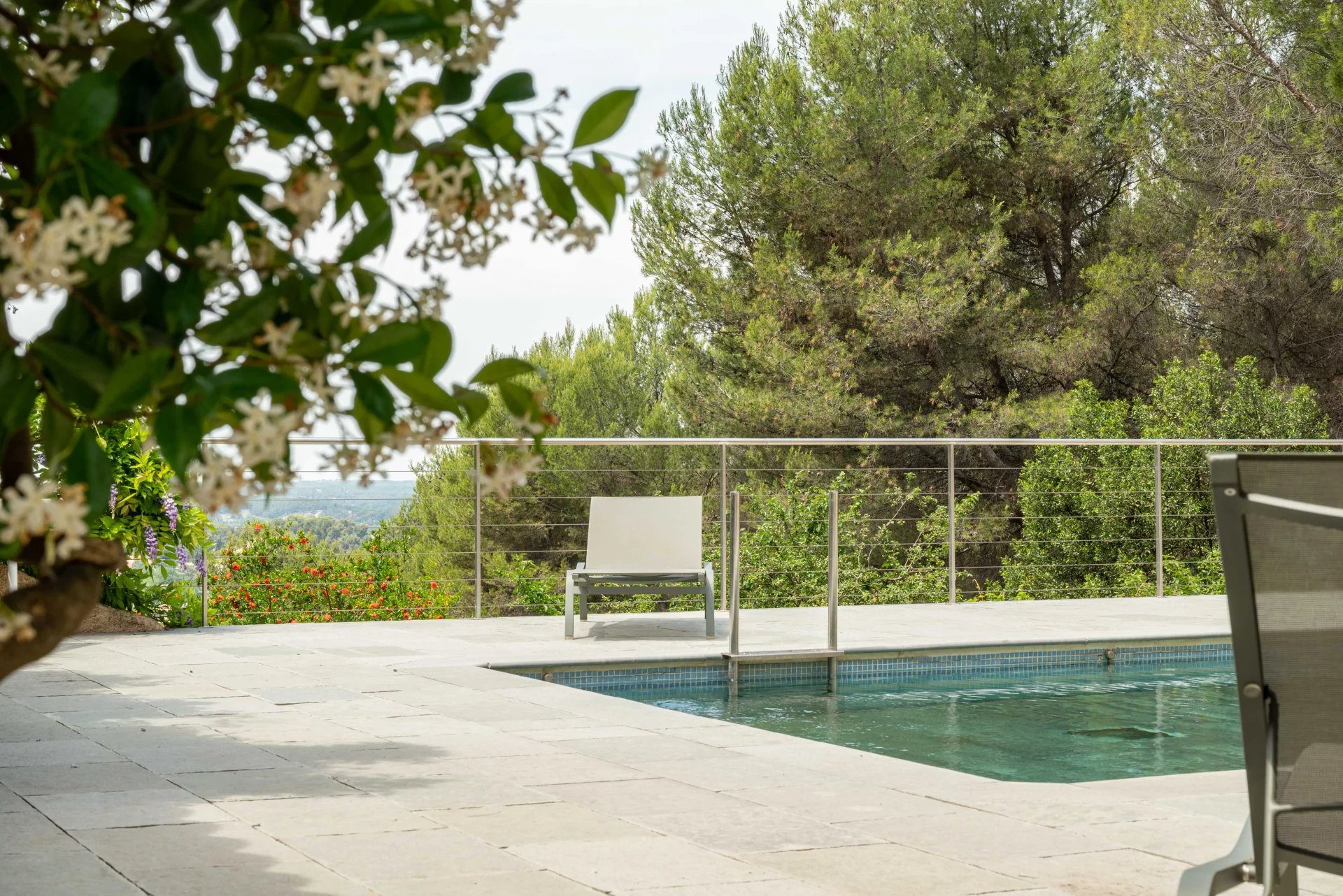 The terrace, offering a beautiful unobstructed view, overlooks a beautiful swimming pool with moving bottom and its pool house.