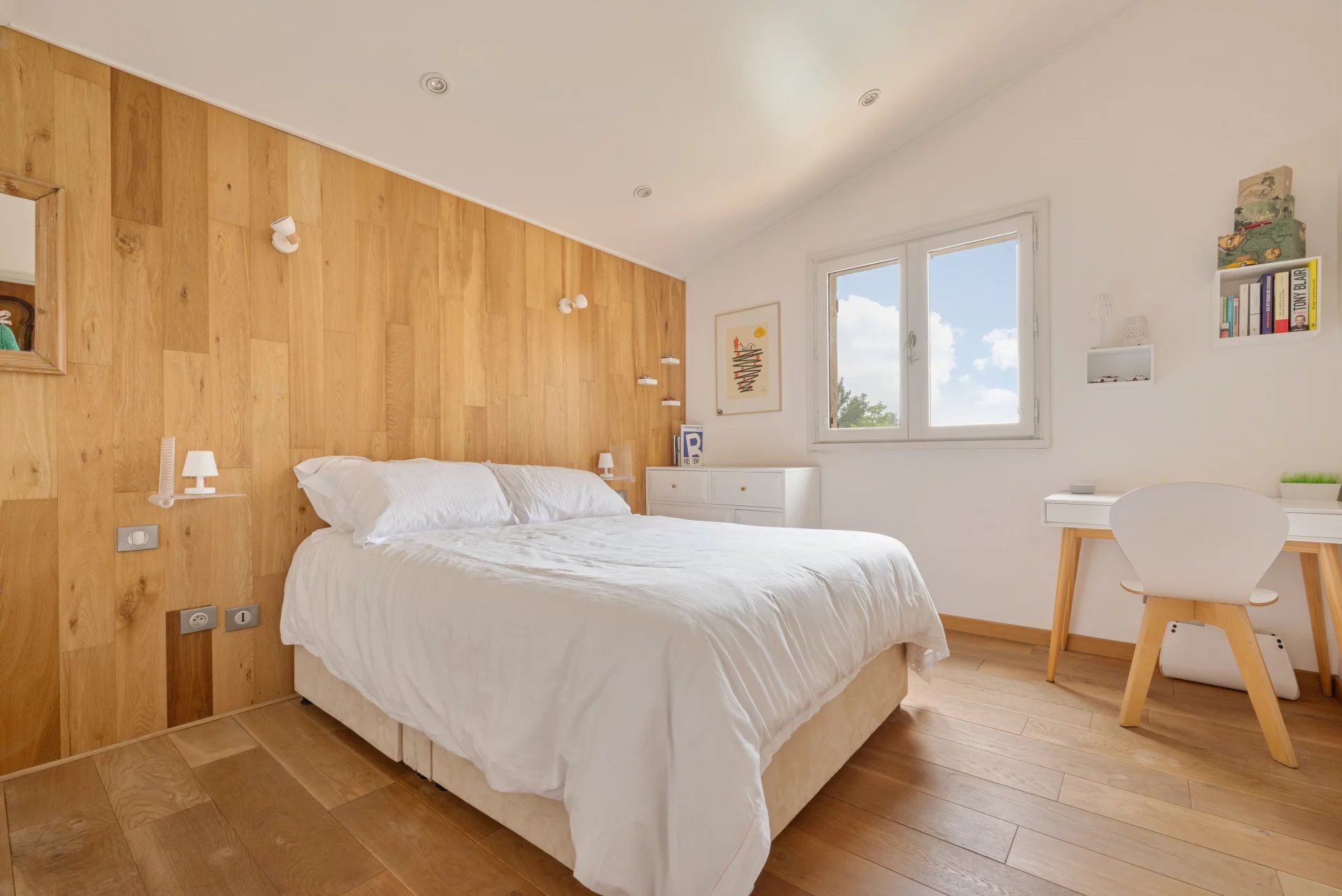 – A large apartment of about 80 m2 with an entrance and reading room, a large living room with open kitchen, a dressing room and a bedroom with its bathroom.
