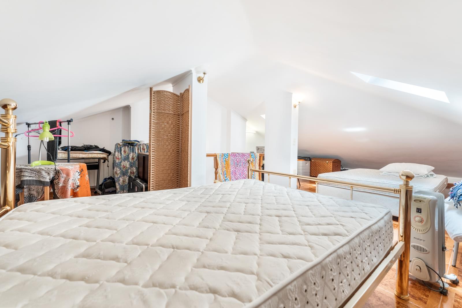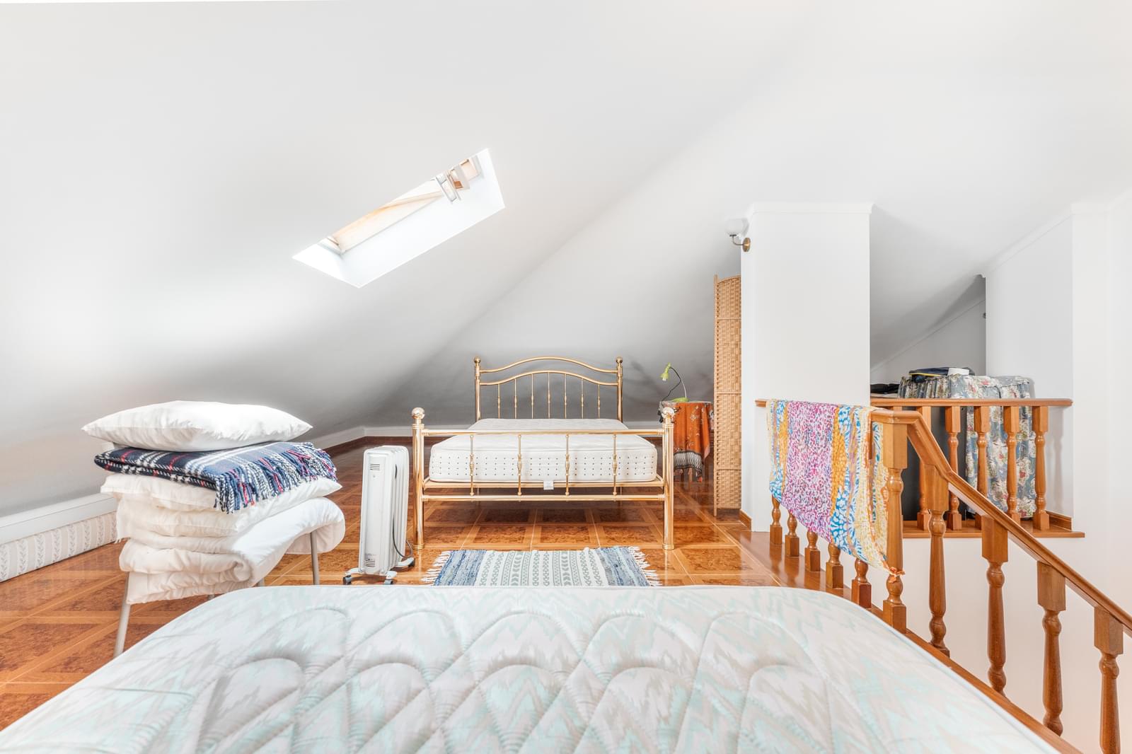 The current layout includes three bedrooms, a living room, kitchen, and a generously sized garage with space for multiple vehicles. The bright and spacious attic could easily be transformed into a suite, office, or leisure area. Thanks to its size, the garage has even inspired neighbours to create independent apartments, further enhancing the property’s potential.
