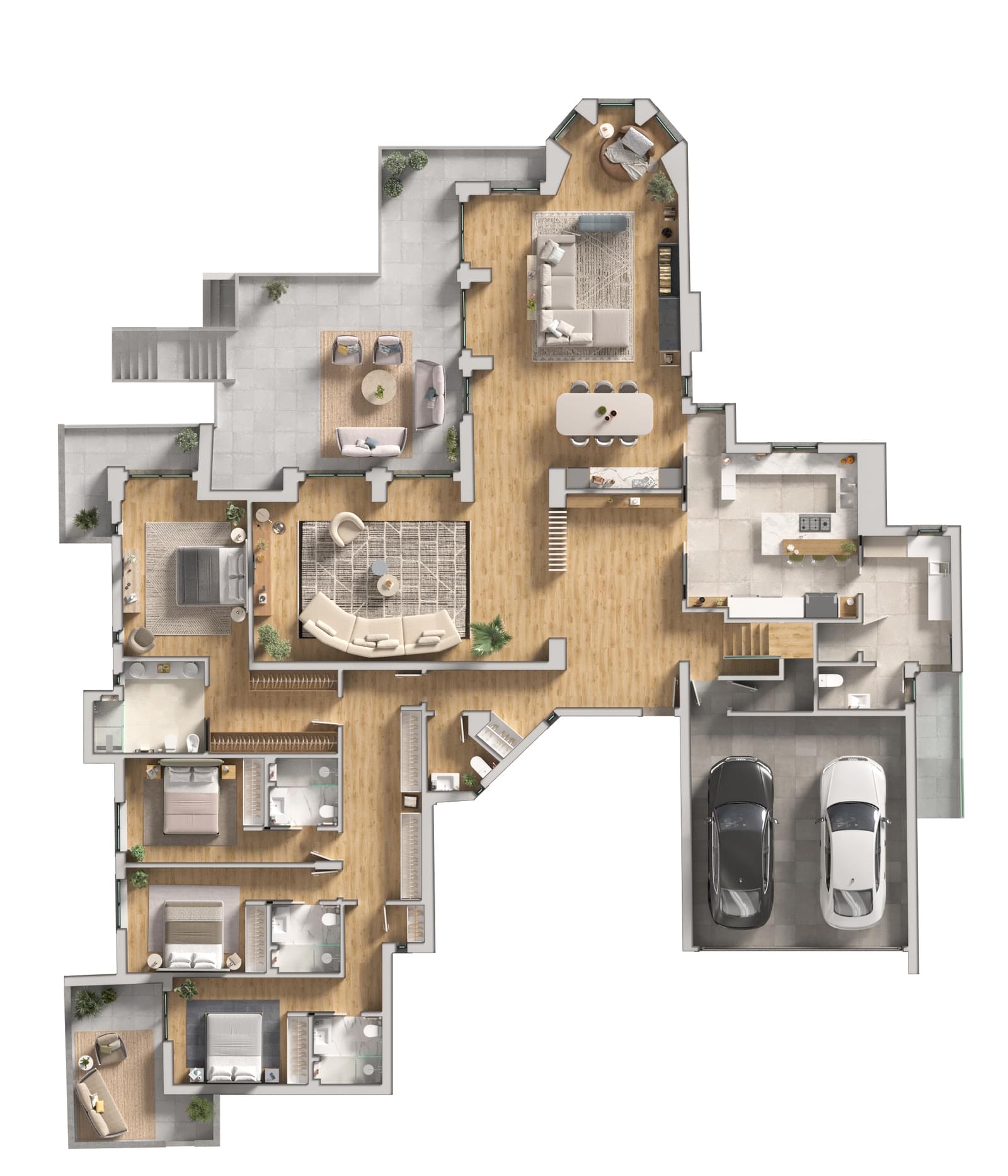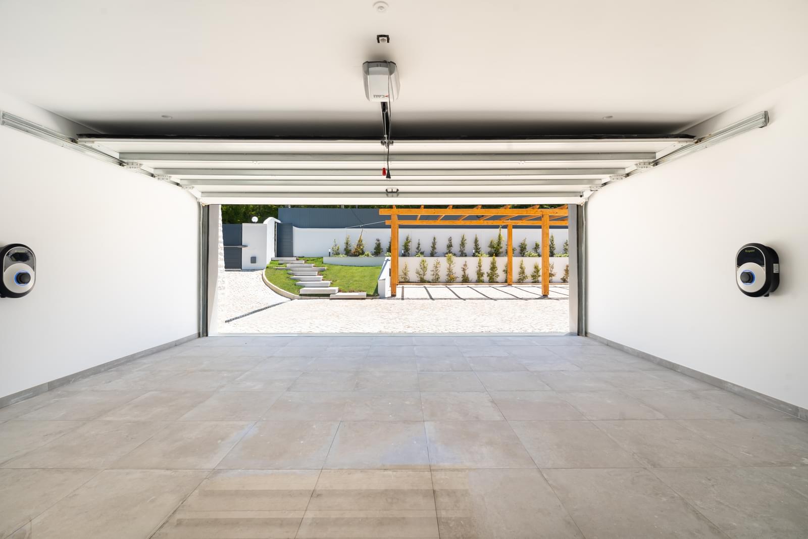 – Enclosed garage for two cars, additional pergola-covered parking, and three electric vehicle charging stations, anticipating the needs of modern mobility