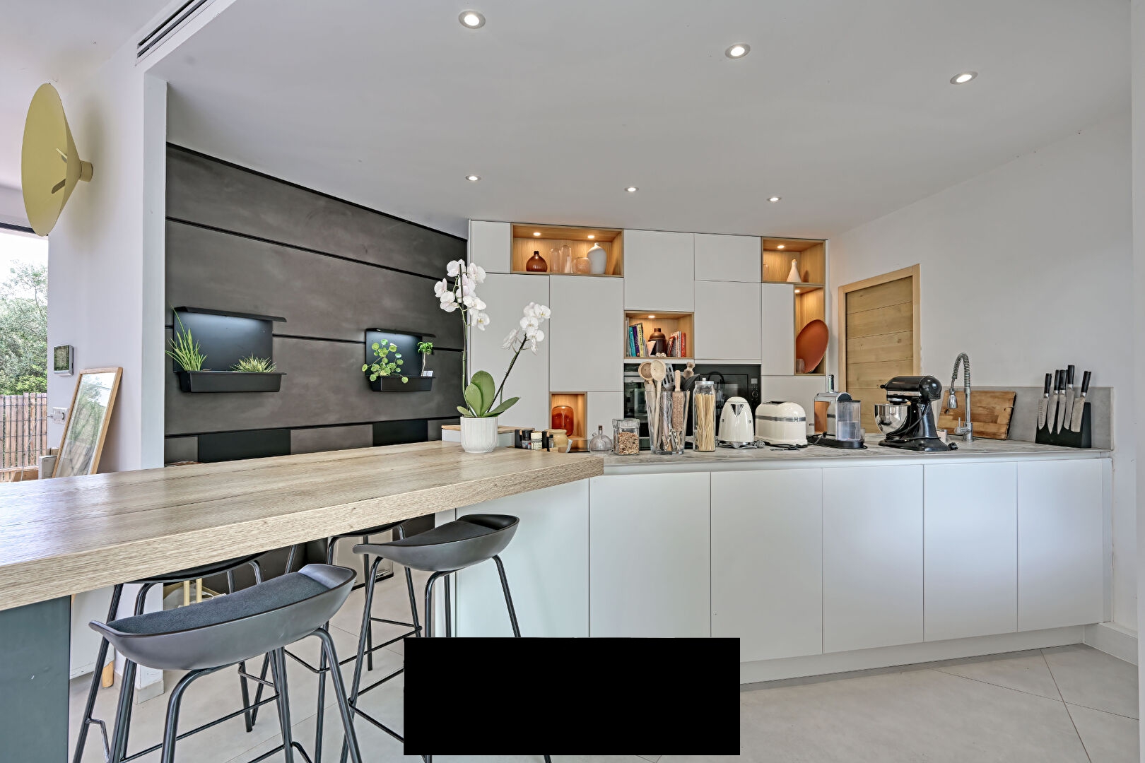 From the entrance, you will be seduced by a spectacular living room of about 75 m 2, bathed in light thanks to its floor-to-ceiling windows opening onto a magnificent terrace in exotic wood, overlooking the large pines, the garden and the pool. This space hosts a warm living room, a friendly dining room and a beautiful contemporary kitchen with central island designed by an interior architect. Functional and elegant, it combines noble materials and clean lines, thought as a true place to share, in the heart of the house.