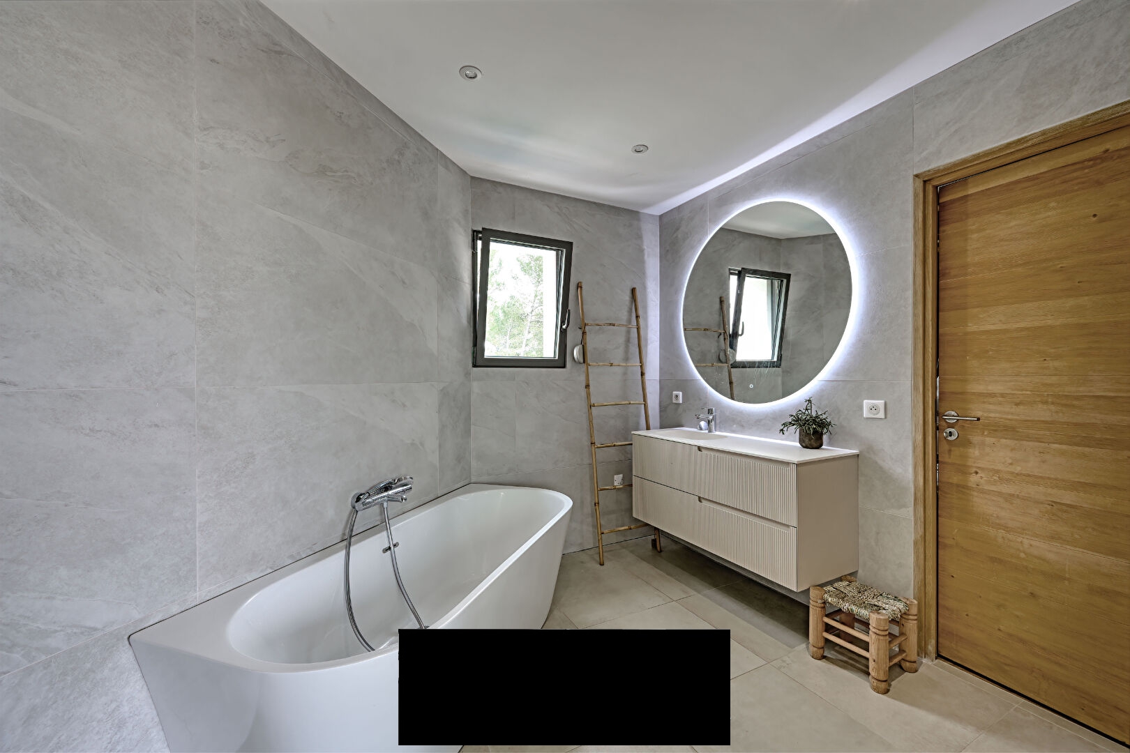 High-performance equipment completes the house: heating and air conditioning by heat pumps, solar panels for optimal energy performance.