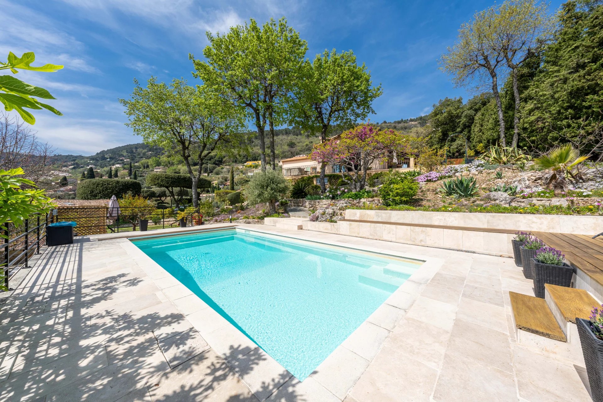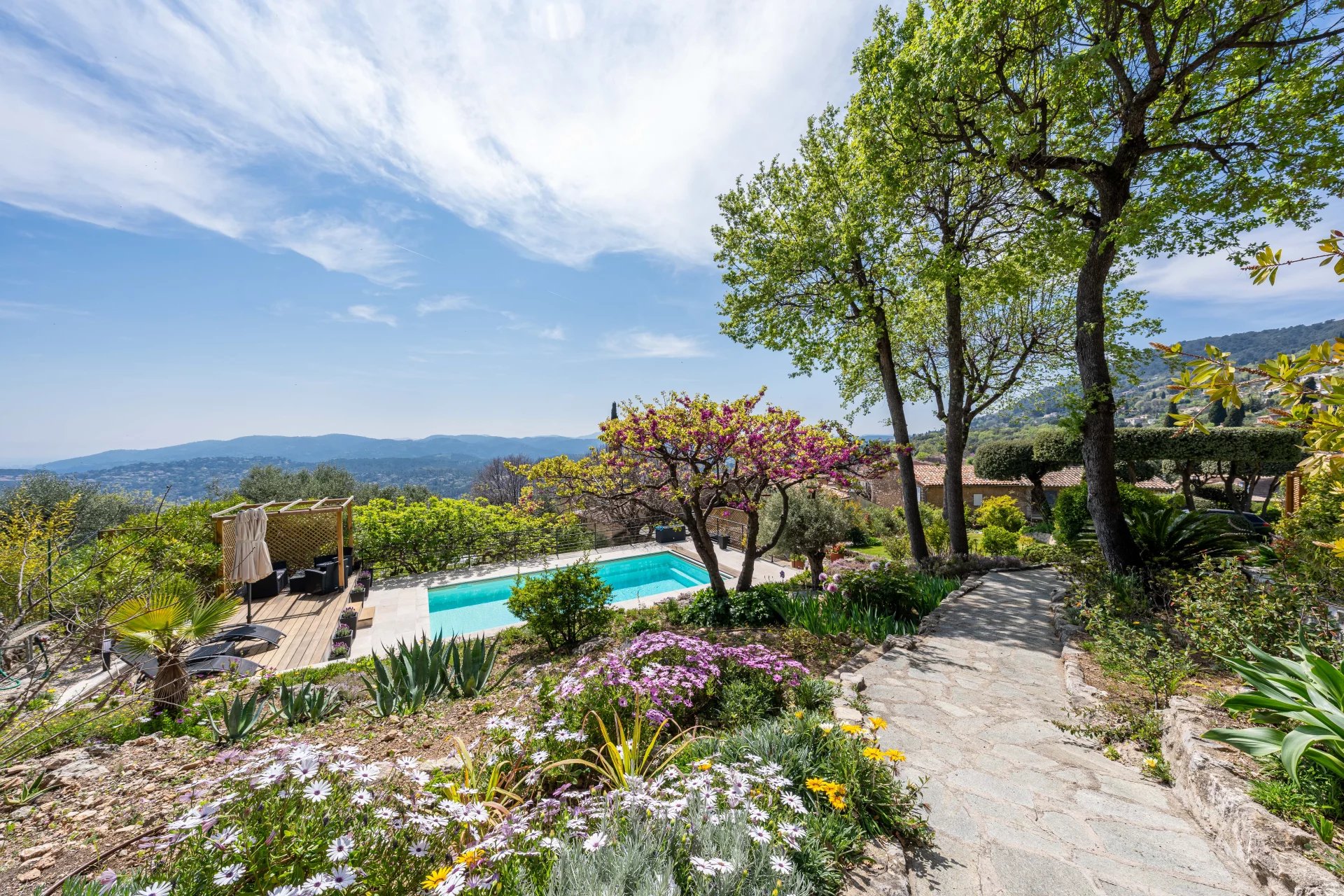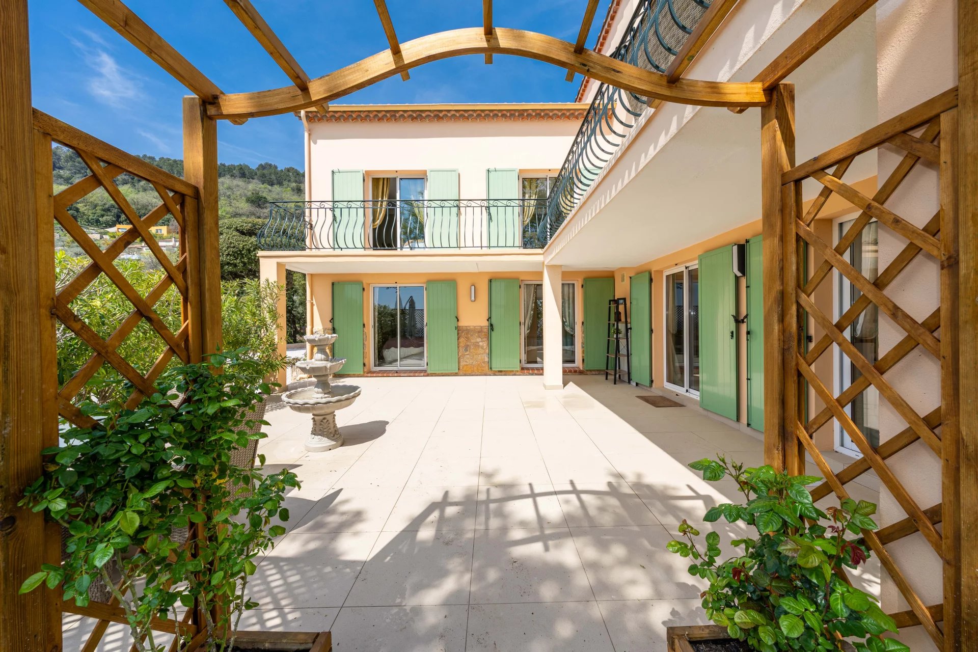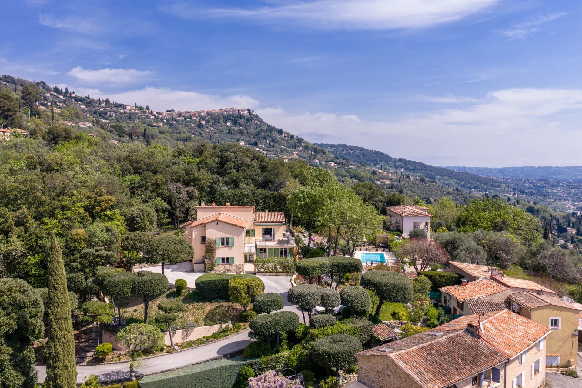 Beautiful villa of approximately 230m2, in excellent condition and requiring no work, offering stunning views over the sea, the lake, the village and the surrounding hills, ideally located on the edge of the village centre in a quiet and privileged setting.
