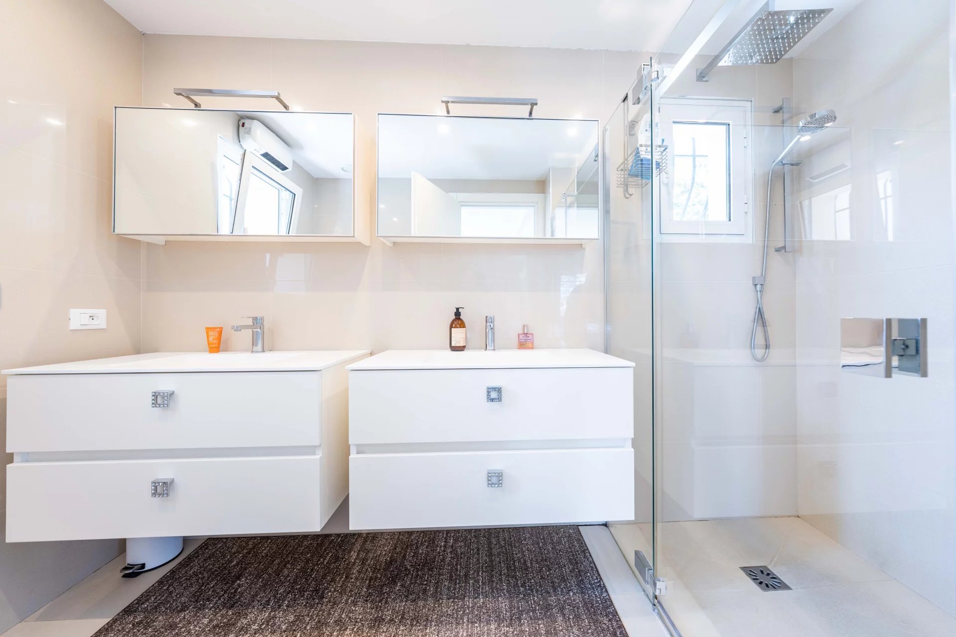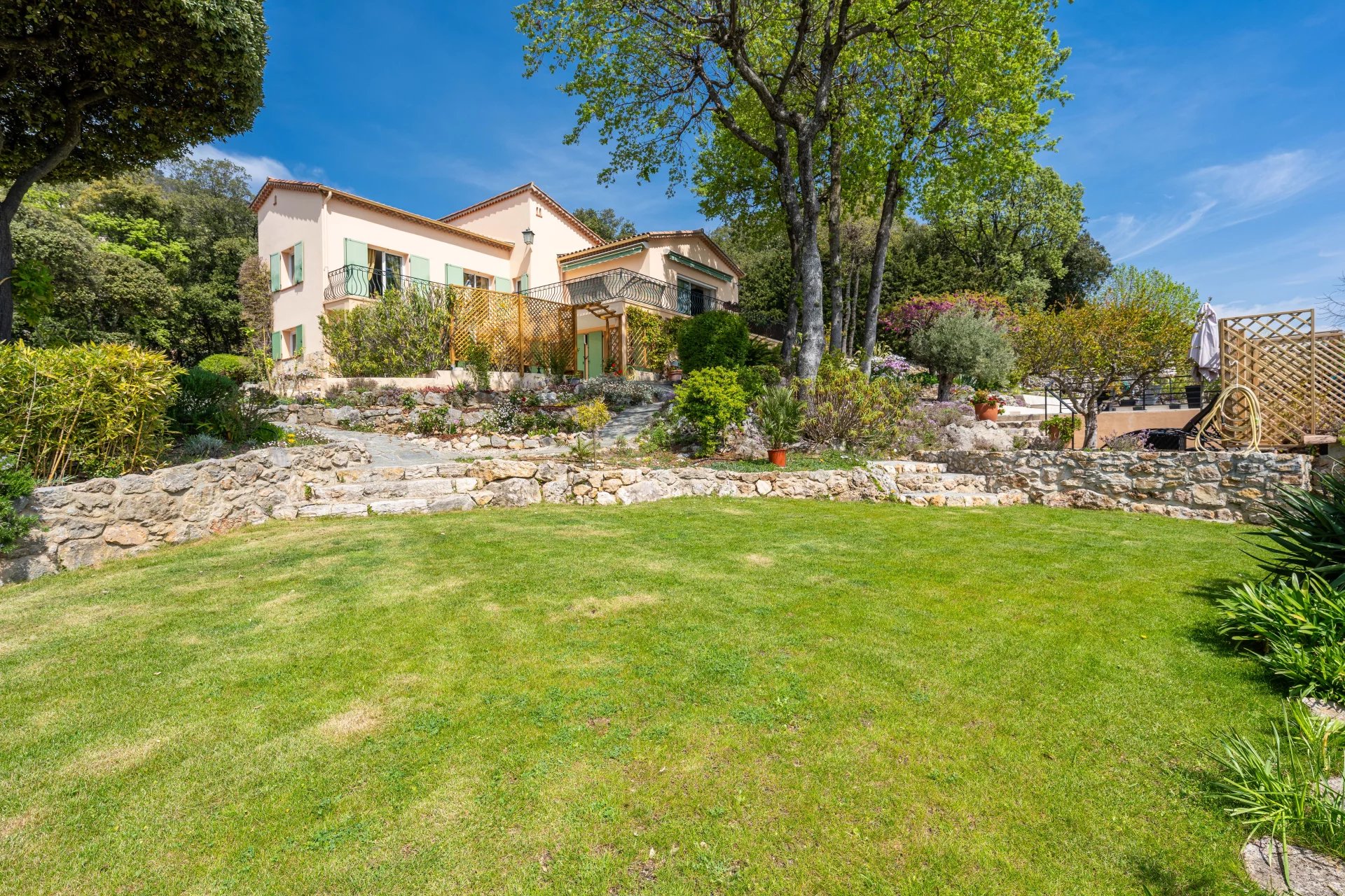 Downstairs on the garden level, there are 3 double bedrooms, each with direct access to the secluded lower terrace, and each with its own shower or bathroom.