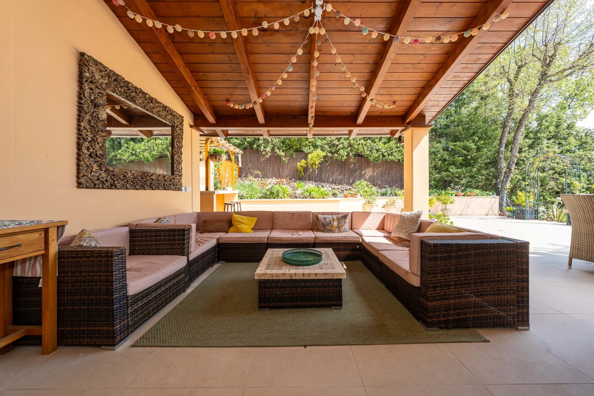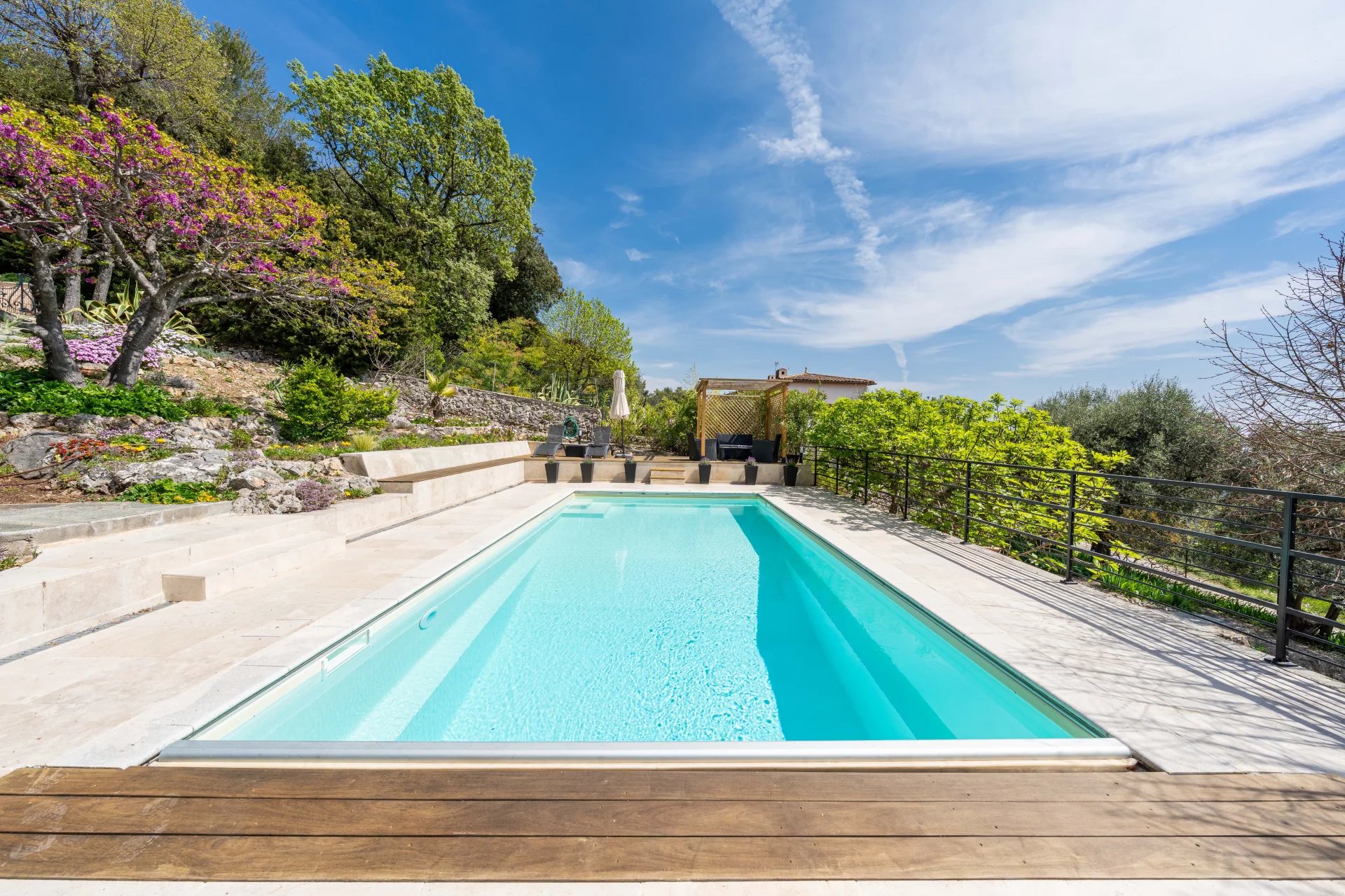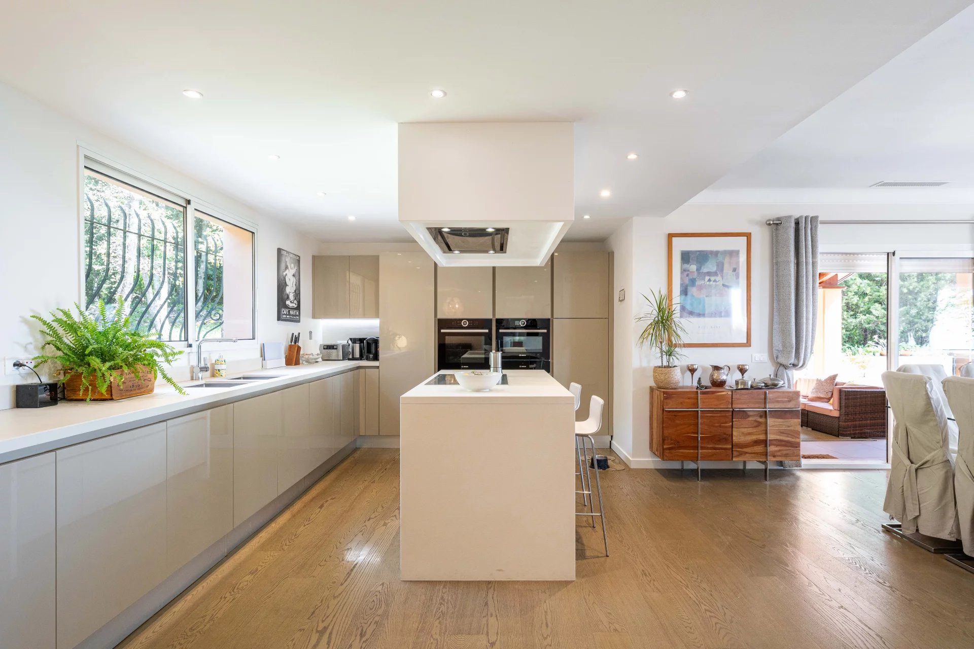 An outdoor kitchen and bar ensure ease of entertaining on the dining terrace, overlooking the garden, pool and Bay of Cannes.