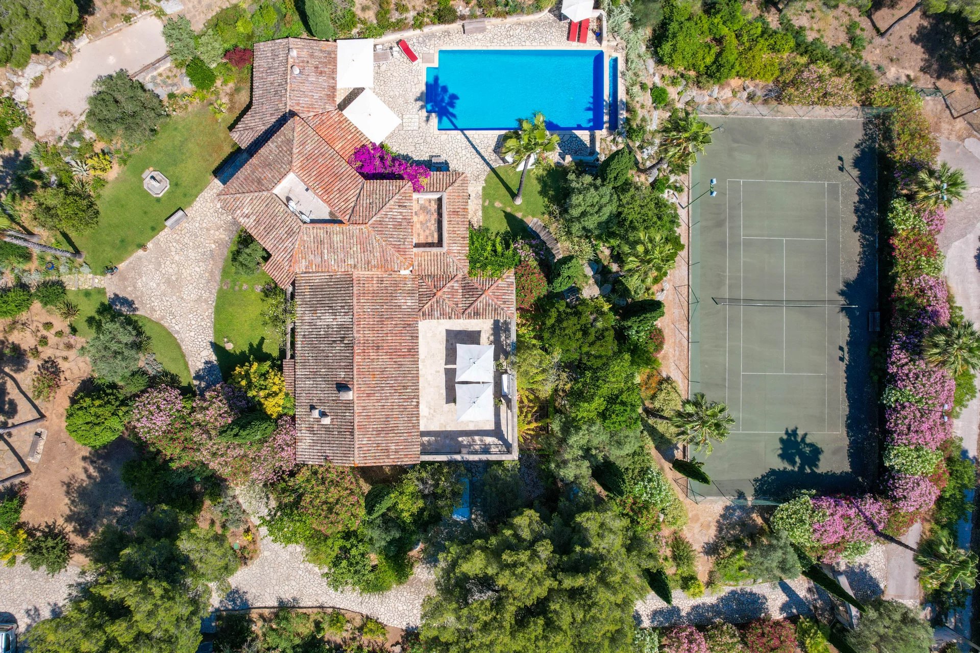 Outside, an infinity pool, a summer kitchen area, a private tennis court, and vast shaded terraces extend this outdoor lifestyle.