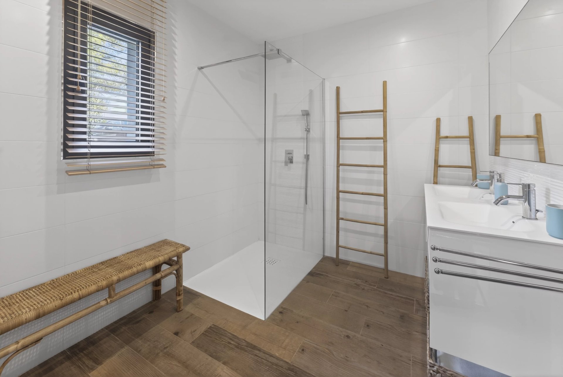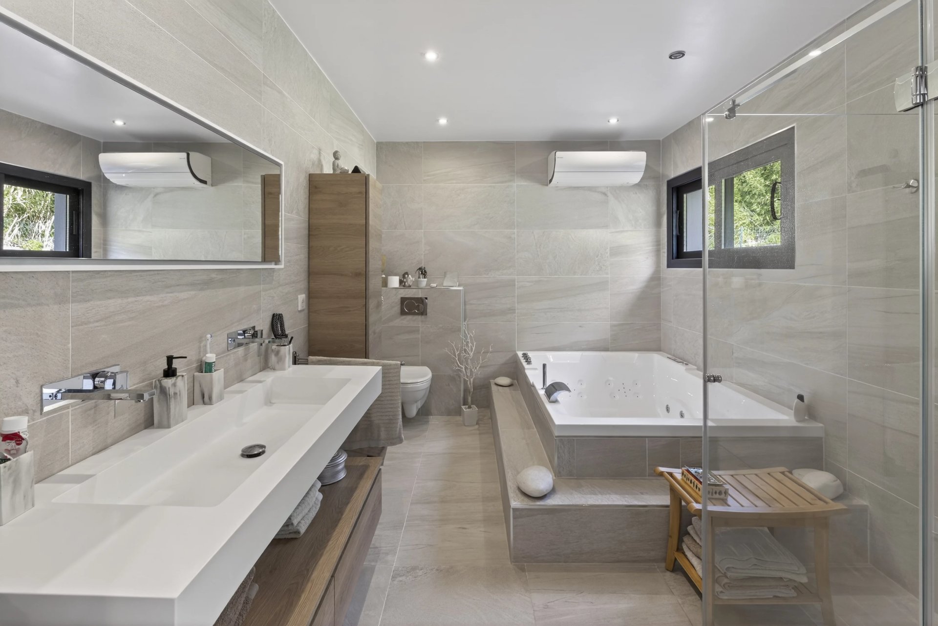 The outdoor areas are designed for relaxation: a 12 x 4 meter mirror swimming pool, jacuzzi, large wooden terrace and bioclimatic pergola. The garden is well maintained, fully enclosed and easy to care for.