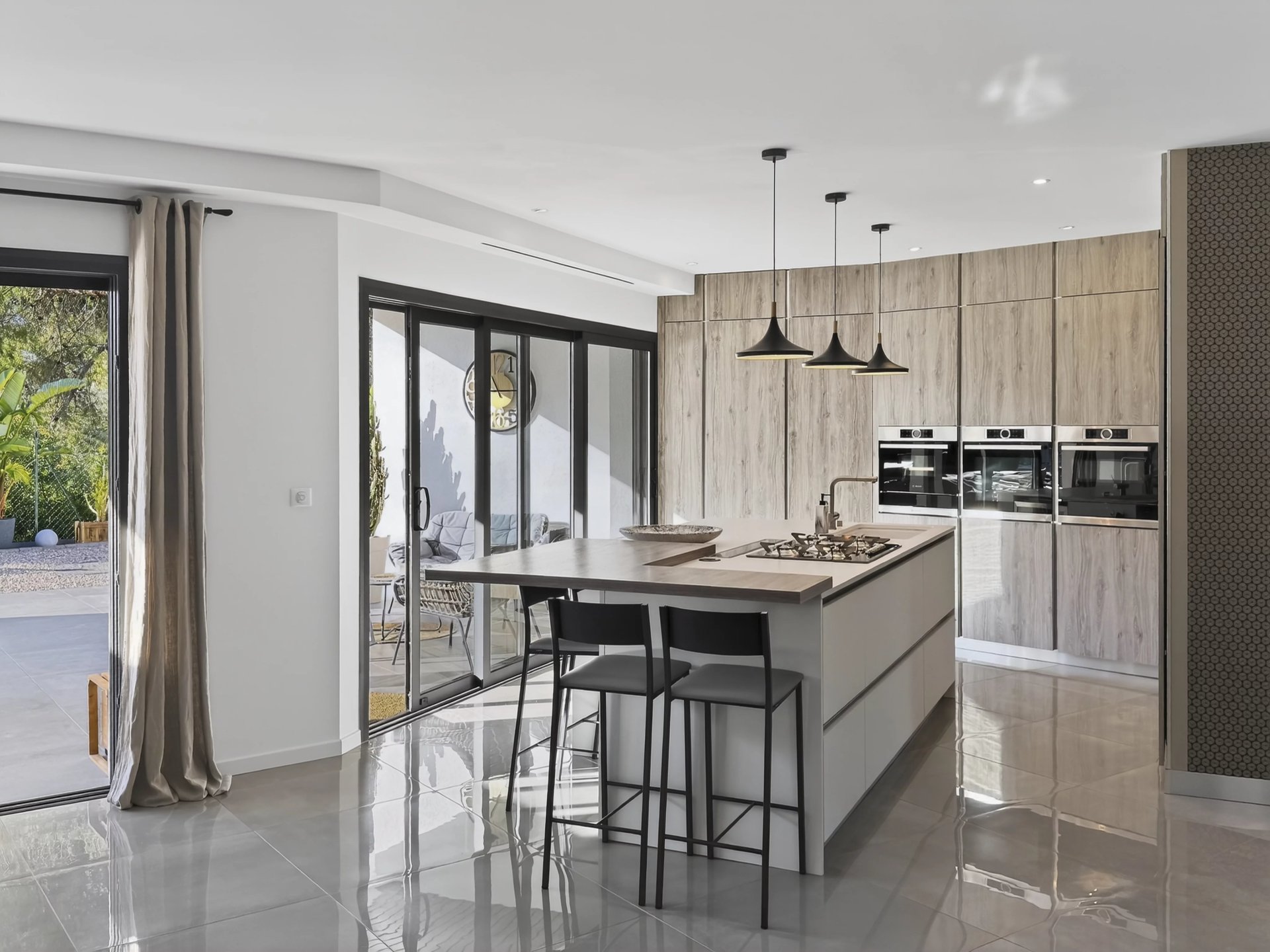The living area of approximately 80 m2 is bright and opens widely onto the garden and swimming pool. The open, fully equipped kitchen offers a simple and functional space, ideal for everyday living as well as for entertaining.