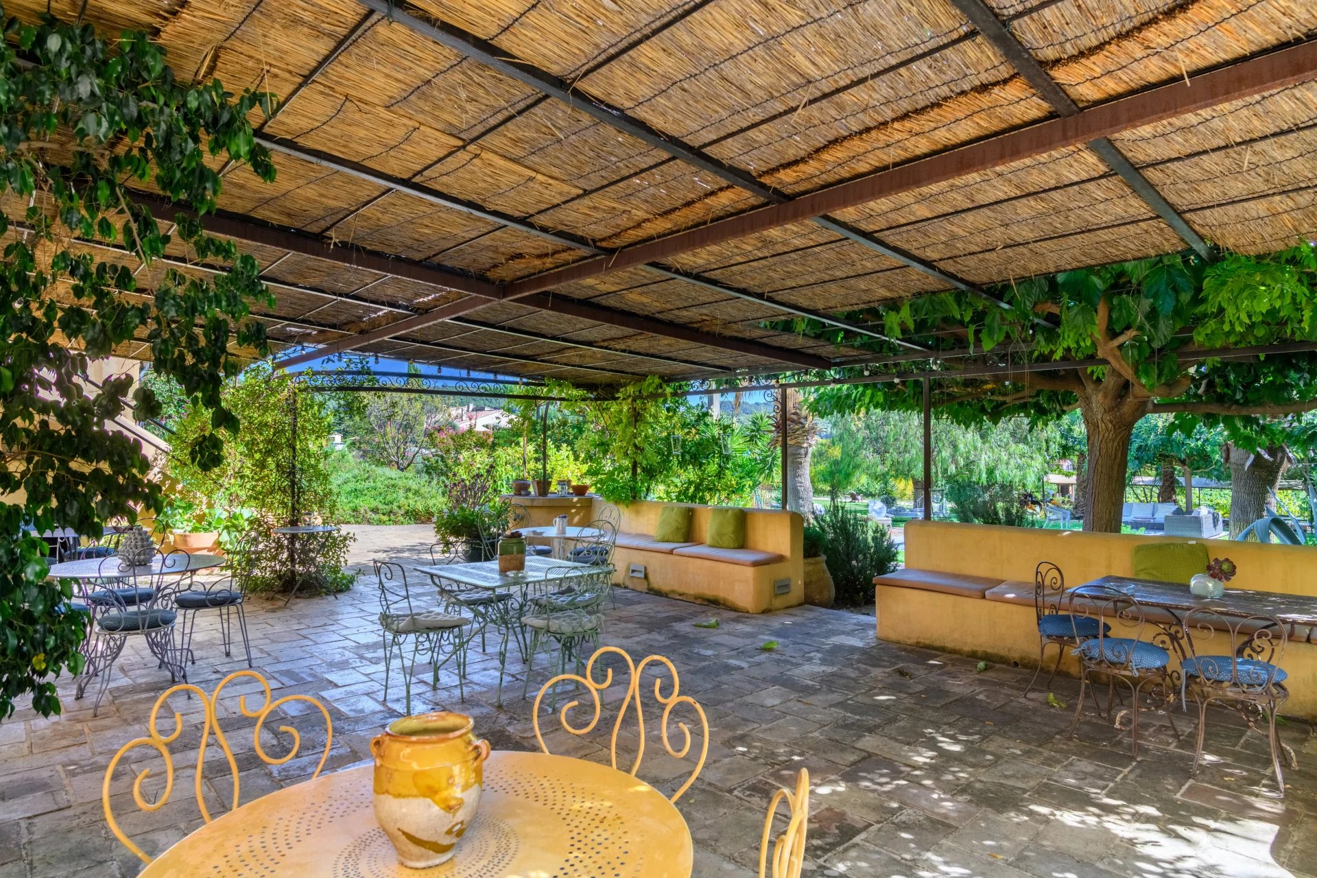 The south-facing garden is planted with Mediterranean species and features a swimming pool, a pergola, and a summer kitchen.