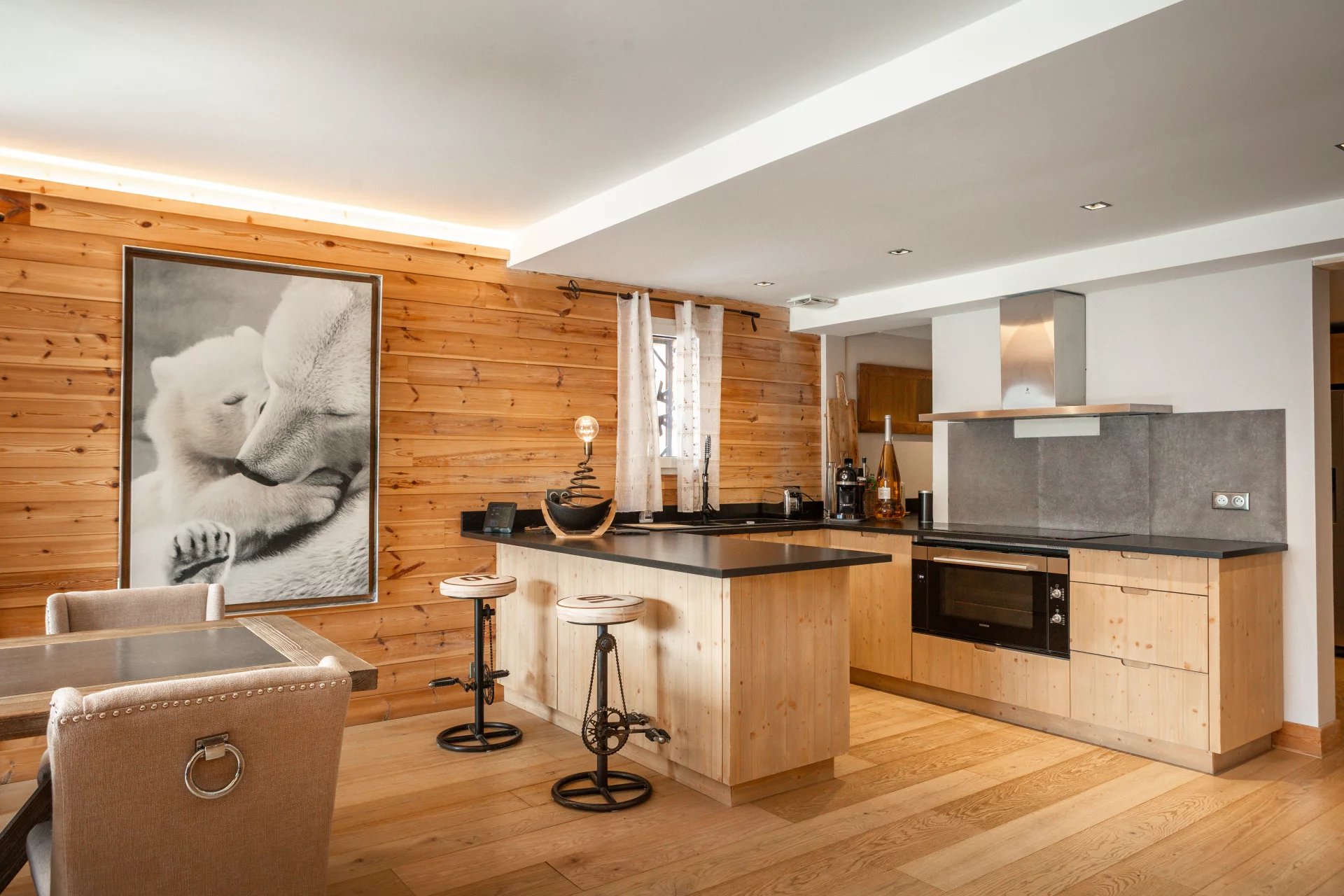 The design of the chalet highlights a living room housing a large living room, a dining room, and a kitchen opening onto a south-facing terrace.