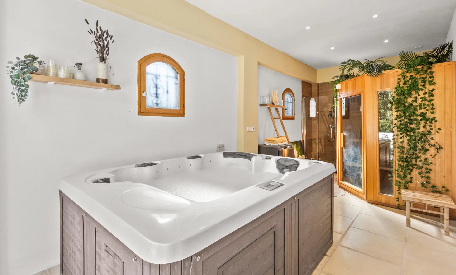 The landscaped grounds of about 3,000 m2 include a pool, spa with jacuzzi, terraces, a storage chalet, garage and workshop