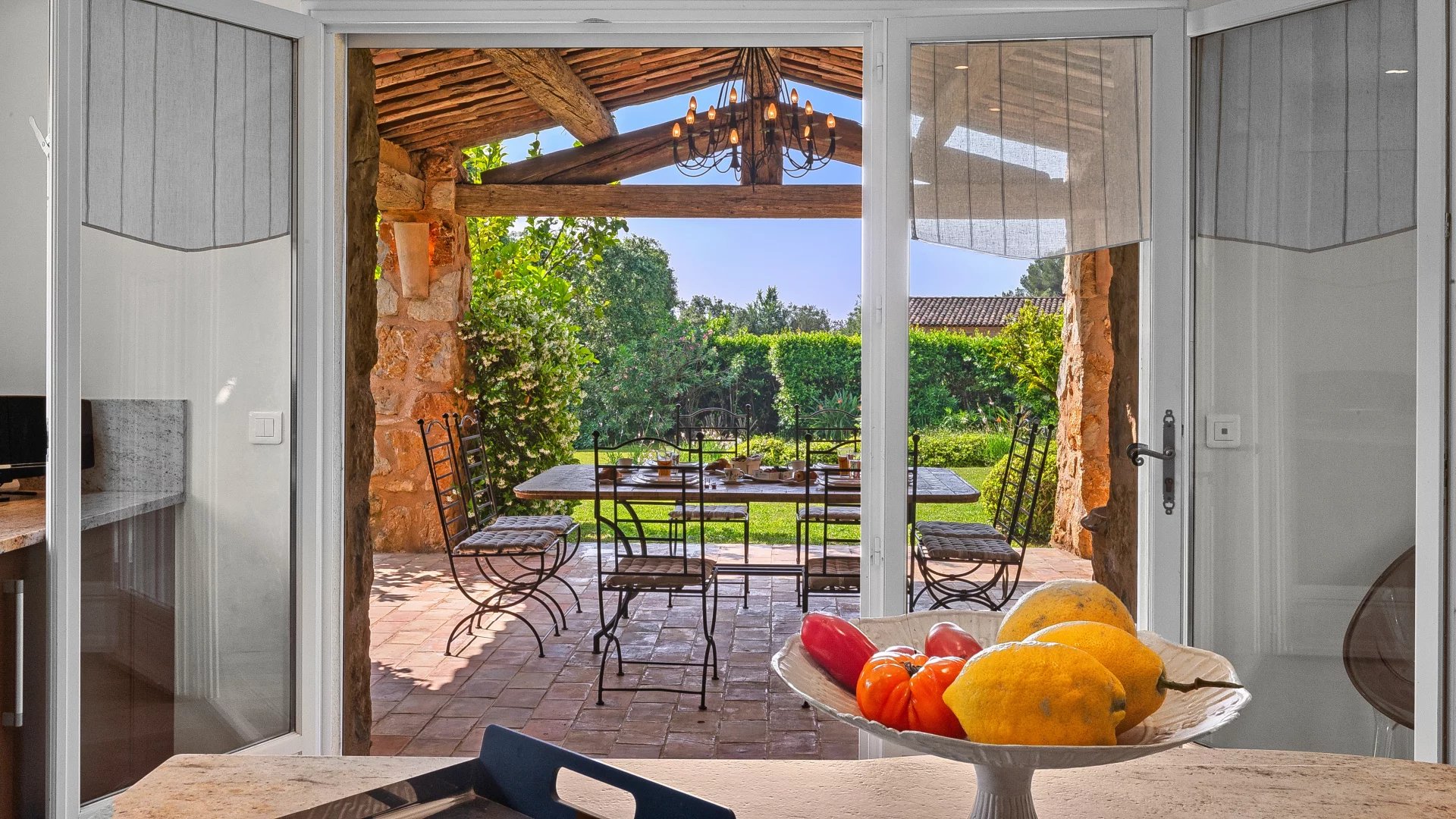 A welcoming entrance hall, a spacious and bright living room with a fireplace, and a dining area. Flowing naturally from the dining room, a fully equipped kitchen extends to an elegant shaded summer kitchen, ideal for hosting convivial outdoor meals.