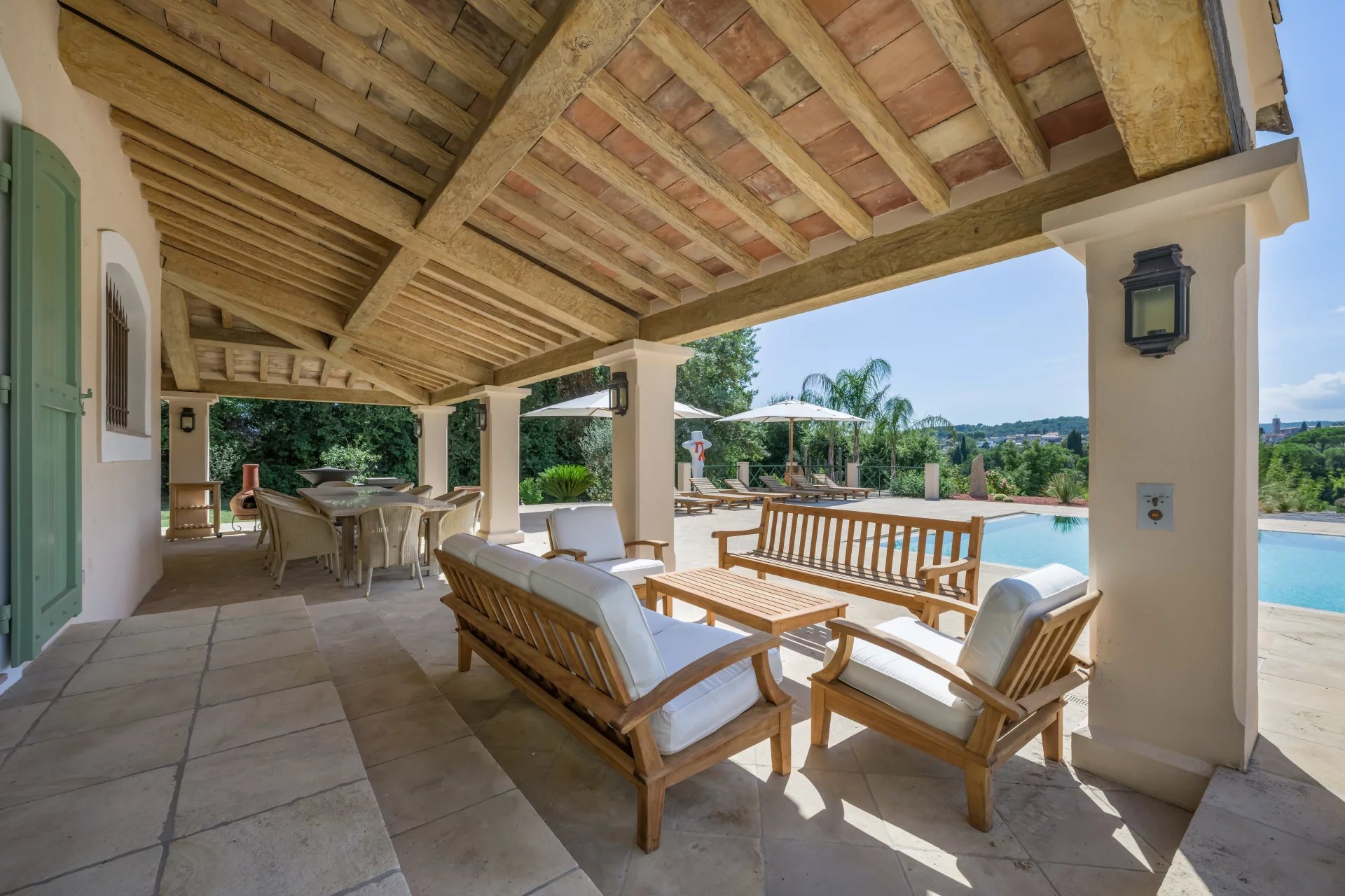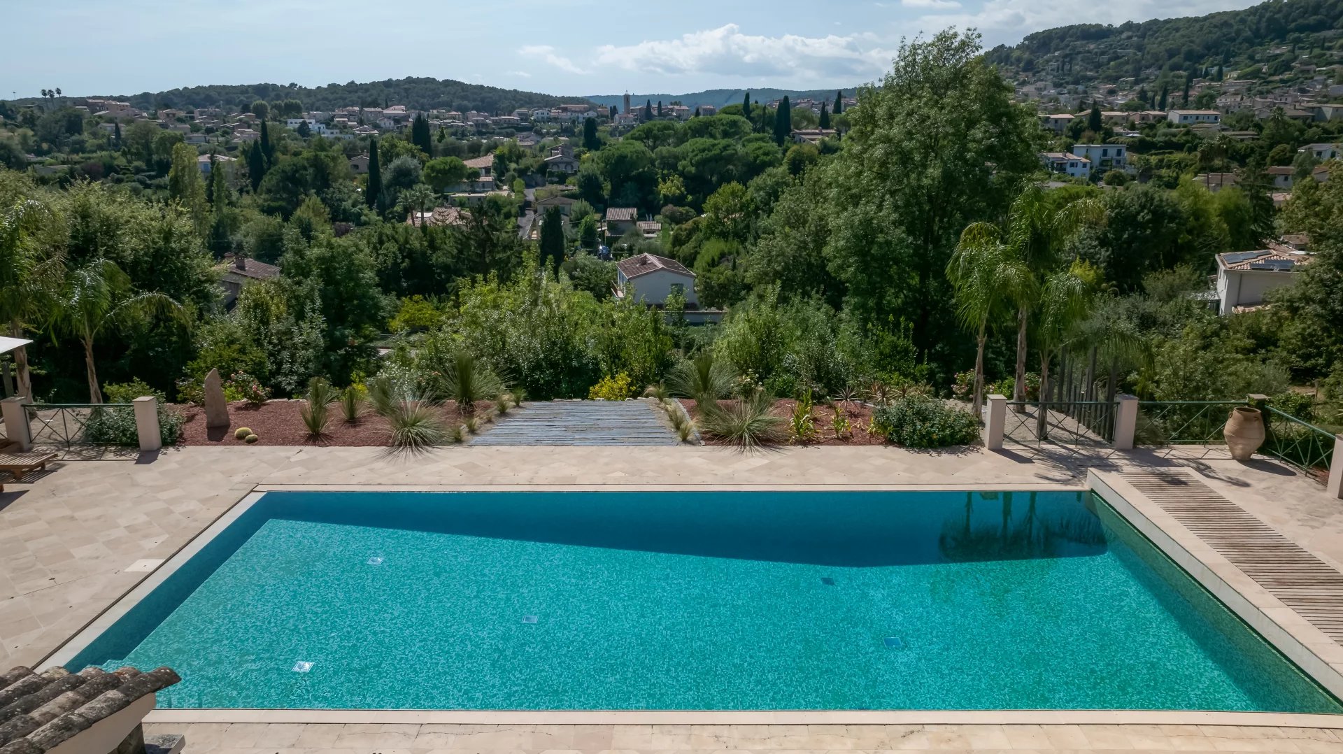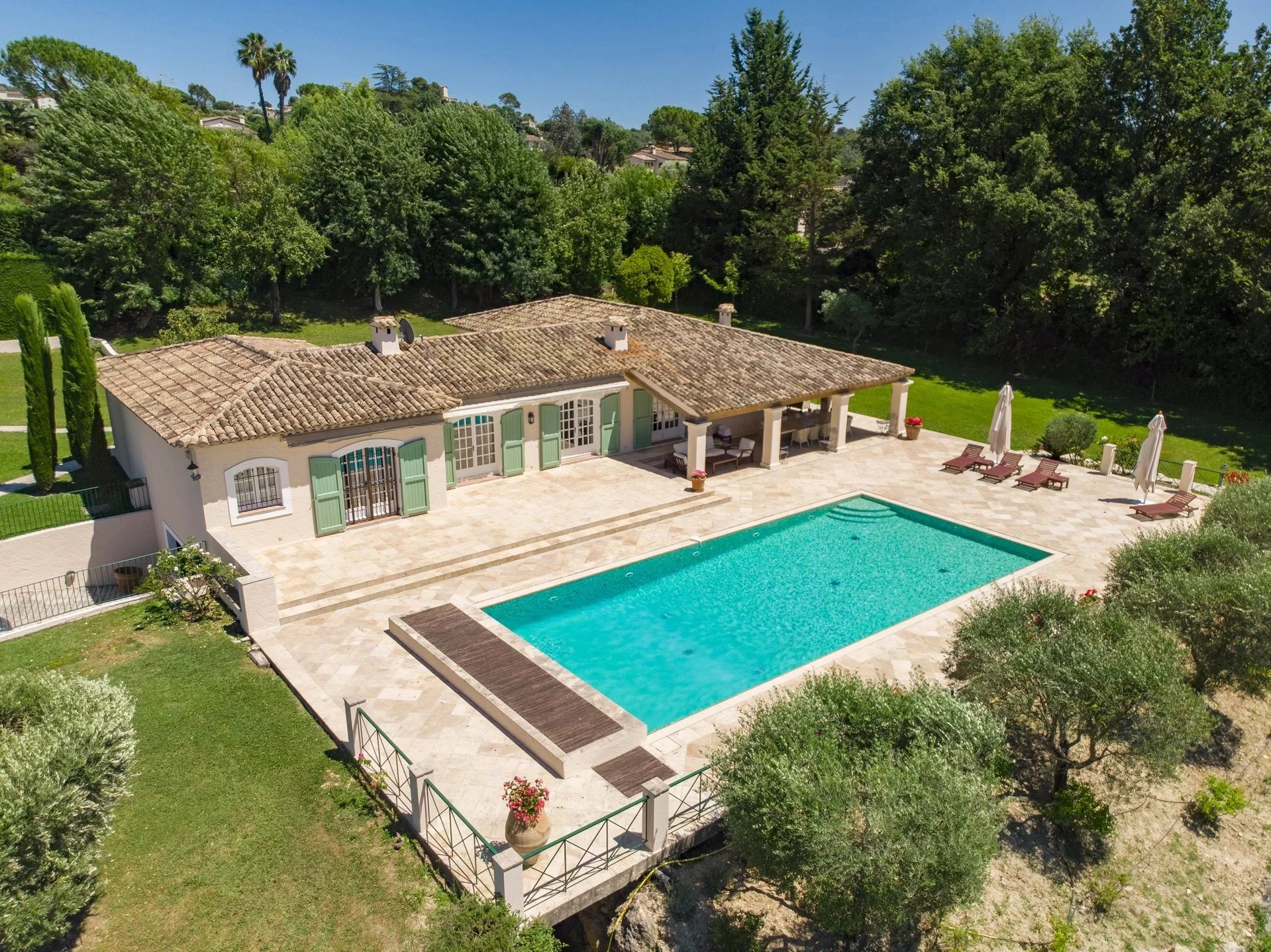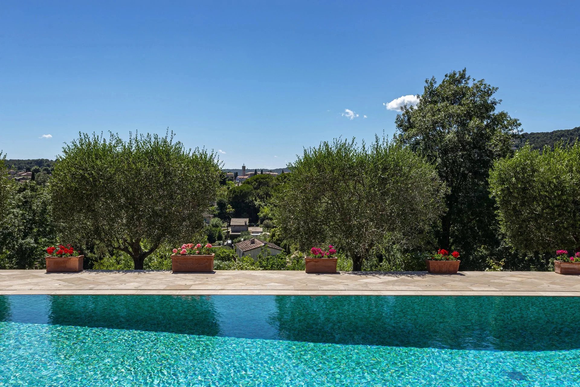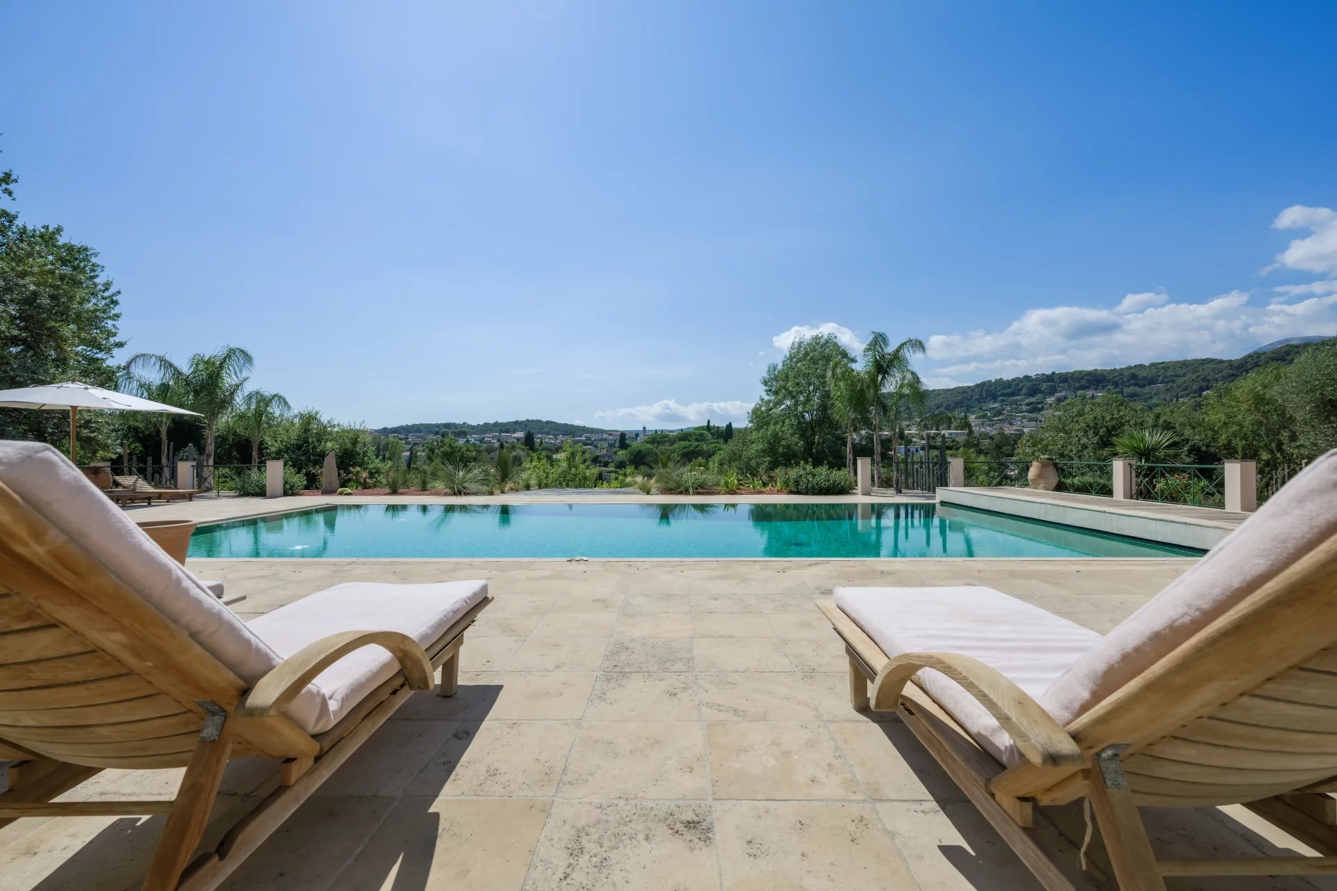 EXCLUSIVITY: Discover this magnificent single-storey Provencal villa located in Saint-Paul de Vence, offering open views of the village and surrounding hills. Nestled in a prestigious residential area, this 5-bedroom property is entirely on one level, surrounded by a superb flat garden with olive and fruit trees, with a 14-meter heated indoor infinity pool, Padle or Tennis Possible. Réf 15404