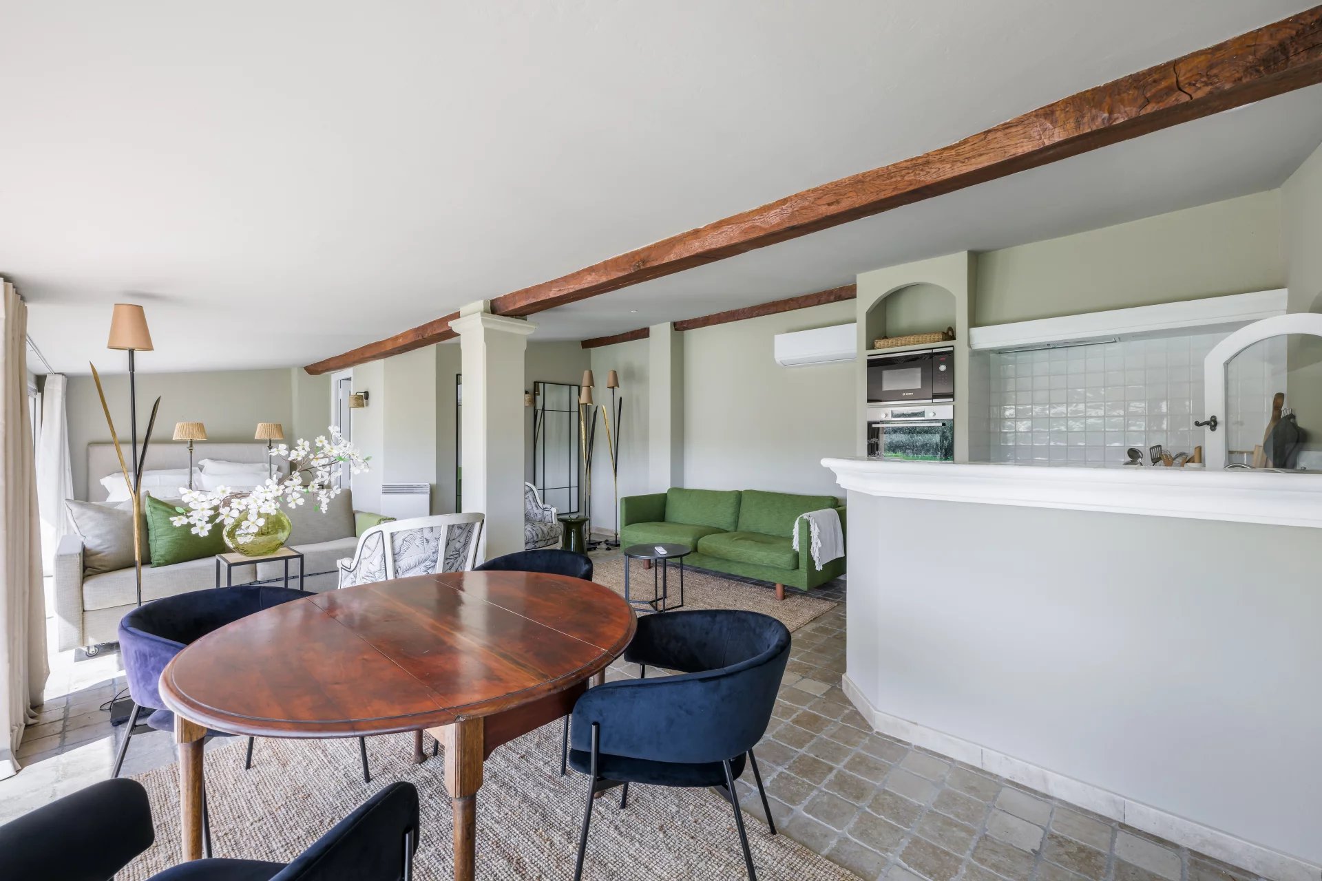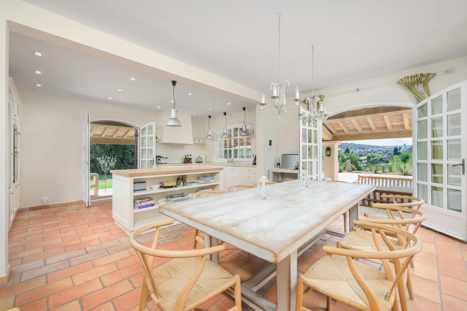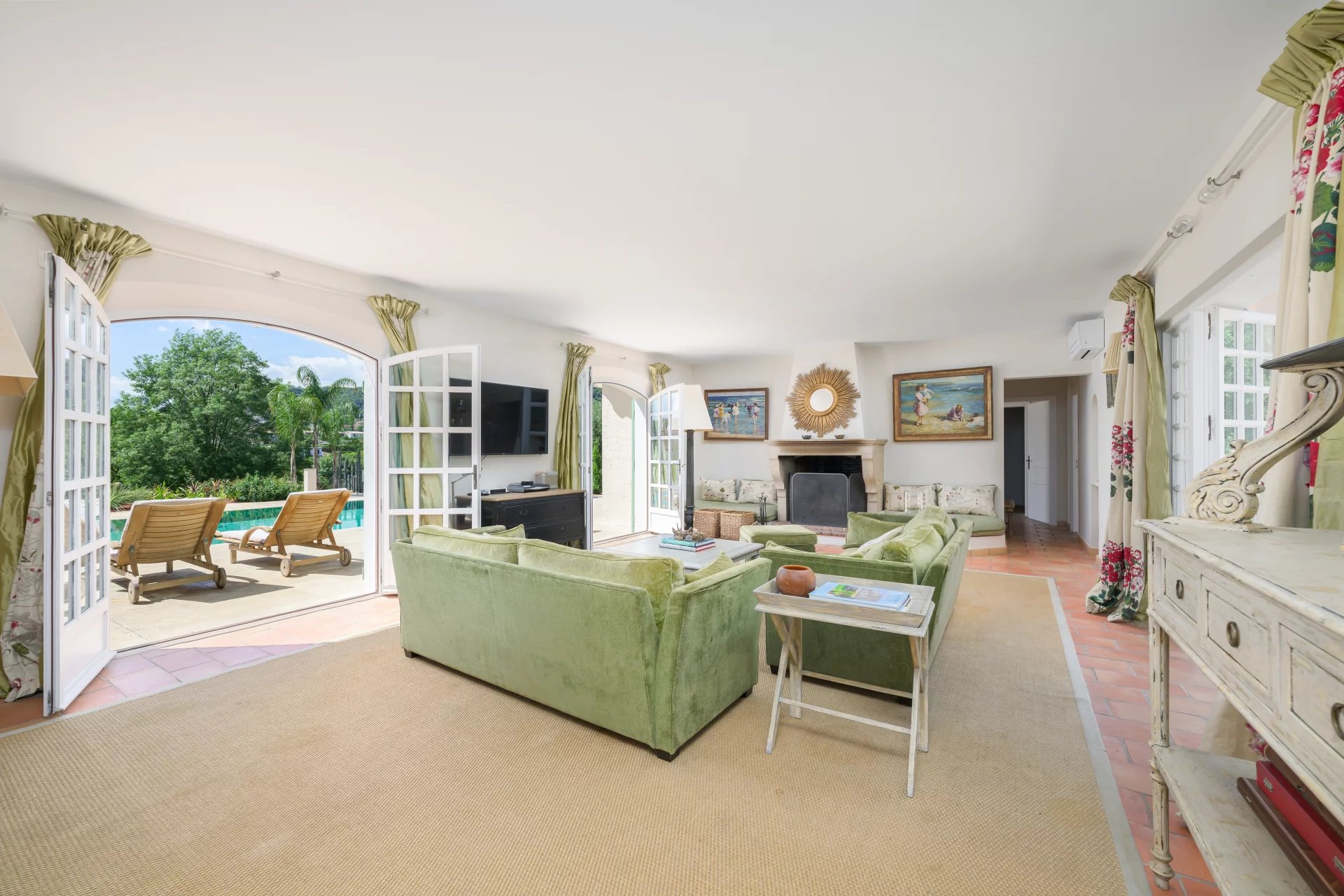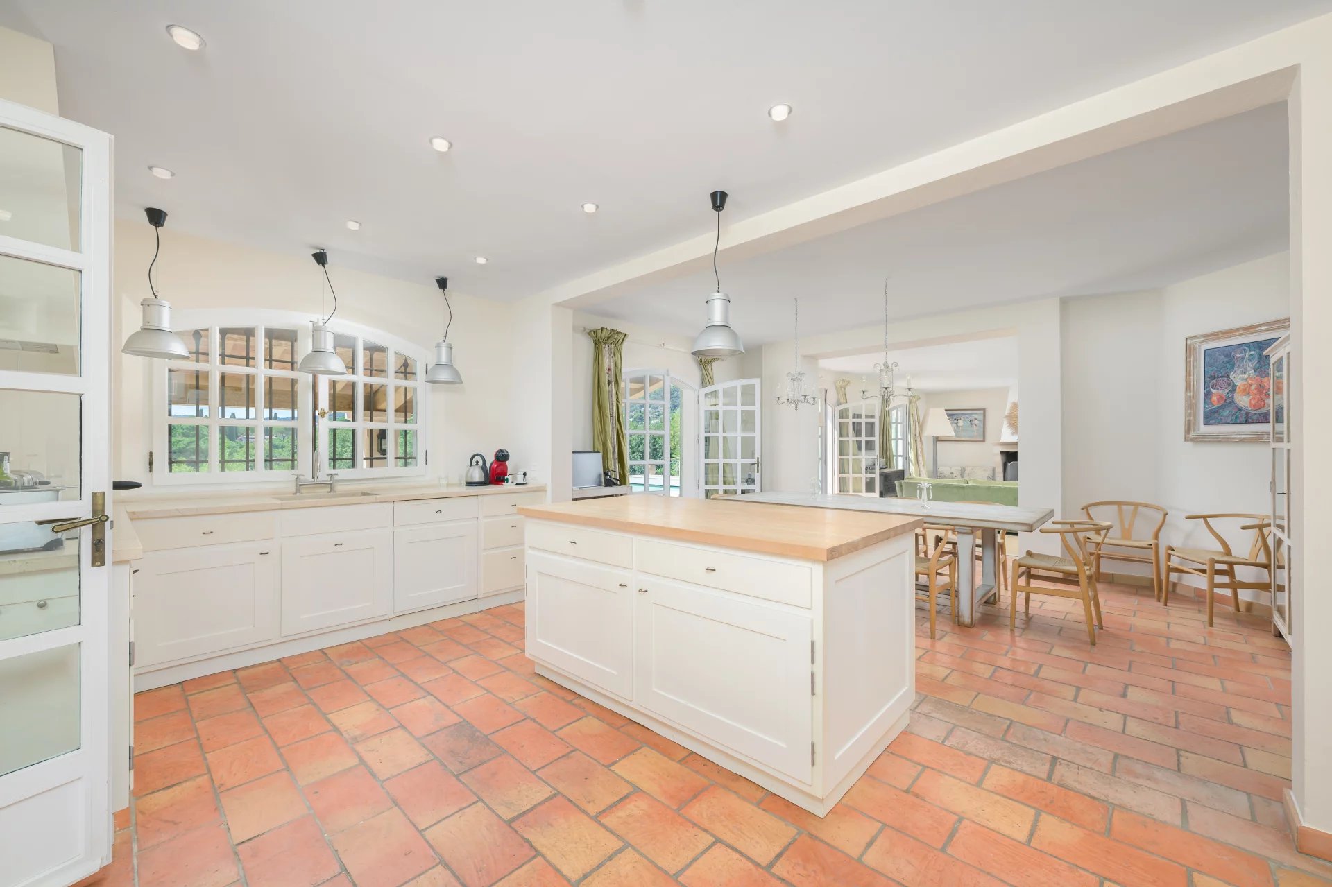 The interior of the villa comprises an entrance hall, guest toilet, living room with fireplace opening onto the terrace and pool, modern fully-equipped kitchen with island and dining room extending onto a large covered terrace with barbecue, and three spacious en suite bedrooms … A guest house of approx. 47 m2, comprising a living room and kitchen area and an en suite bedroom with shower room and toilet, completes this exceptional property.