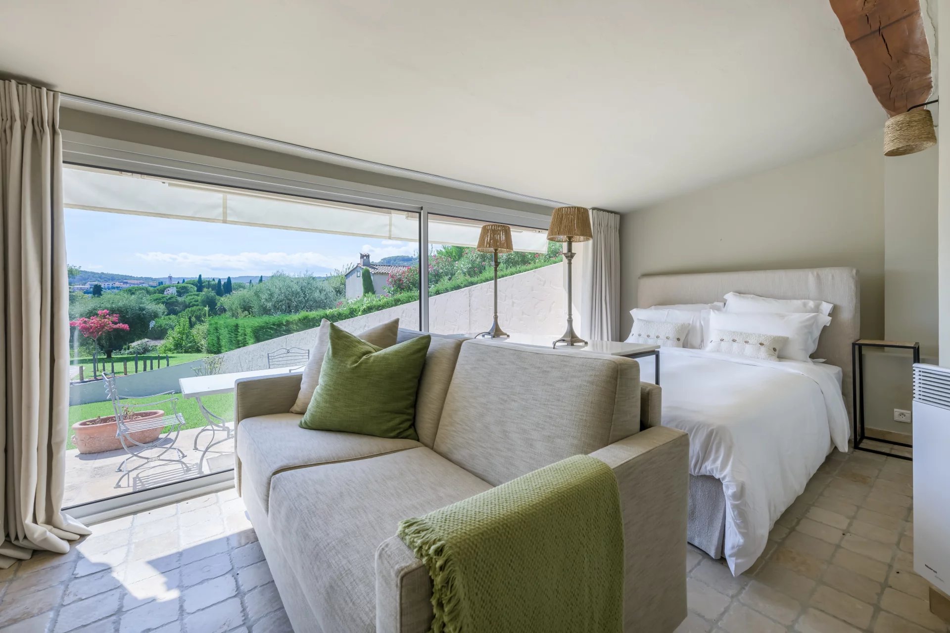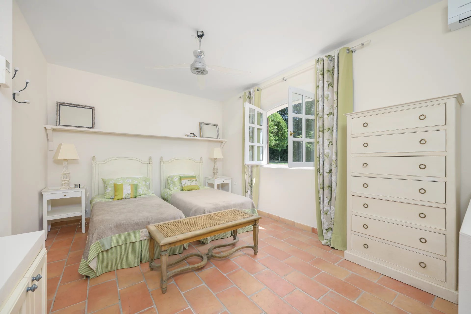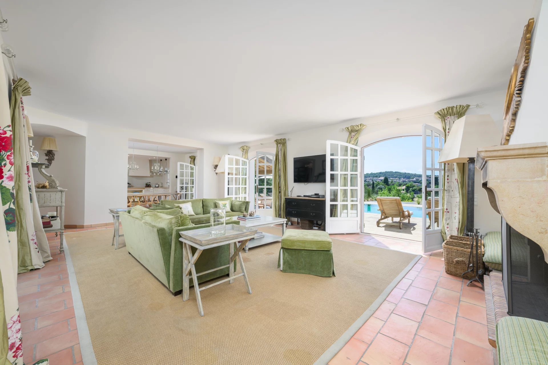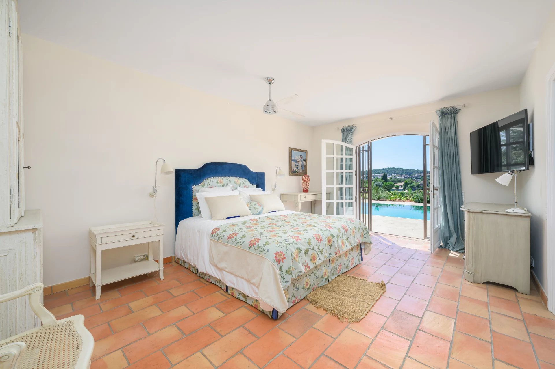 The interior of the villa comprises an entrance hall, guest toilet, living room with fireplace opening onto the terrace and pool, modern fully-equipped kitchen with island and dining room extending onto a large covered terrace with barbecue, and three spacious en suite bedrooms … A guest house of approx. 47 m2, comprising a living room and kitchen area and an en suite bedroom with shower room and toilet, completes this exceptional property.