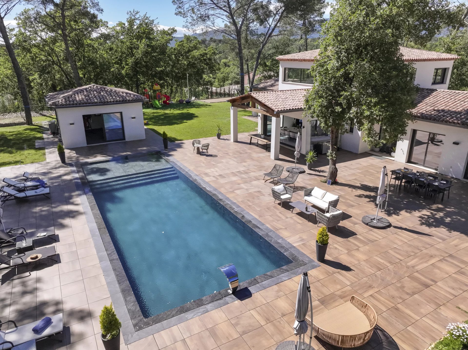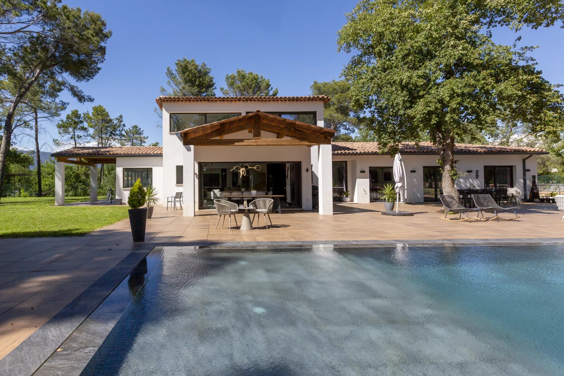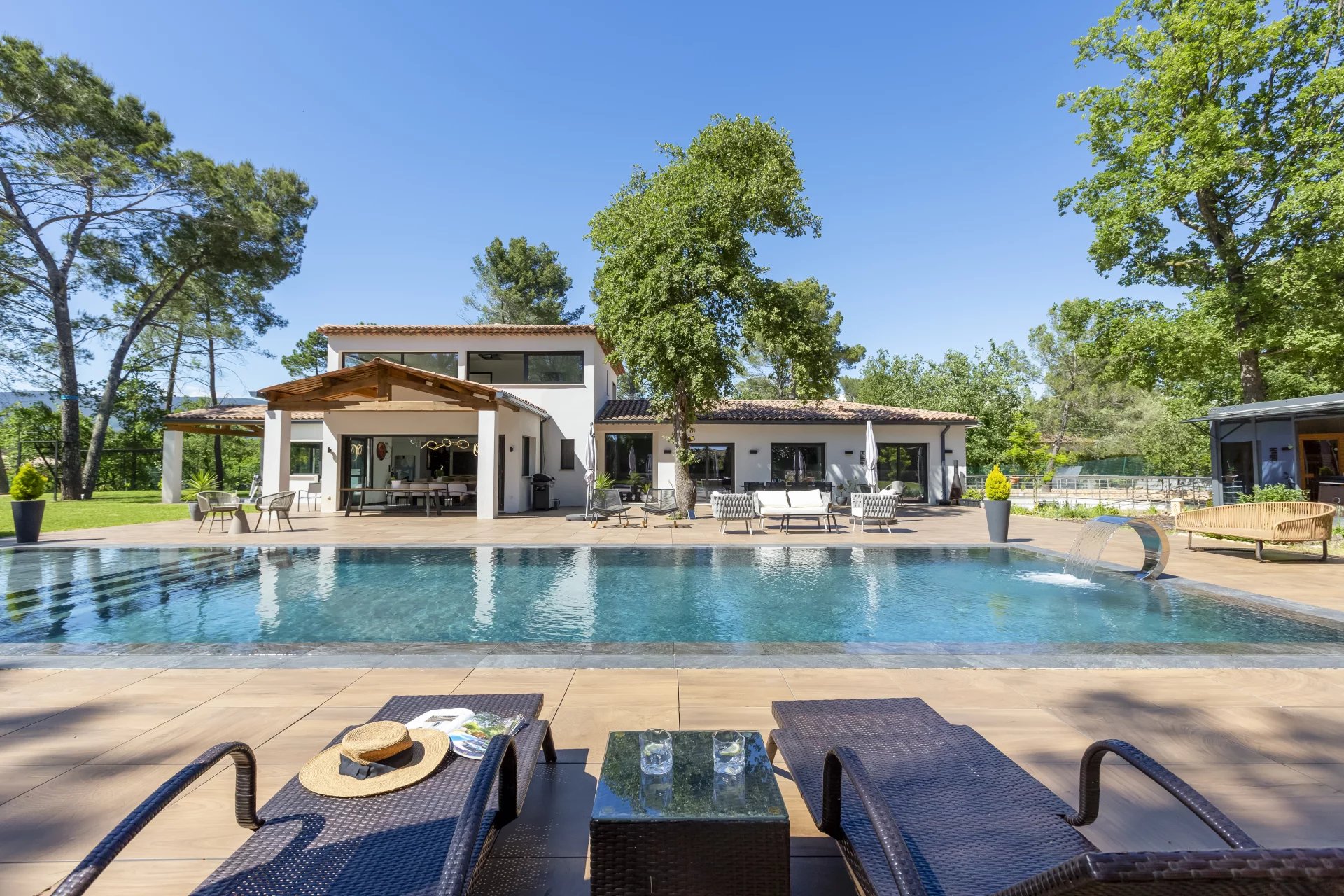 Located in a sought-after residential area, just steps from the prestigious Golf of Terre Blanche, this architect-designed contemporary villa, completed in 2023, embodies modern elegance in the heart of the Provencal countryside.