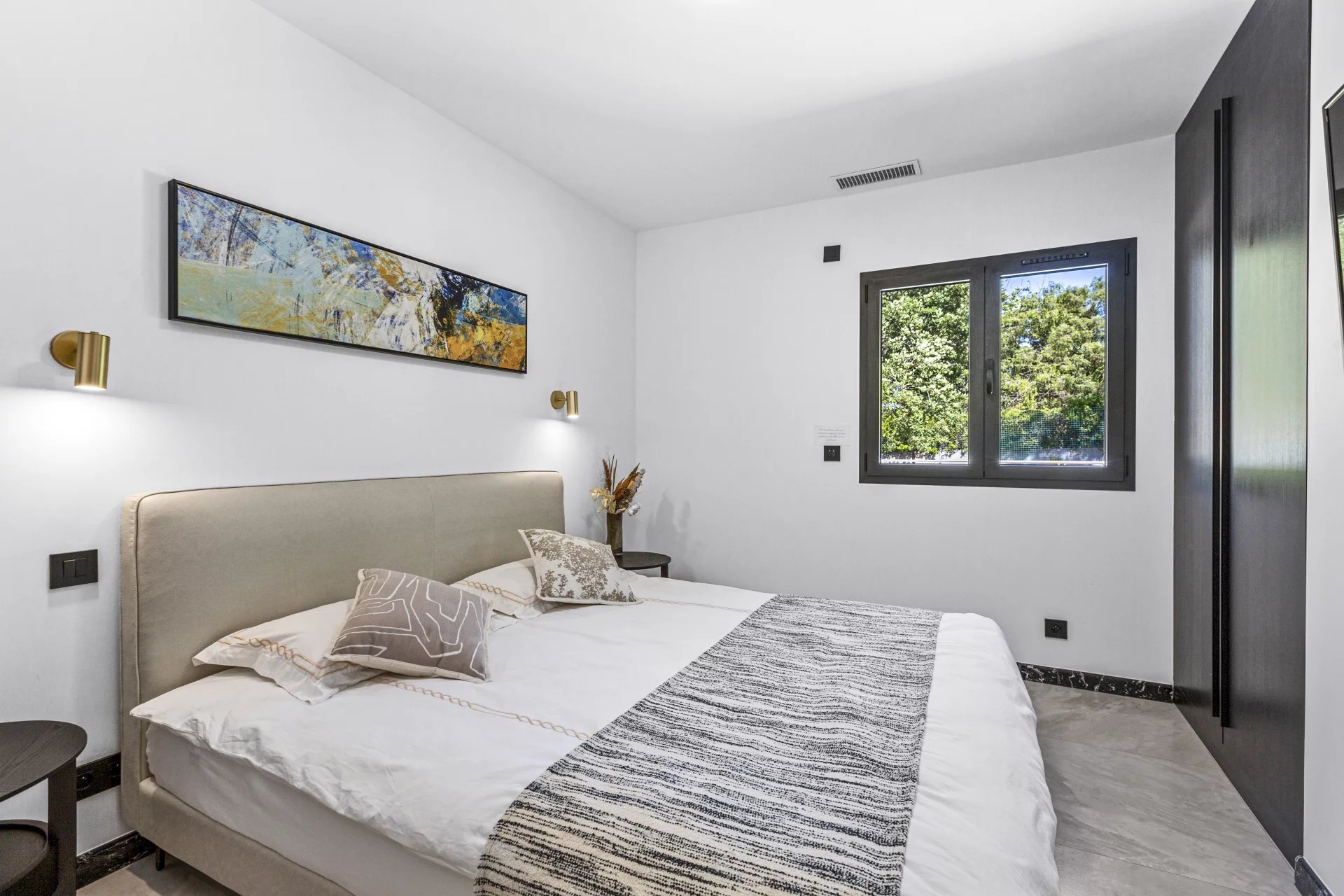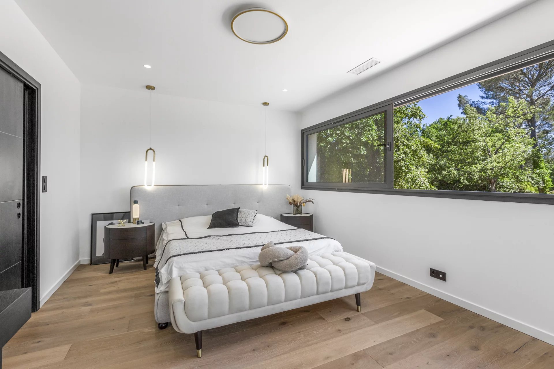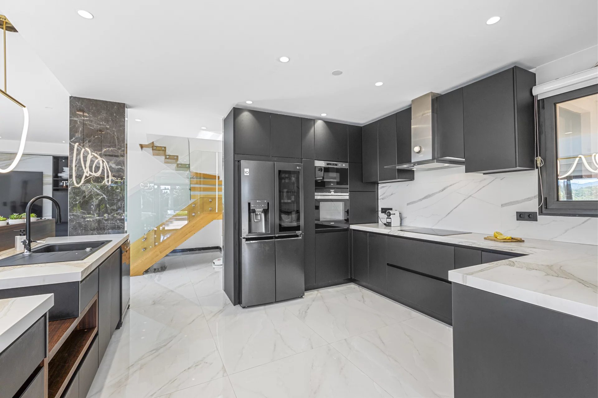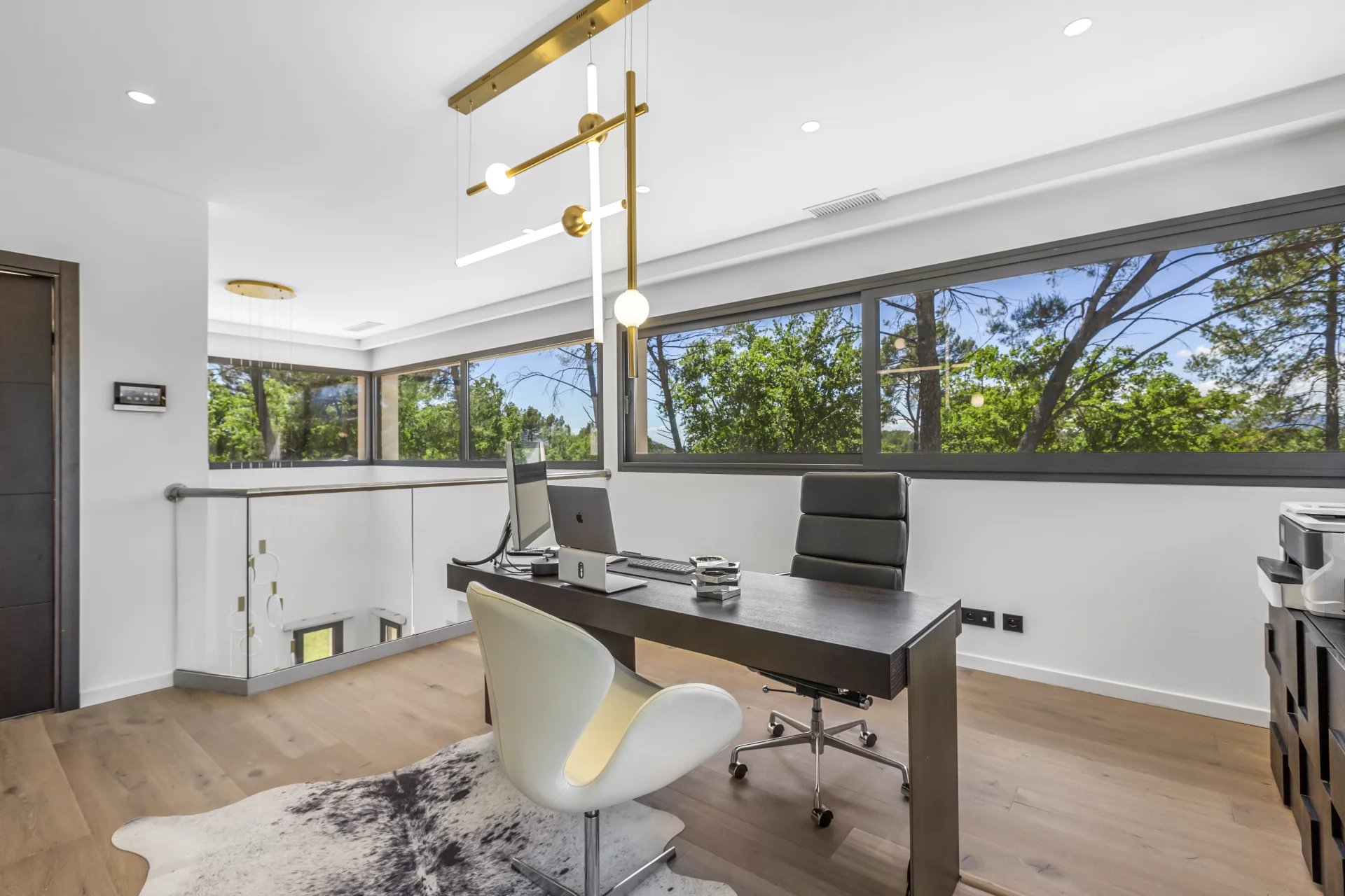 The designer wood and glass staircase leads to the upper floor, where you will find an office with a private terrace. From there you enter the master suite with a dressing room and bathroom, offering a peaceful retreat sheltered from view.