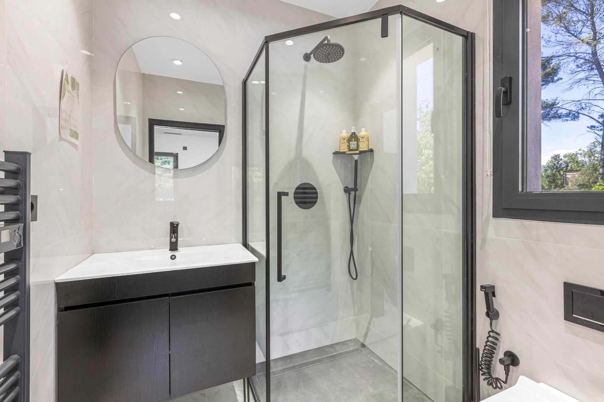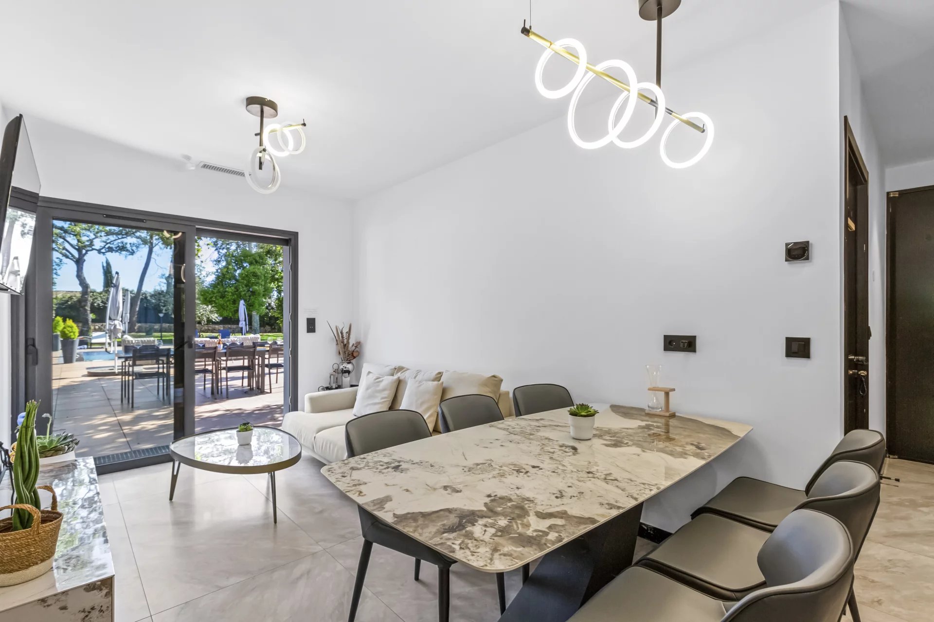 The entrance provides access to both wings of the house. In the main one, you will be charmed by the spacious living room. Bathed in natural light thanks to large picture windows, it benefits from high ceilings that enhance the sense of space and invite you to relax. Adjacent to it, the dining room and the fully equipped high-end kitchen open onto a covered terrace, perfect for gatherings. A bedroom with its own bathroom completes this level.