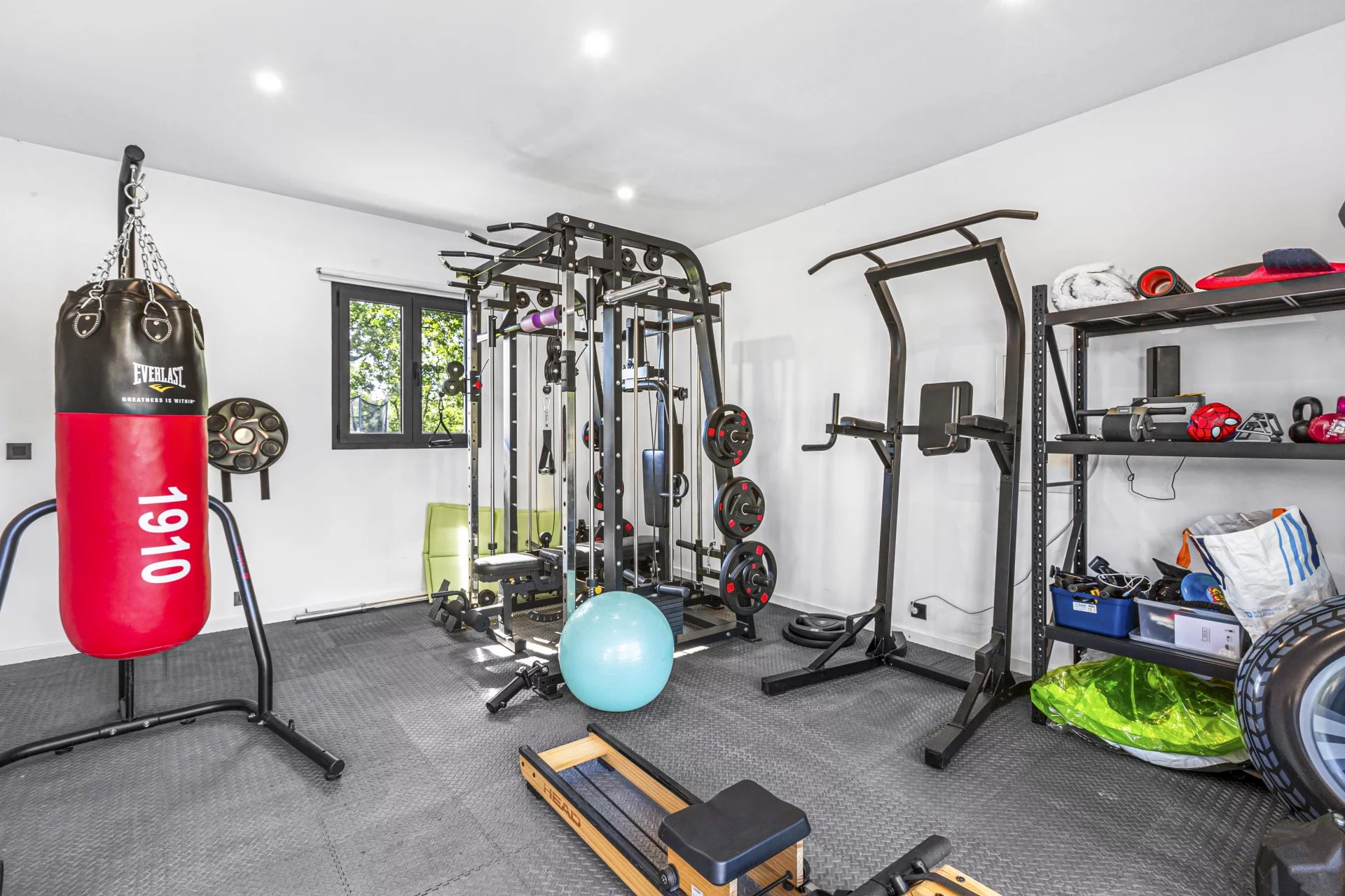 The magnificent 15 x 5 m saltwater mirror pool is the central feature of the garden, around which you will enjoy the summer. Too cold to swim? The jacuzzi and sauna are there for you. A gym, carport, and large courtyard with space for several vehicles complete the property.