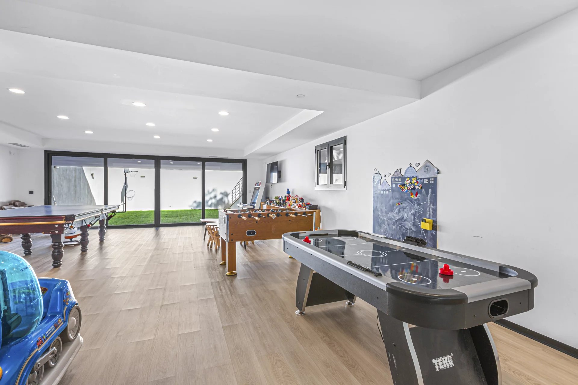 On the lower level, you will find a games room, a home cinema, a laundry room, an interior courtyard with a basketball hoop, as well as a sixth bedroom with a bathroom.