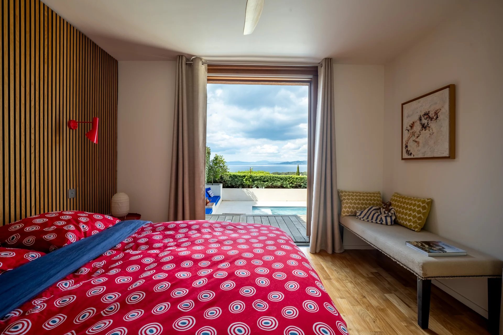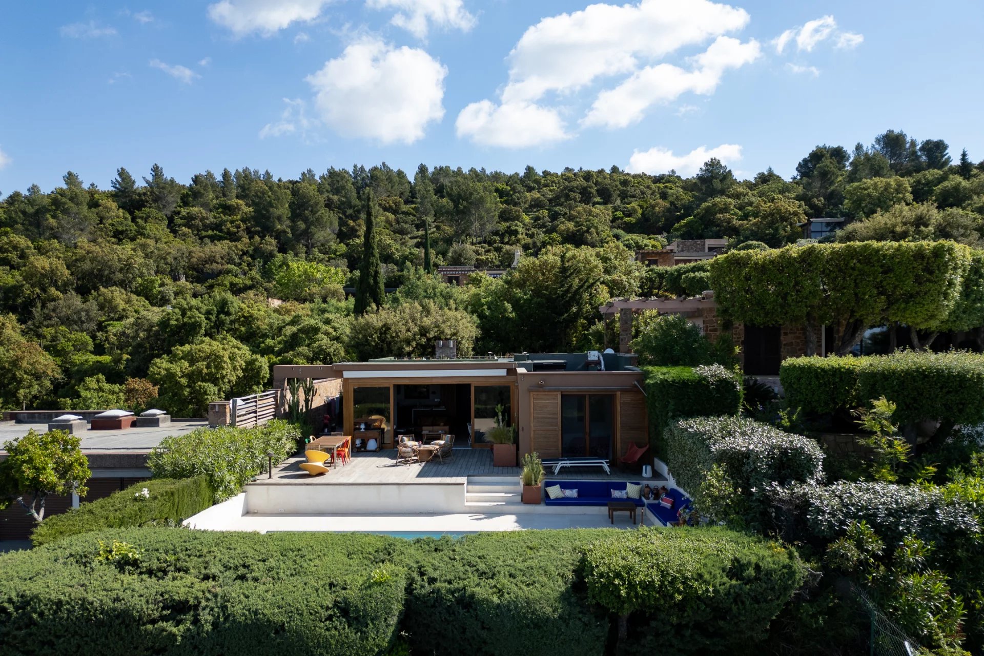 This modernist, integrated architecture, ideally located in the prestigious estate in Saint-Raphaël, faces the sea. Combining comfort, elegance and quality, this 95 m2 house has been completely renovated in keeping with the original architectural codes of this estate, reminiscent of those of Gaou Bénat, offering perfect integration into its natural surroundings.