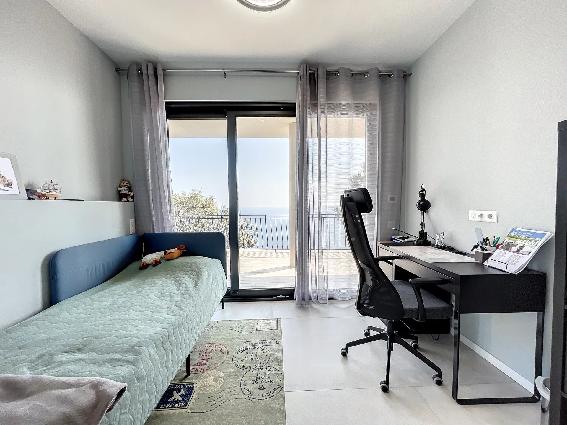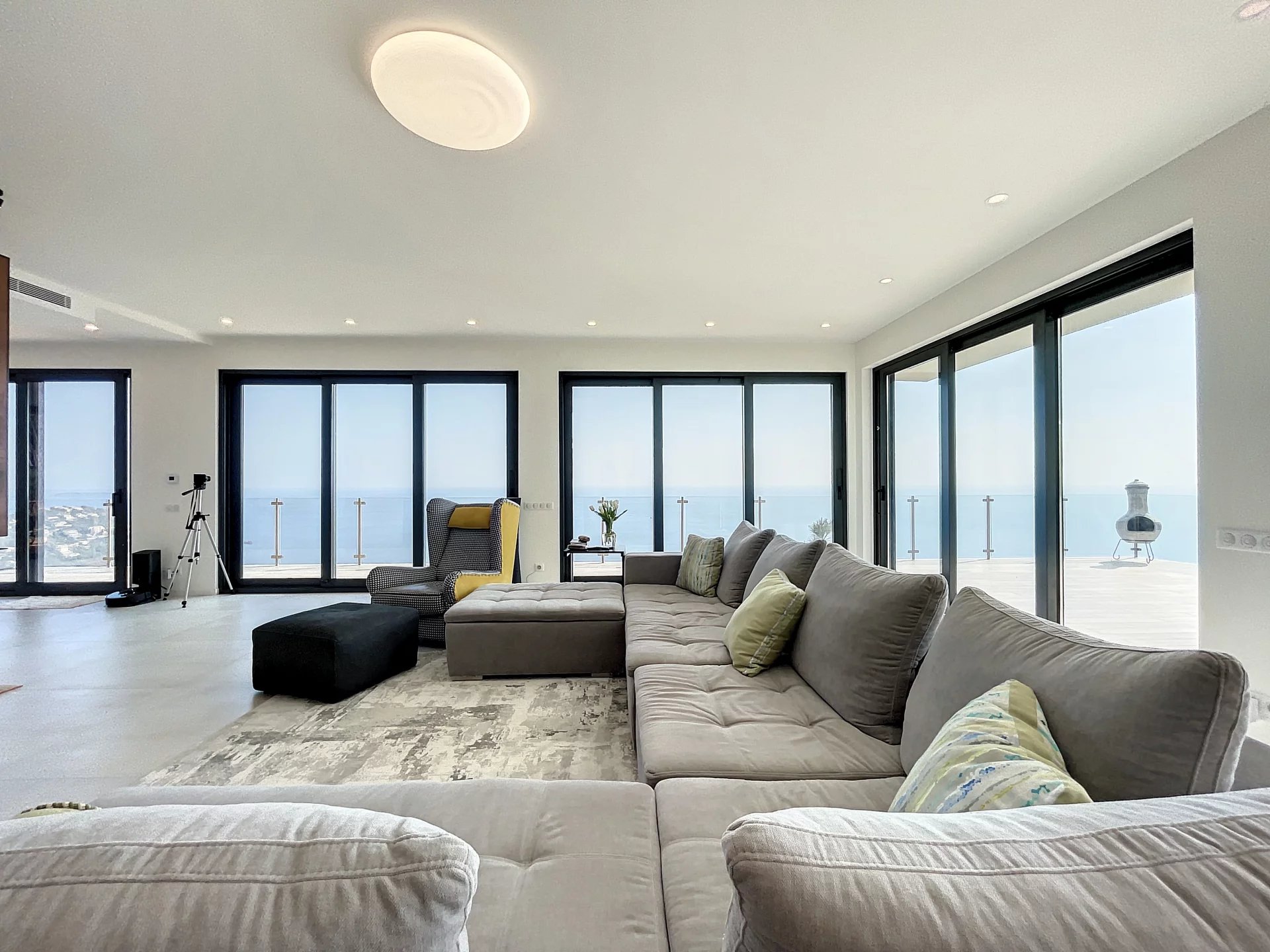 Built on 2 levels, the villa is composed on ground floor of a large living room with chimney, and an open plan and all equipped kitchen with a dining area and cellar, all opening onto a large terrace offering an amazing sea view.