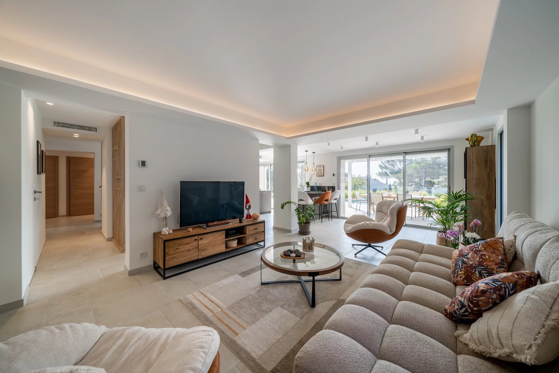 Set in a quiet location, with a plot of over 1,000 m2 featuring a large terrace with bioclimatic pergolas and a saltwater swimming pool,.
