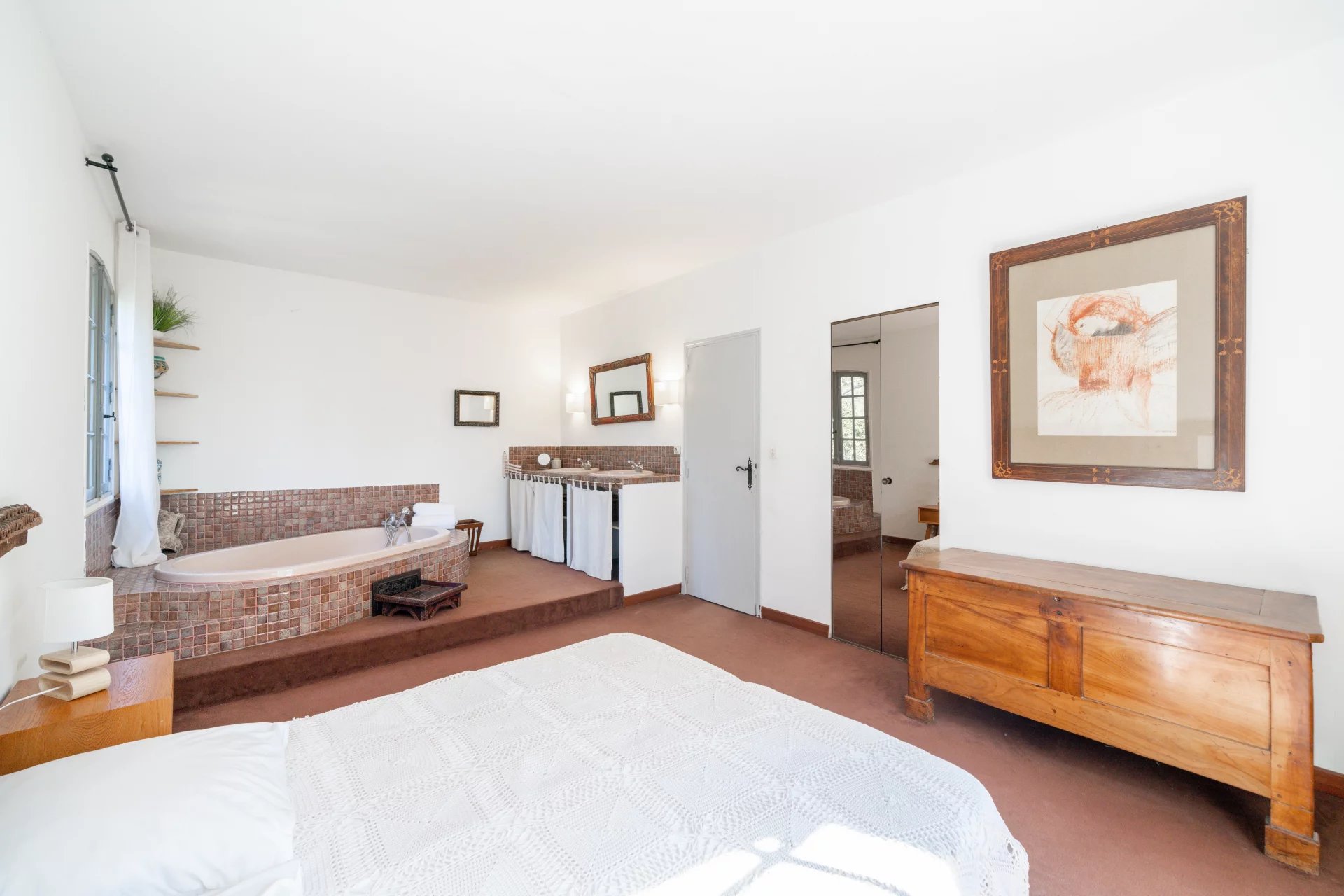 – Upper half-floor: 1 bedroom with an open-plan bathroom, 1 additional bedroom, and a shower room.