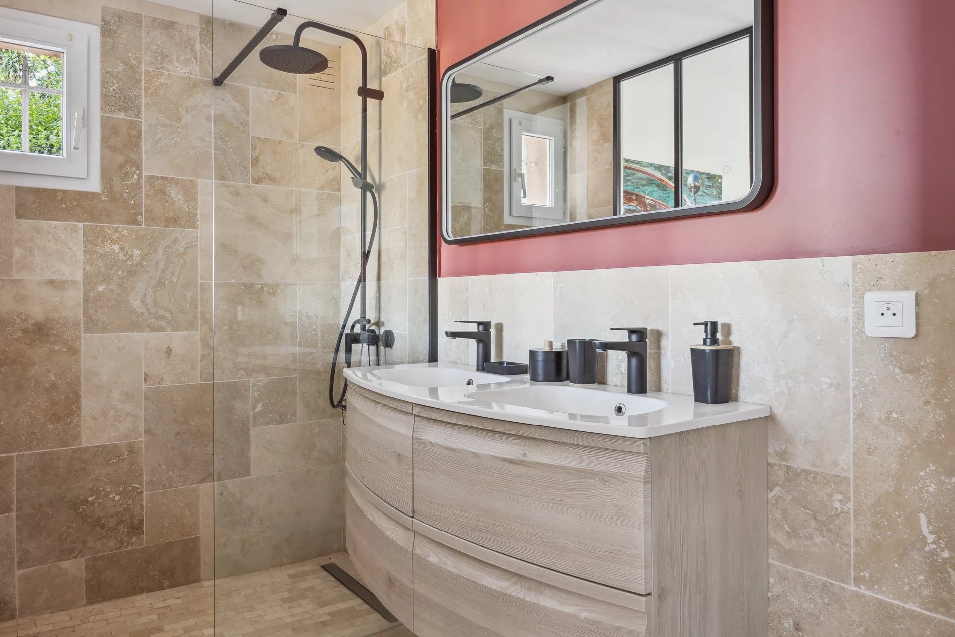 The first part of the villa includes a vast living/dining room opening onto a terrace, an equipped kitchen, a laundry room, 4 bedrooms including 2 master suites.