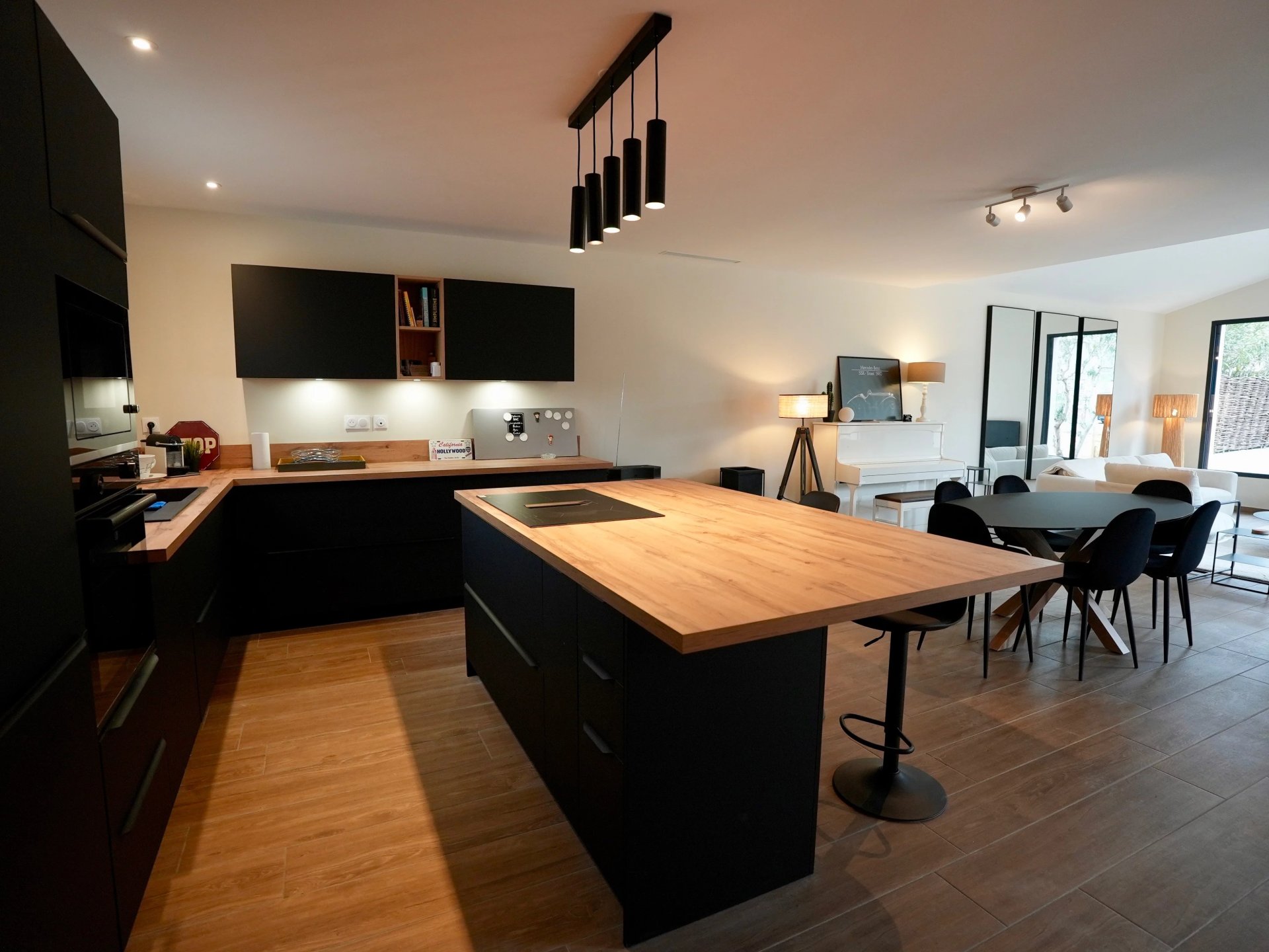 Set on a plot of approximately 500 m2, the property offers around 130 m2 of living space with bright, open volumes. The ground floor features a spacious living area with lounge, dining room, and an open-plan kitchen with central island, all opening onto the terraces and the garden. A comfortable master suite with shower room completes this level.