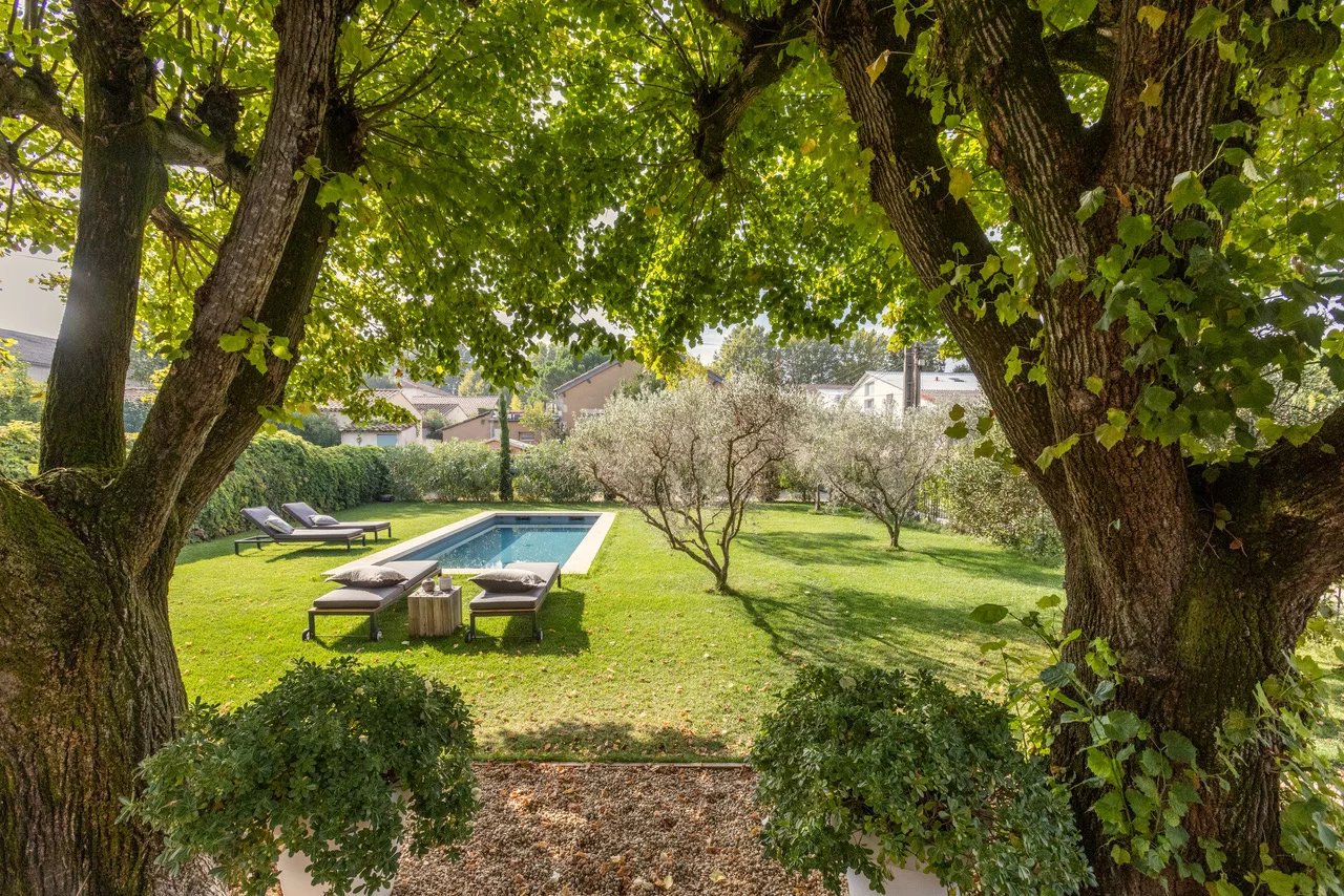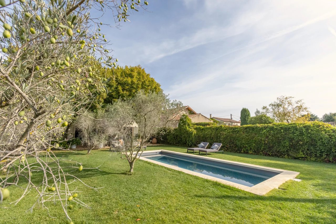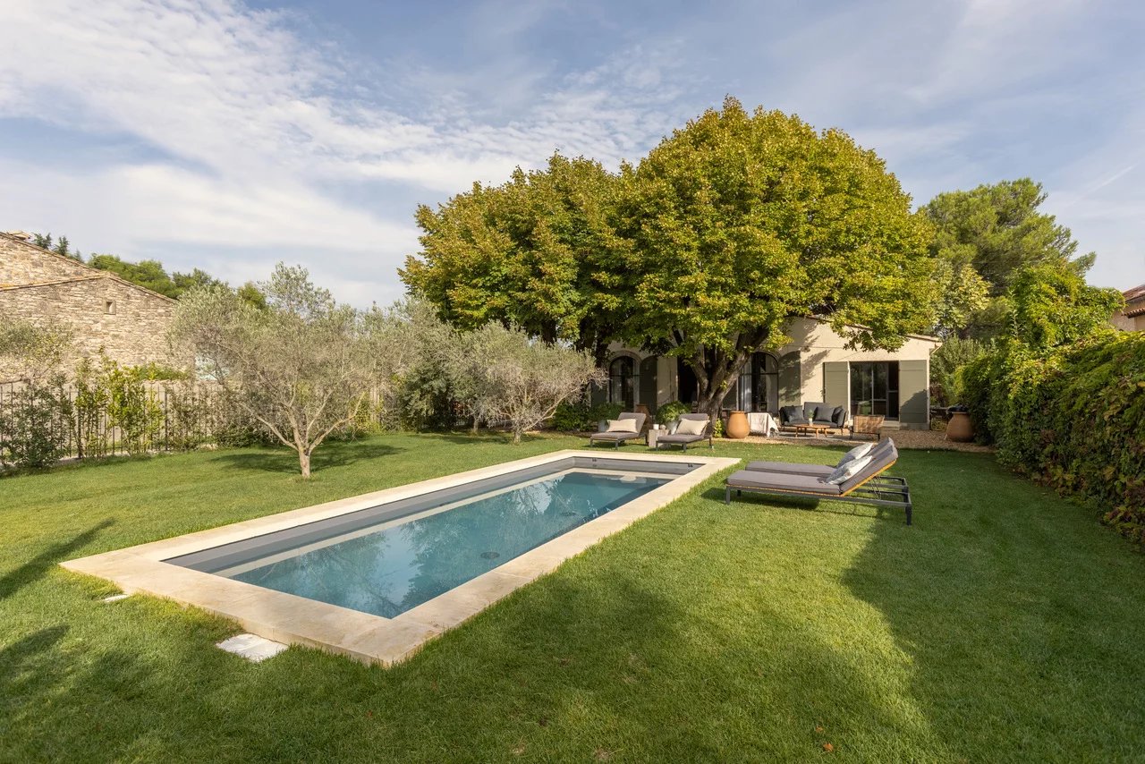 Just a few steps from the center of Saint-Remy, this villa of approximately 100 m2 (1,000 square feet) offers an intimate and refined setting in the heart of a 600 m2 (6,400 square foot) enclosed landscaped garden adorned with a pool.