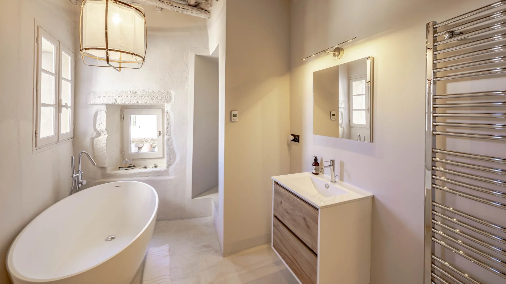 A lift serves all floors up to the top level, where there is a second sitting room that opens onto an outdoor area with a heated plunge pool. This very private terrace offers superb, unobstructed views over the village and the Alpilles. The four well-proportioned bedrooms are light and bright with tastefully appointed bathrooms, whilst the main living area is on the ground floor and comprises the dining room, kitchen and sitting room, as well as an inner courtyard – a charming, intimate retreat.